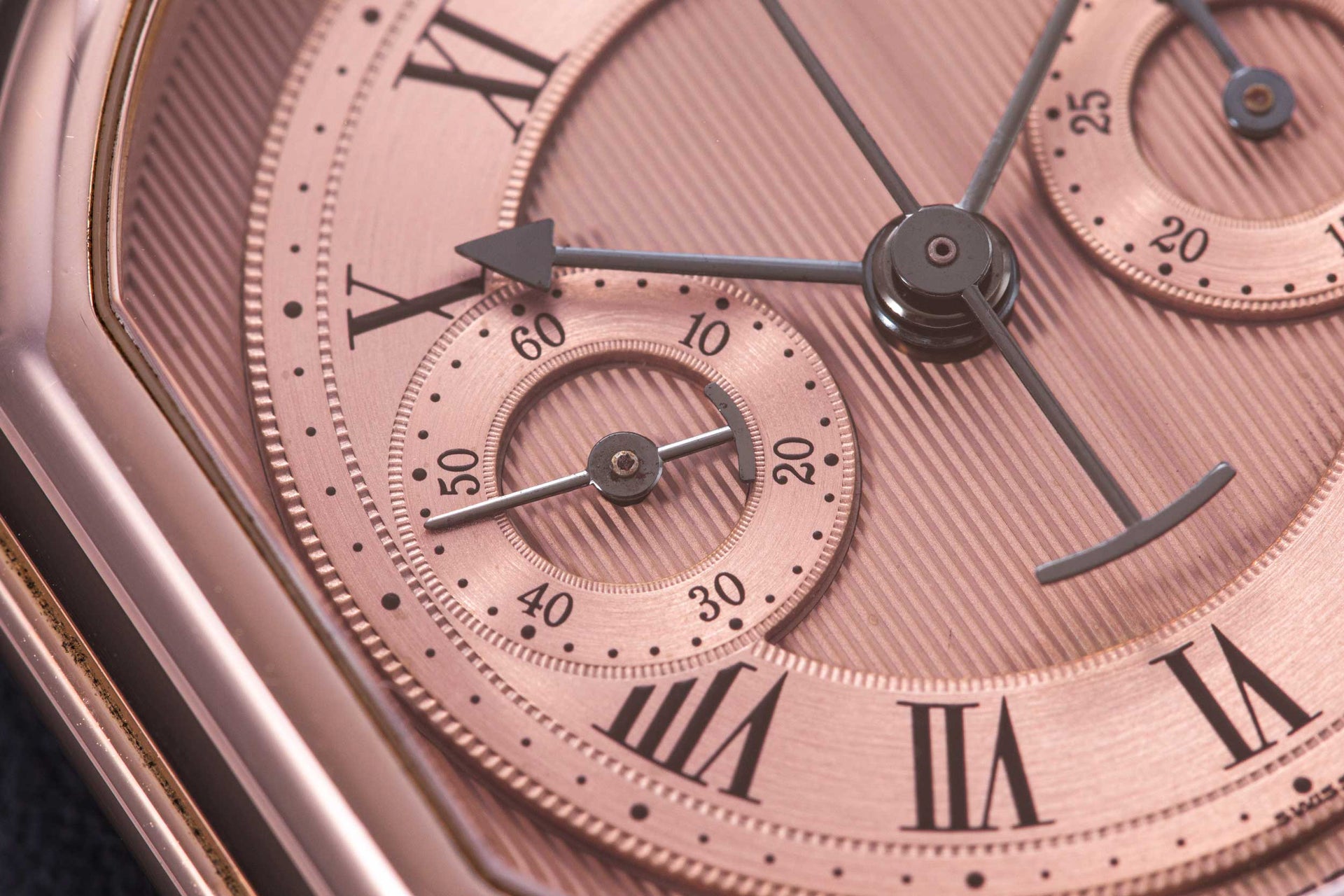 Following his arrangement with Asprey, Roth introduced the twin-register manually wound chronograph in 1990. Integrating the Lemania ébauche 2320 – a natural choice for the watchmaker having previously used the 2320 in his early tourbillons, and during his stint at Breguet. Whilst seen with Clous de Paris guilloché dials, the majority of Roth’s early twin-register manually wound chronographs feature his signature pinstripe-patterned dials. Referred to within the manufacture as the reference 147, this pink on pink example is the rarest of Roth's bicompax chronographs.