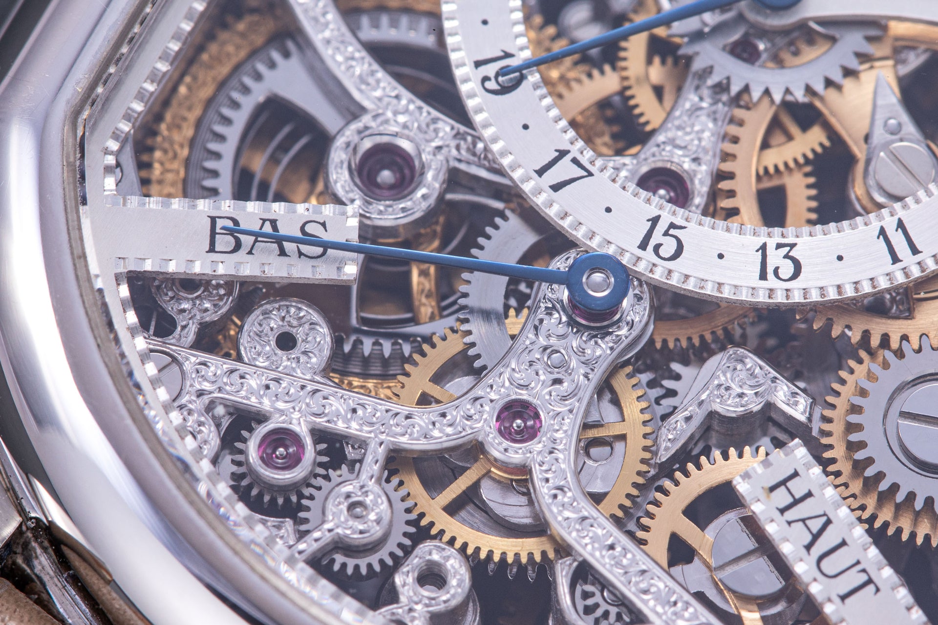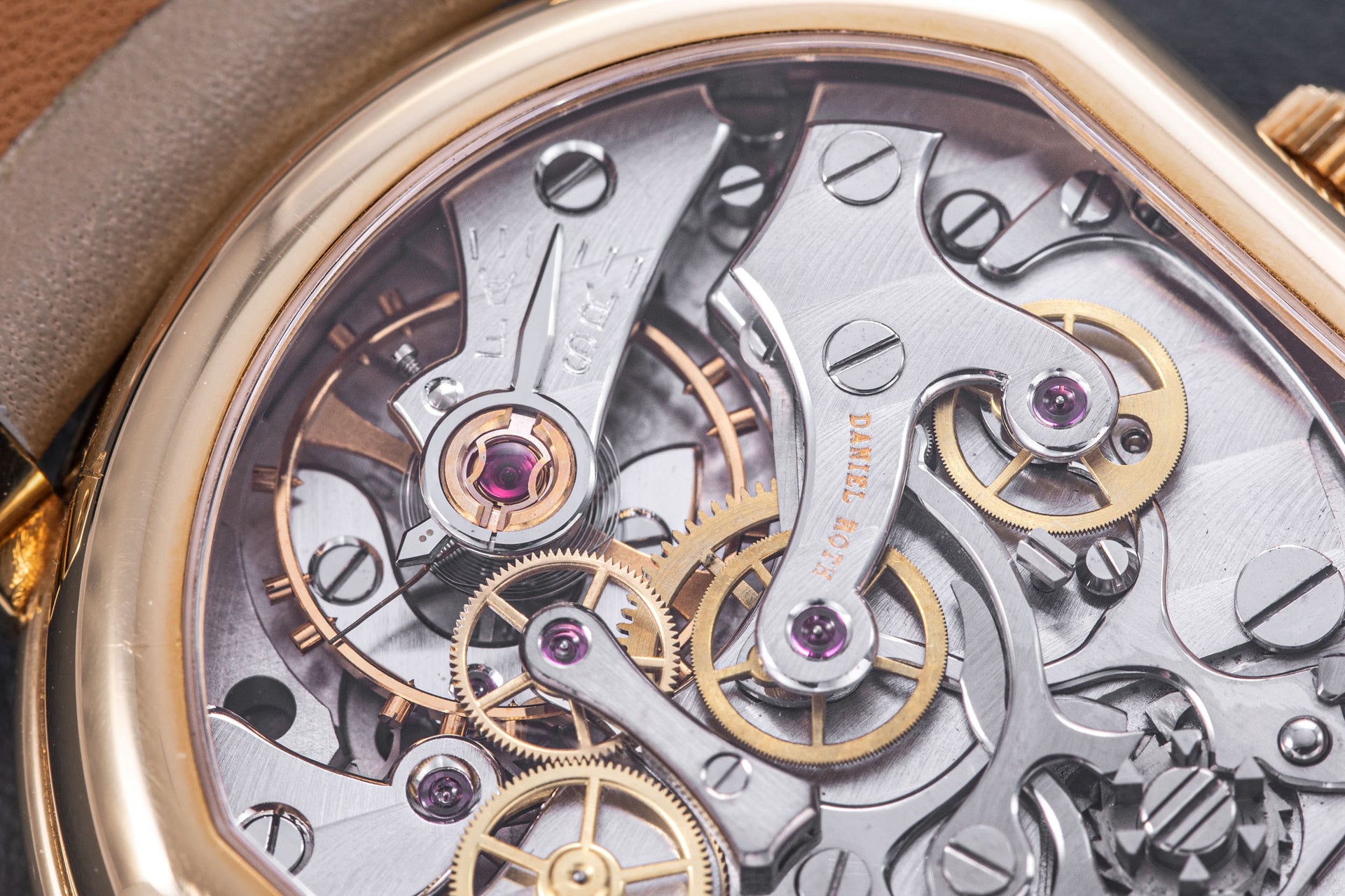The grande sonnerie calibre was launched in 1994 by Gerald Genta, combining the grande et petite sonnerie carillon on four hammers and gongs with a tourbillon and perpetual calendar, making it the most complicated wristwatch movement in the world at the time. The minute repeating movement, on the other hand, dates to 1981, when it was launched as the thinnest repeating movement ever. That said, the calibre found in this wristwatch is a later movement after the original was re-engineered to improve its robustness.