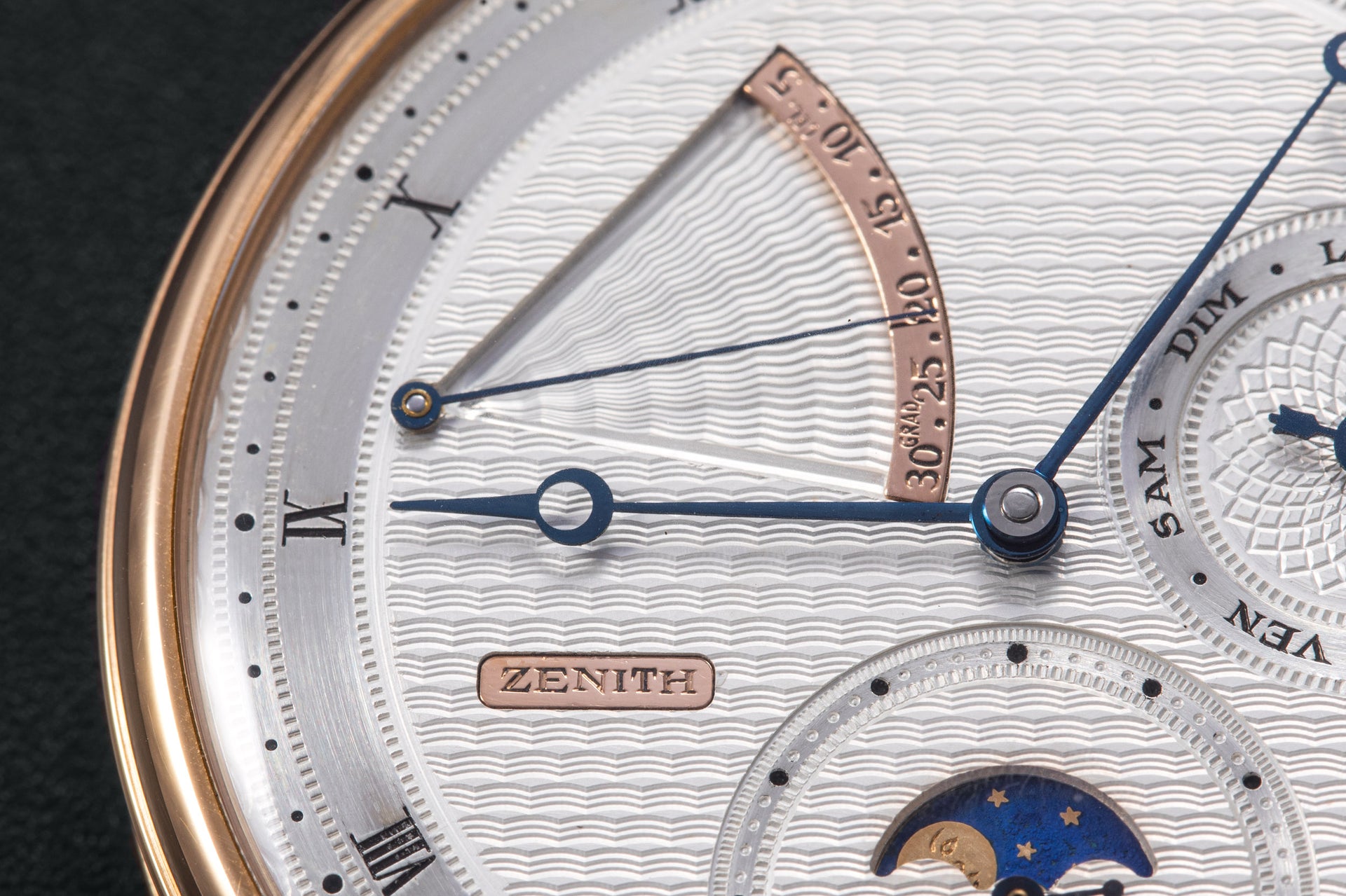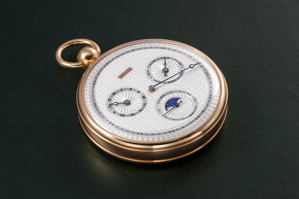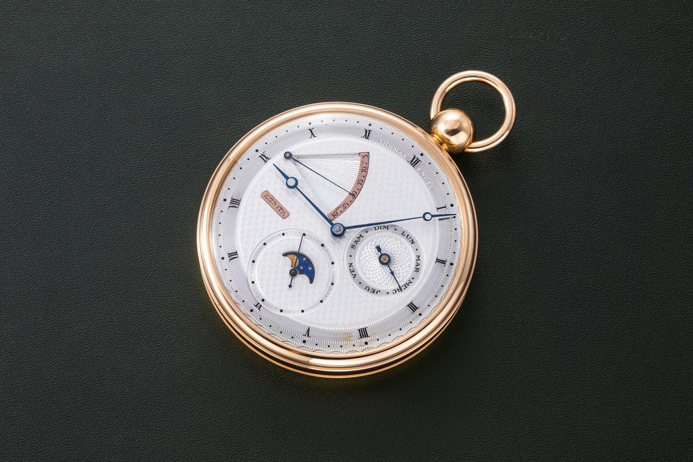 Produced with the help of Swiss watchmaker Richard Daners, the pocket watches were often powered by the Zenith 5011K, a prize-winning observatory chronometer movement, but substantially modified to incorporate various complications. This example, an 18k yellow gold open-faced keyless lever watch with moon-phases.