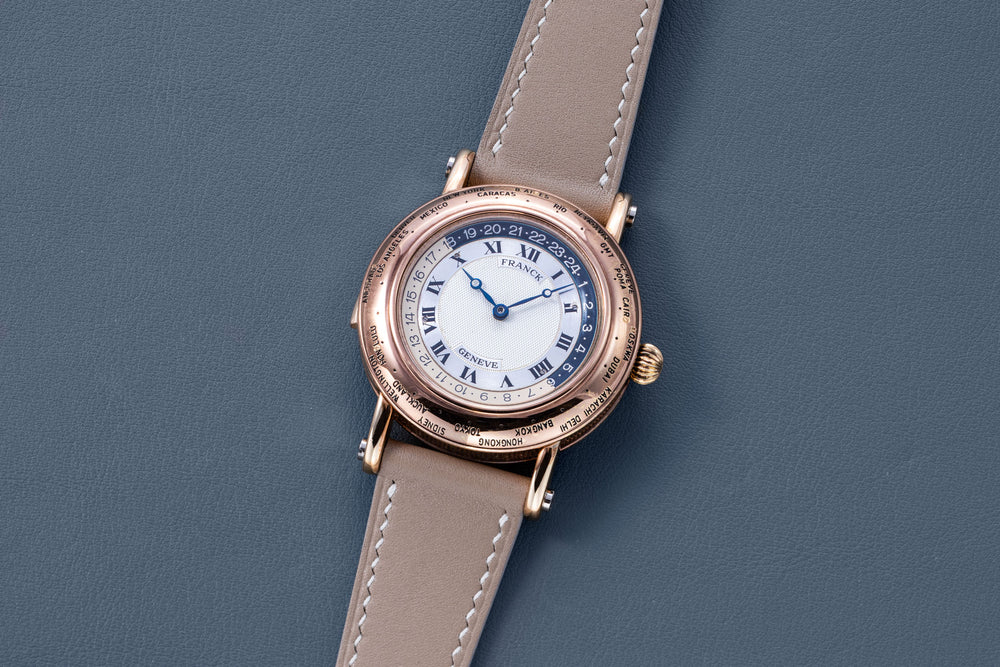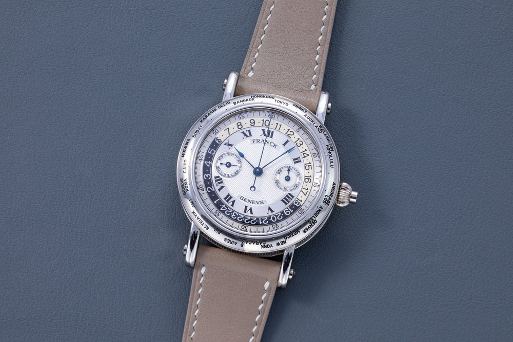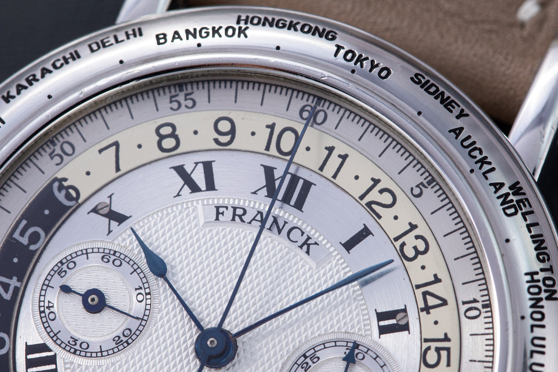 Possibly arising from his work restoring vintage Patek Philippe world time watches, Franck Muller created several types of world-time wristwatches, often combining the Louis Cottier-style world time with other complications.