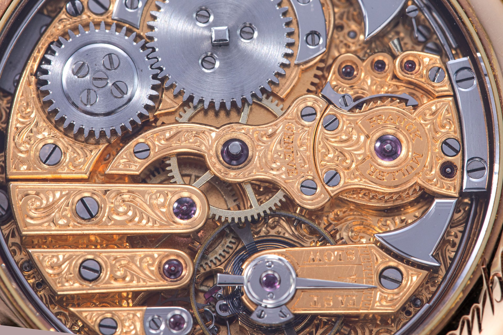 In 1984, Muller debuted a tourbillon wristwatch, and soon followed with a variety of complicated wristwatches in quick succession, often building additional functions on restored 19th century movements. Much of his work was inspired by historical complications but reimagined for the modern day. One of his signature reinventions was the double-face chronograph that features an oversized seconds counter on the reverse of the watch, a complication once found on pocket watches but forgotten until revived by Muller.