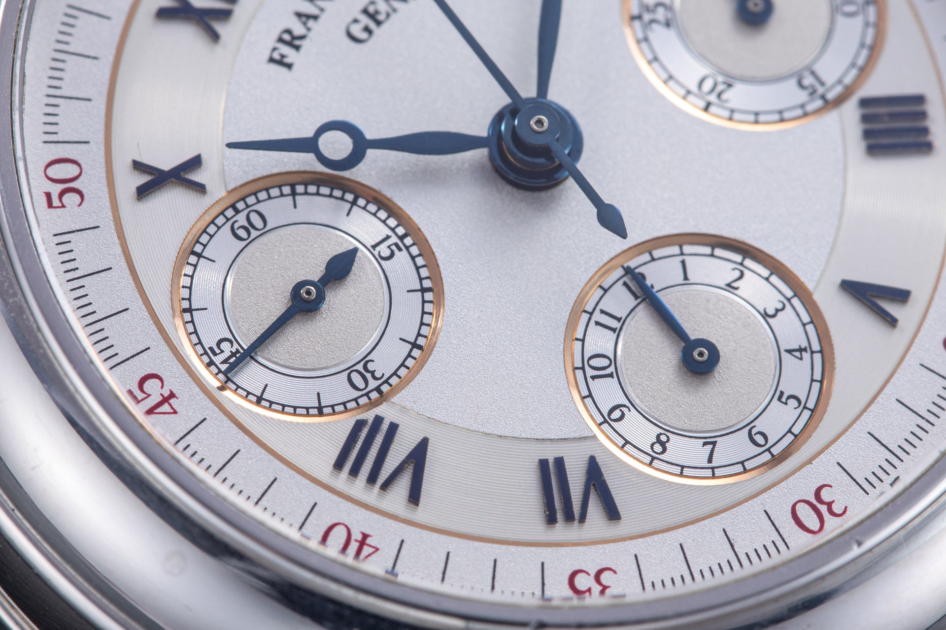 One of Franck Muller’s most popular complications was the double-faced chronograph, which had an extra-large seconds hand on its back, where instead of a case back sits a multi-scale dial. Ingenious yet surprisingly simple, this required only an extra-long pinion for the secondary hand to mirror the hand on the front dial. While Muller debuted the idea in modern-day wristwatches, the double-face chronograph was also found on antique pocket watches, which more often used the reverse face for a calendar display.