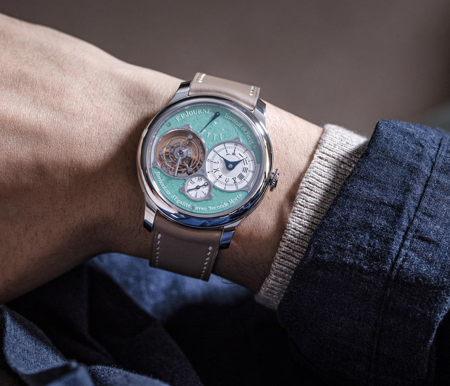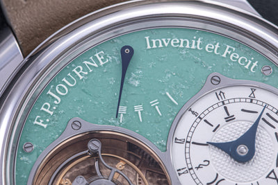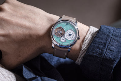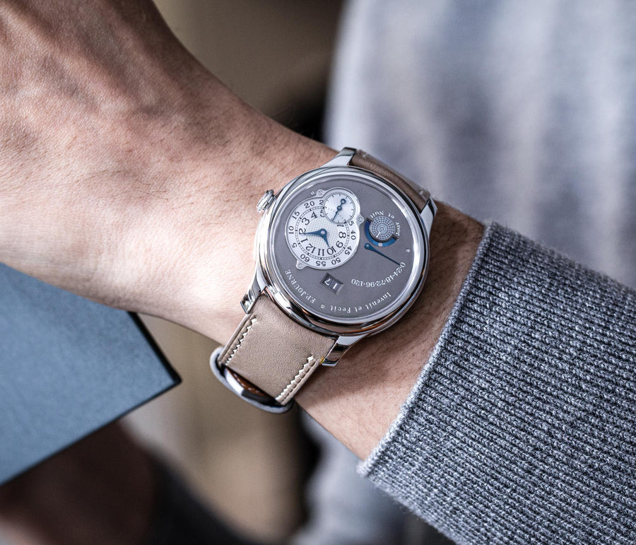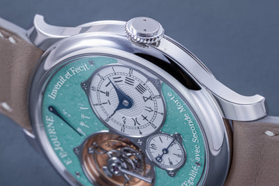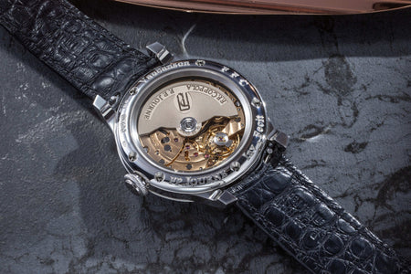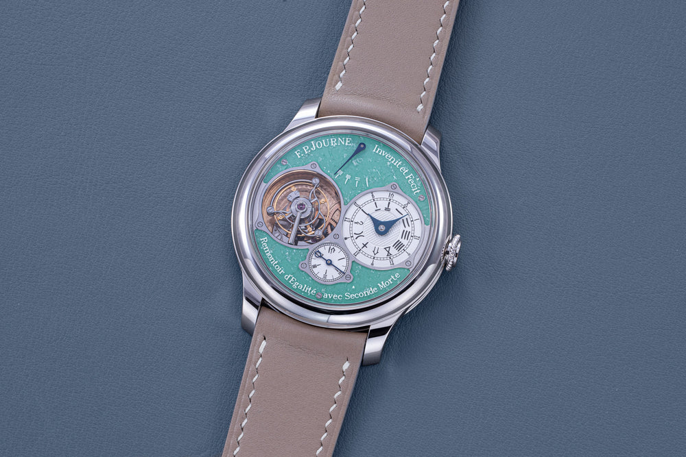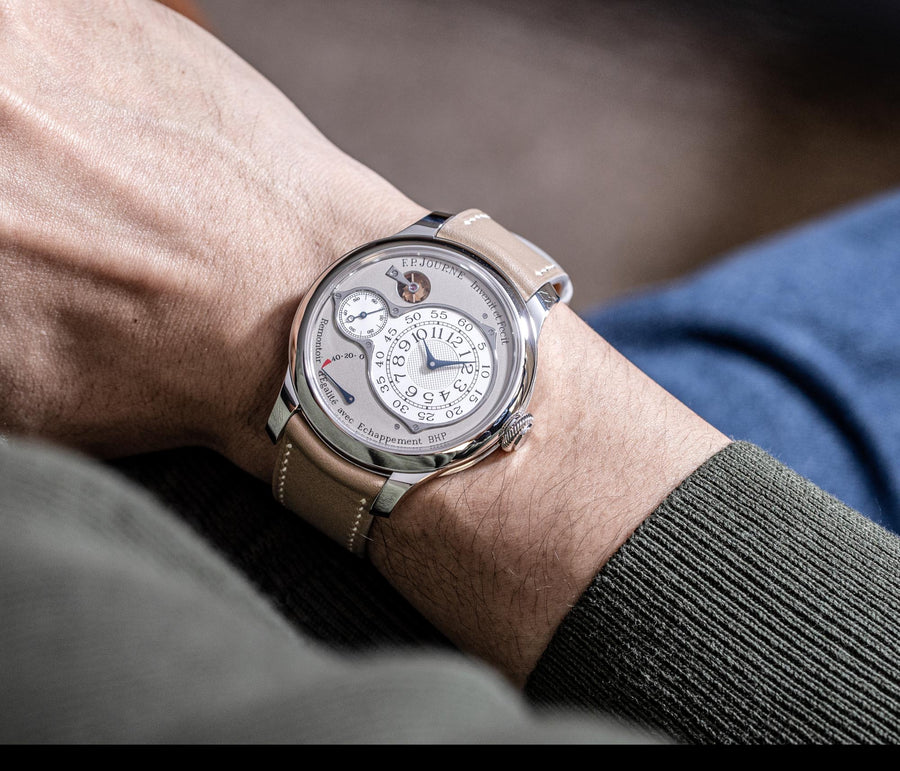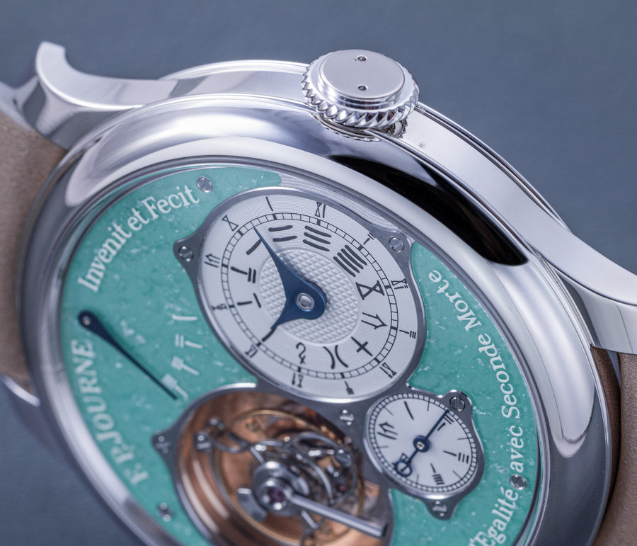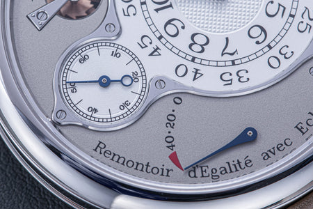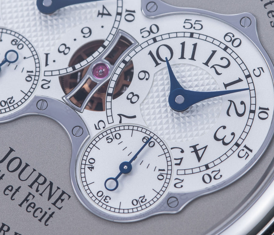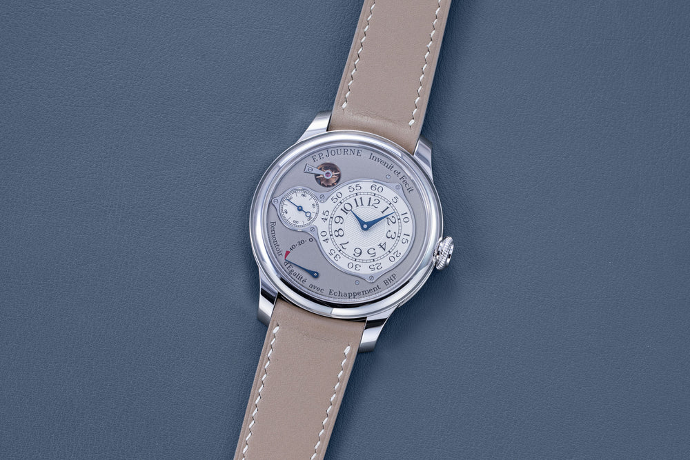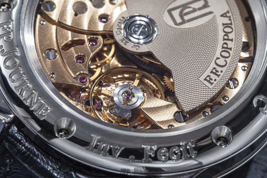 The production version of the original FFC Blue created for the 2021 edition of the Only Watch charitable watch auction. Fascinated by an F.P.Journe Chronomètre à Résonance gifted by his wife Eleanor, the acclaimed director invited Journe to his Napa Valley winery. Following discussions on how our ancient ancestors indicated the time, Journe set to work in 2014 on creating a watch that employs finger-counting, also known as dactylonomy, to show hours and a rotating disk on the dial periphery to show the minutes.