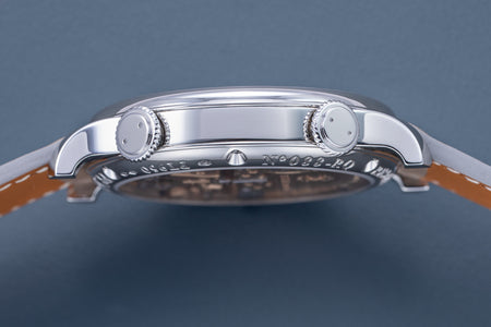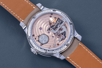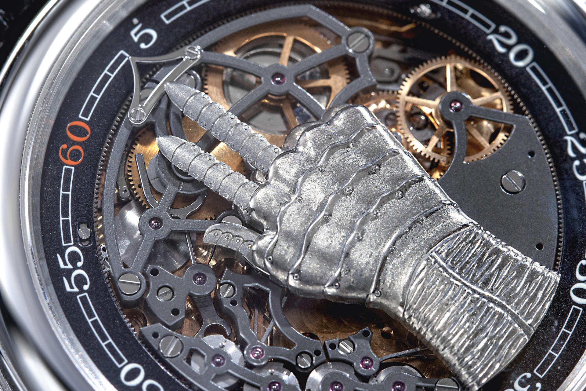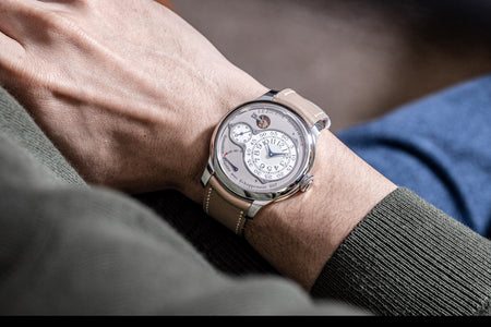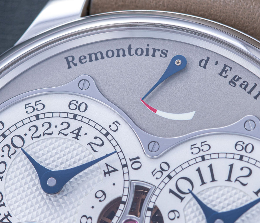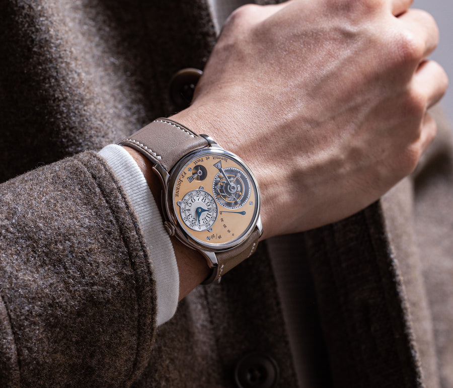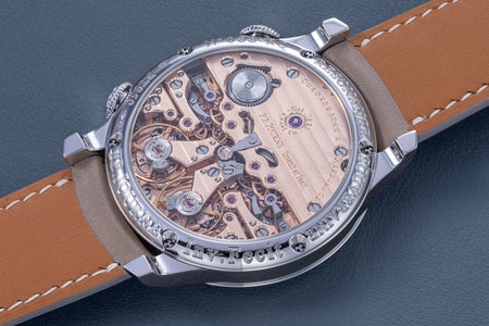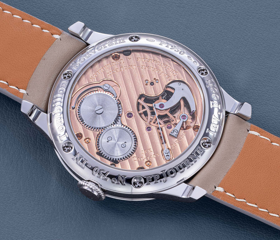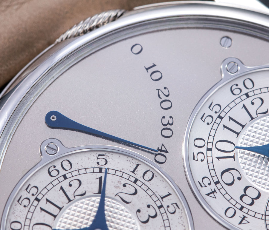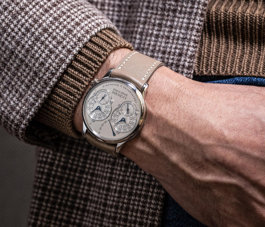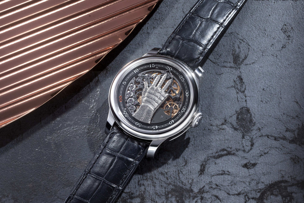 The production version of the original FFC Blue created for the 2021 edition of the Only Watch charitable watch auction. Fascinated by an F.P.Journe Chronomètre à Résonance gifted by his wife Eleanor, the acclaimed director invited Journe to his Napa Valley winery. Following discussions on how our ancient ancestors indicated the time, Journe set to work in 2014 on creating a watch that employs finger-counting, also known as dactylonomy, to show hours and a rotating disk on the dial periphery to show the minutes.