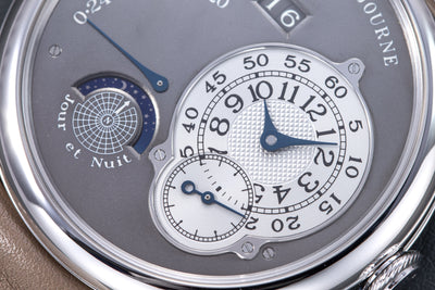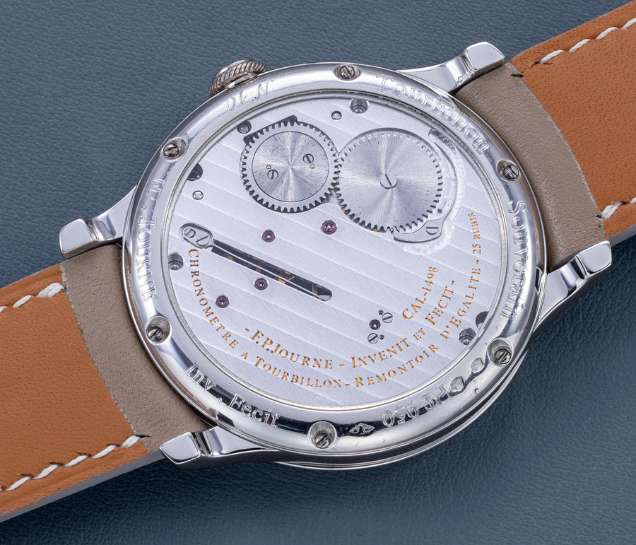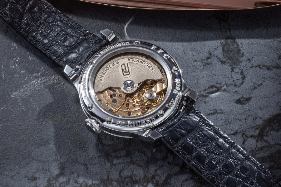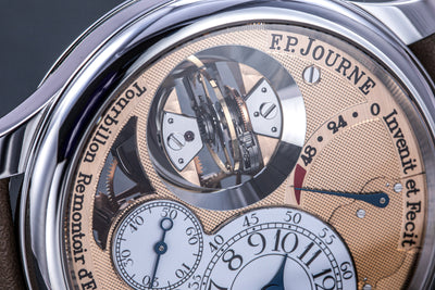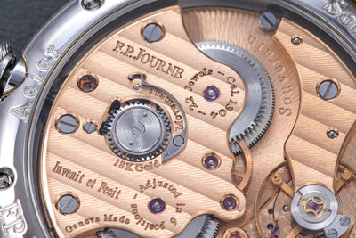 To commemorate the transition from brass to solid red gold as the alloy of choice for its movement plates, F.P.Journe created the Ruthenium series, which was produced from 2001 to 2003. Made up of five models - each limited to 99 watches and sold individually - these had their dials and movement plates coated in ruthenium, resulting in a dark grey finish.