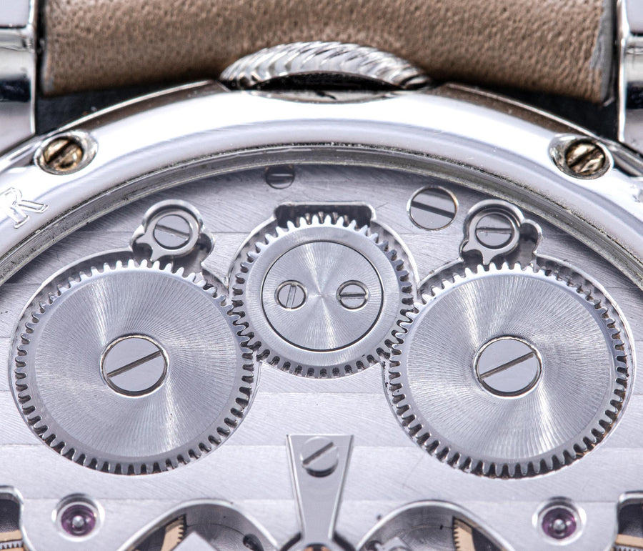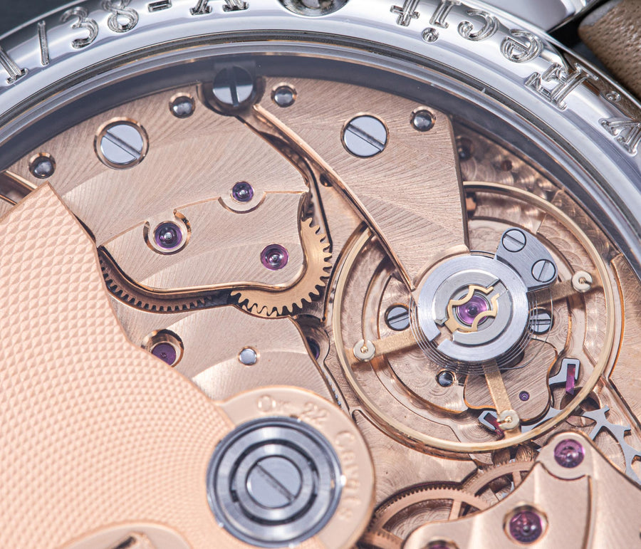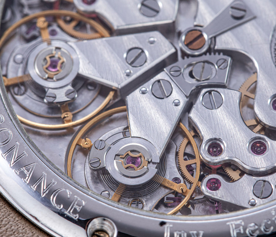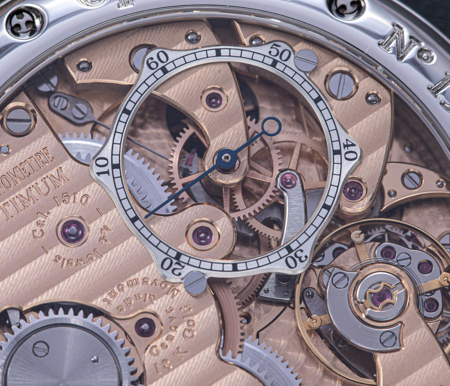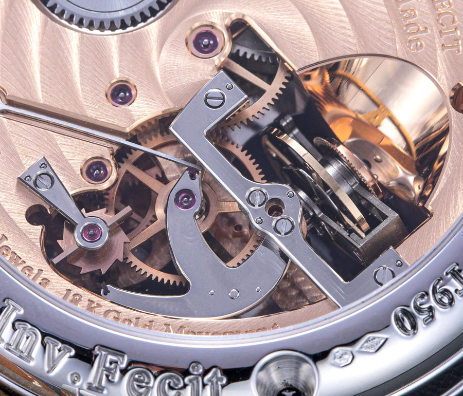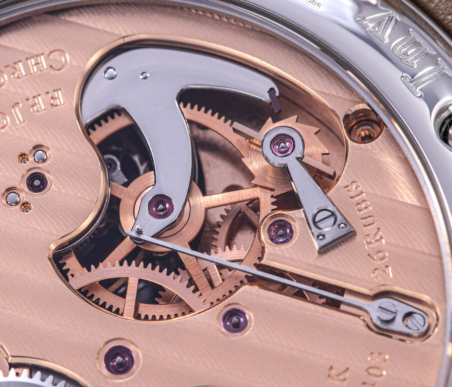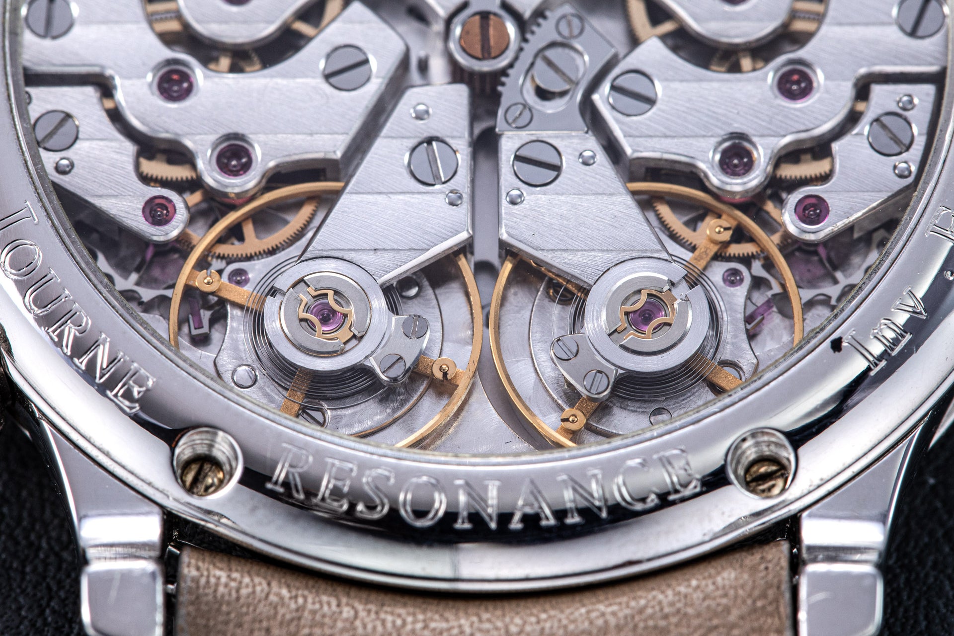 The new Chronomètre à Résonance has only one single barrel spring to provide power to the two movements. A differential placed on the first wheel, visible in the centre of the dial, transmits the energy of the barrel spring towards the two independent secondary gear trains. Each secondary gear train is equipped with a remontoir d’égalité of a frequency of 1 second. Working in such a way, the force received by the escapements remains linear and assures isochronism throughout 28 hours.