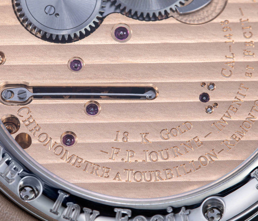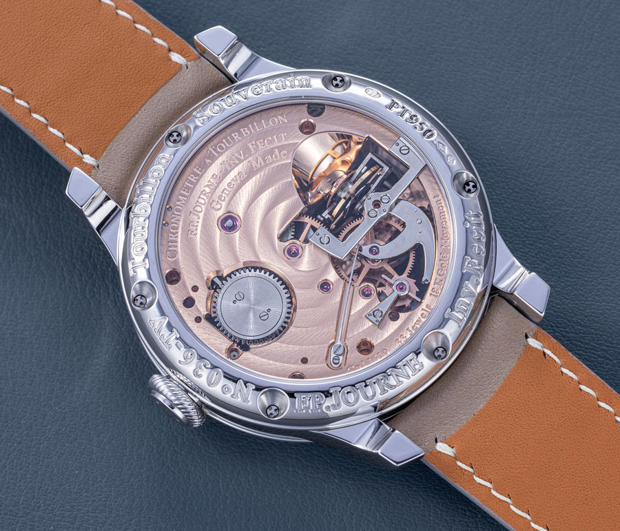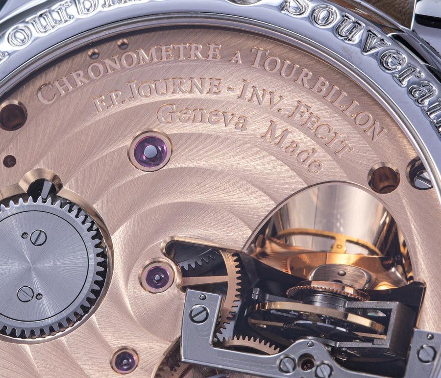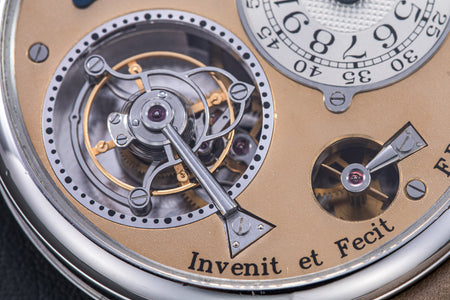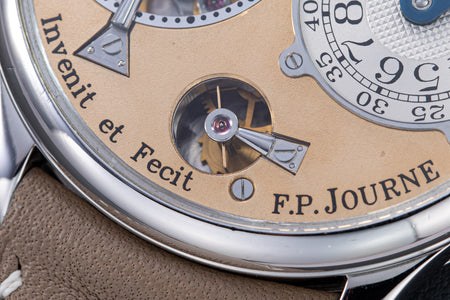 An example of one of the last Tourbillon Souverains produced, this execution reflects the evolution of the F.P.Journe 's brand from its founding in 1999. Though the mechanics are fundamentally identical to that in the Tourbillon Souscription of 1999, the Tourbillon Souverain has a greater degree of refinement in its finish and materials, illustrating the strides the brand has made in developing its own production capability. While the Souscription Tourbillon had its bridges and plates made of brass, this has them in solid red gold. And instead of brass as the dial, this platinum 40 mm example has Chinese Oracle Bone Script on an Adventurine stone dial produced in the dial factory Cadraniers de Genève owned by F.P.Journe since 2016.