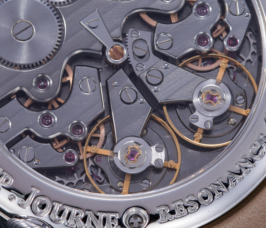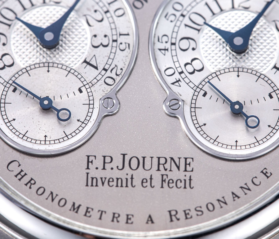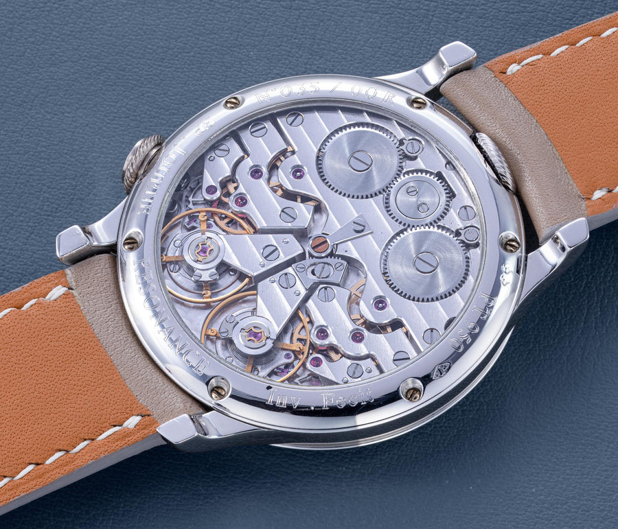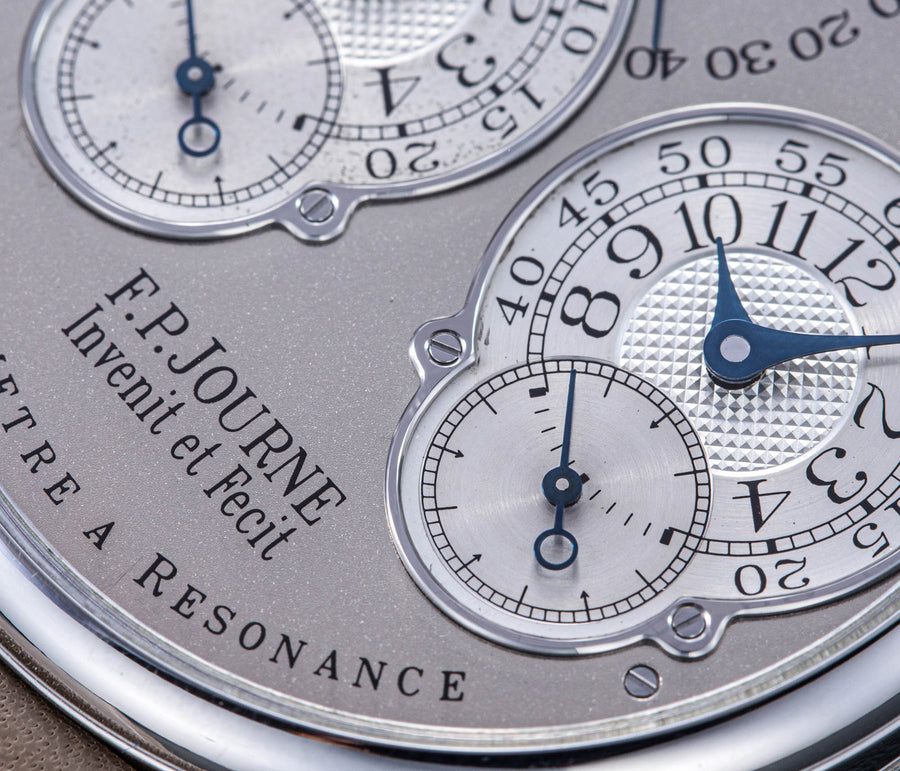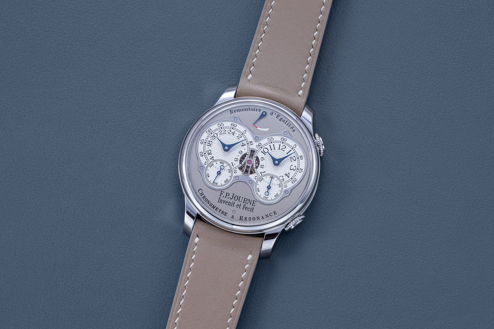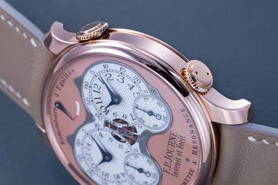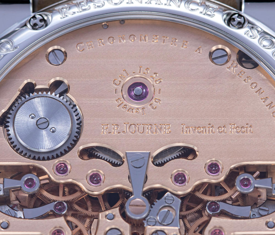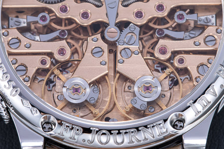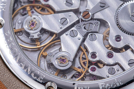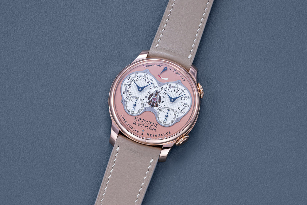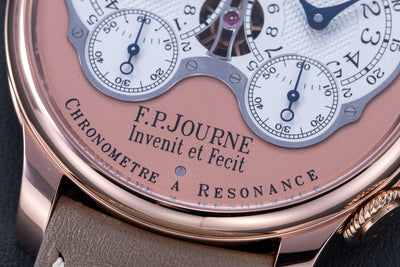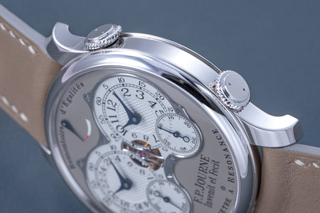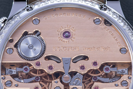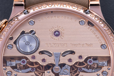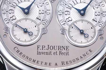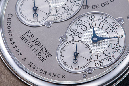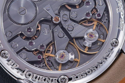 Launched shortly after the 1999 Tourbillon Souscription, the Chronomètre à Résonance is perhaps Journe’s most ingenious wristwatch. Inspired by Antide Janvier's 19th century double-pendulum clocks that were built to function on the principles of resonance, the movement has twin balance wheels that beat in sync, relying on the air within the case and the movement bridges to transmit the subtle vibrations that allow them to operate in resonance.
