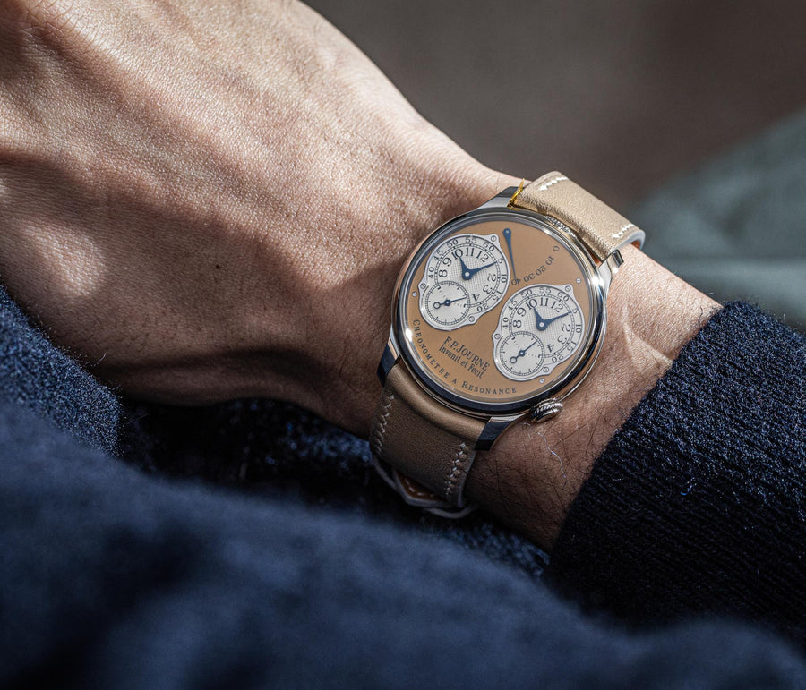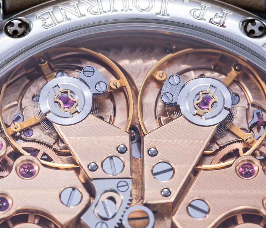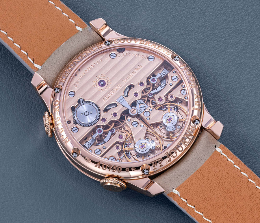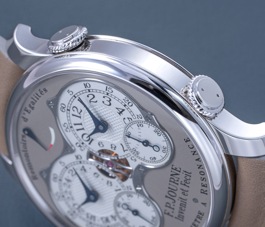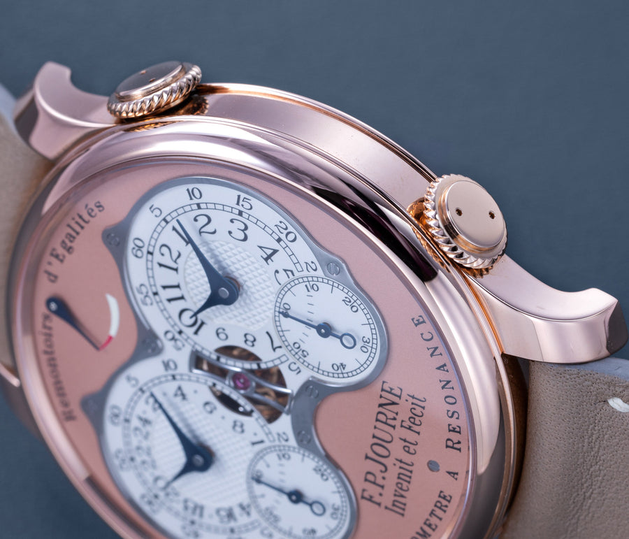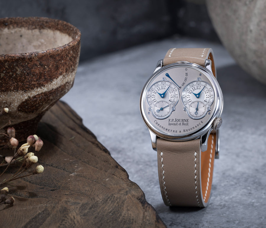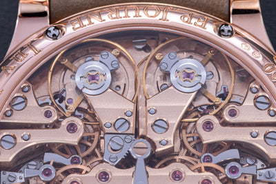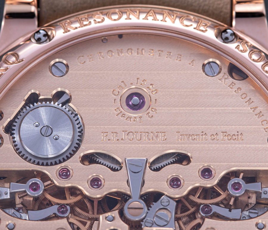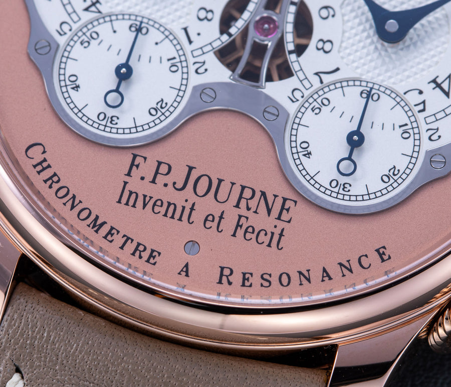 Launched shortly after the 1999 Tourbillon Souscription, the Chronomètre à Résonance is perhaps Journe’s most ingenious wristwatch. Inspired by Antide Janvier's 19th century double-pendulum clocks that were built to function on the principles of resonance, the movement has twin balance wheels that beat in sync, relying on the air within the case and the movement bridges to transmit the subtle vibrations that allow them to operate in resonance.