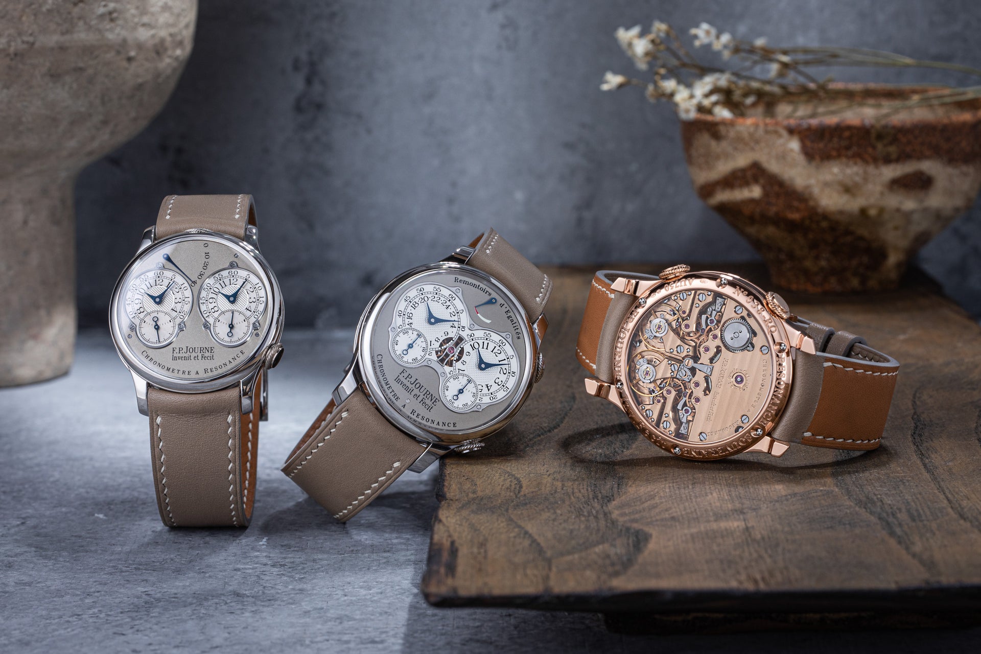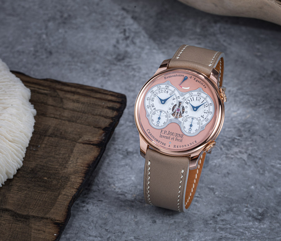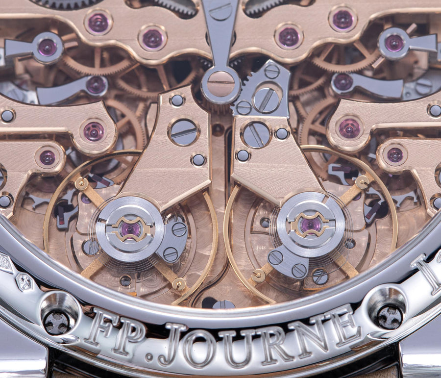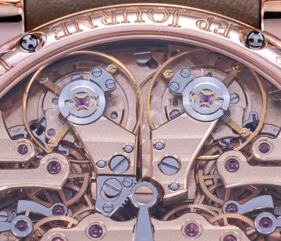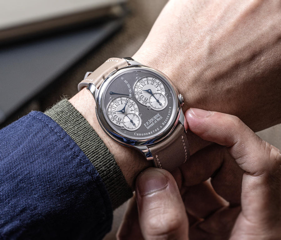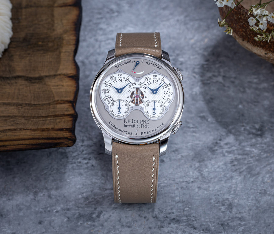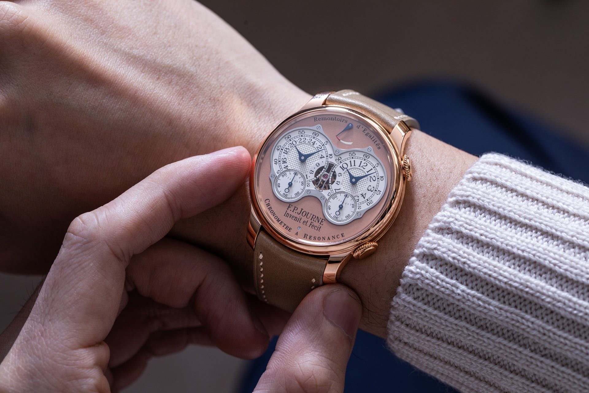 Launched shortly after the 1999 Tourbillon Souscription, the Chronomètre à Résonance is perhaps Journe’s most ingenious wristwatch. Inspired by Antide Janvier's 19th century double-pendulum clocks that were built to function on the principles of resonance, the movement has twin balance wheels that beat in sync, relying on the air within the case and the movement bridges to transmit the subtle vibrations that allow them to operate in resonance.