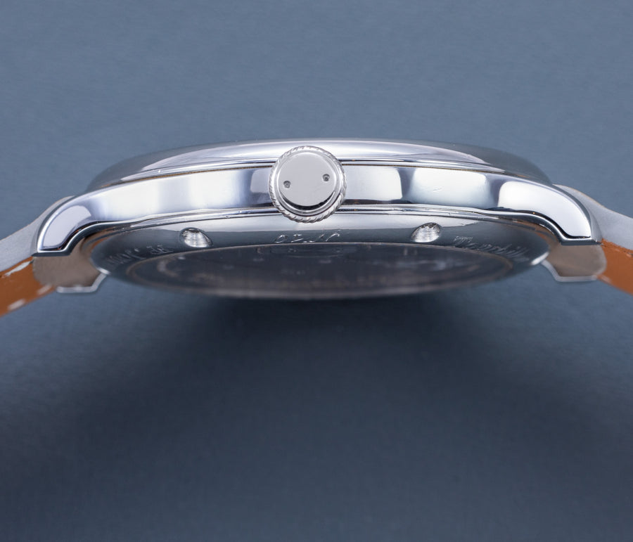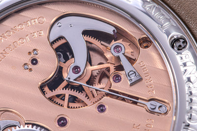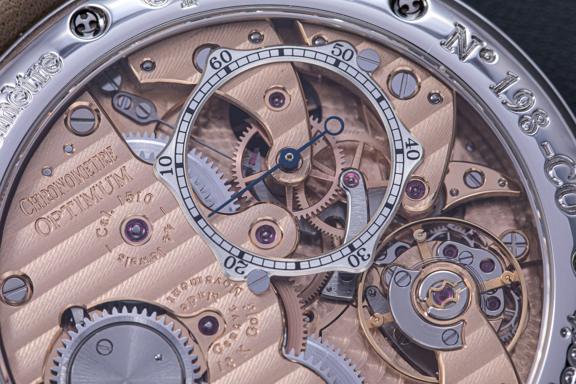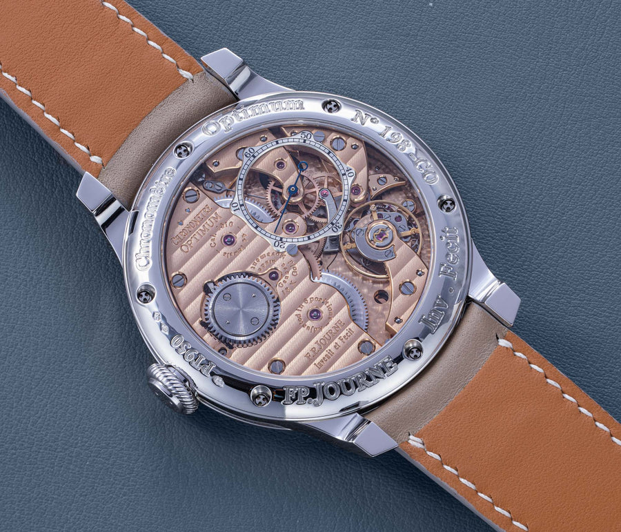 The purest timekeeper in the F.P.Journe line up, the Chronomètre Optimum was conceived as a chronometer without frills. It incorporates a constant force mechanism similar to that found in the Tourbillon Souverain, but with two features conceived specifically for timekeeping. One are the twin barrels for constant power delivery throughout its power reserve. And the other is a double-wheel, direct-impulse escapement inspired by the natural escapement invented by A.L. Breguet, which can function without lubrication or a decline in amplitude over its running time.
