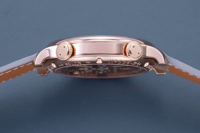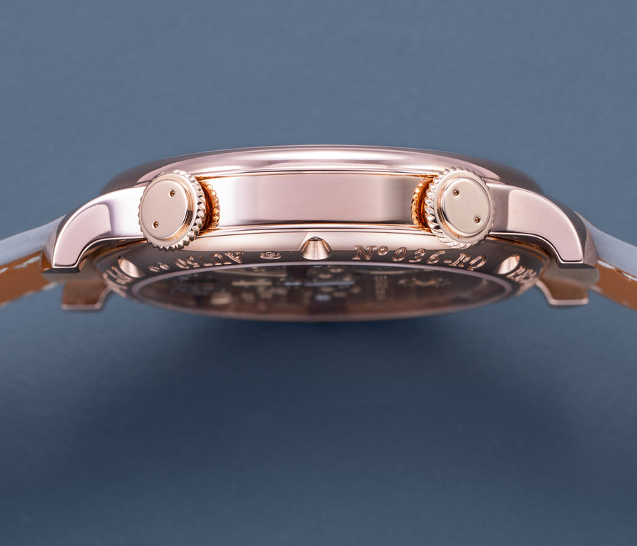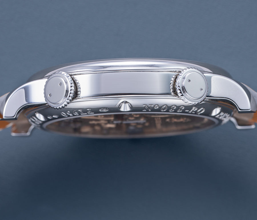 The Chronomètre à Résonance features a redesigned case with a crown now placed at 2 o’clock easing the winding of the watch in position 0 and the time setting in position 2, clockwise for the left dial and anti-clockwise for the right dial. The pulling of the crown at 4 o’clock simultaneously resets both seconds.