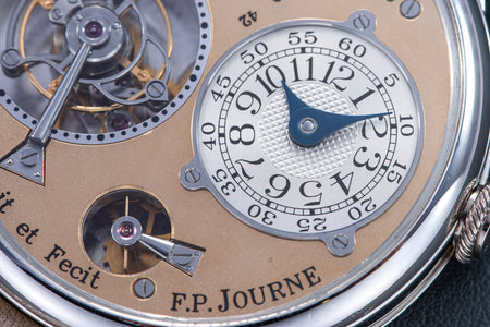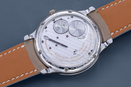 Perhaps one of the most iconic and important of F.P.Journe wristwatches, the Souscription Tourbillon was produced in a series of 20 watches. Journe sold them by “subscription” in 1999 – collectors had to put down a deposit for future delivery thereby giving Journe the capital to start his own brand. It was equipped with a hand-wound movement featuring a tourbillon as well as a remontoir d’égalité constant-force mechanism - both considered novel complications for a wristwatch during the period. Though this watch is technically similar to later Tourbillon Souverains, the Souscription Tourbillon, as well as the other tourbillons Journe produced in 1999 has several distinguishing features, including the grainy, shiny dial that Journe finished by hand himself.