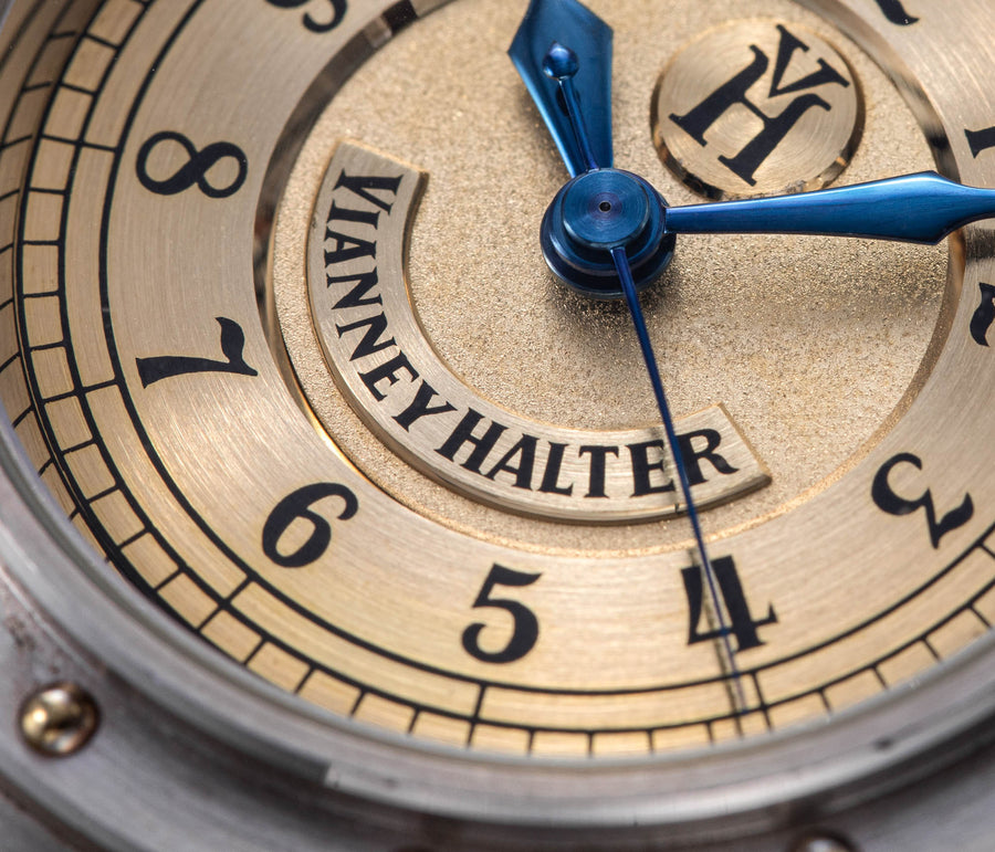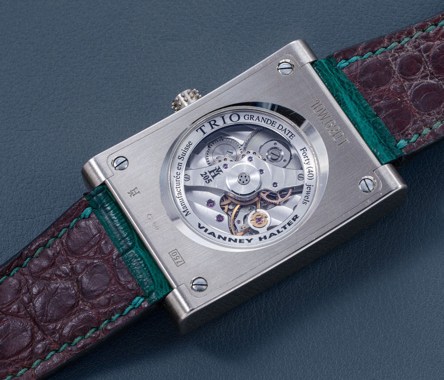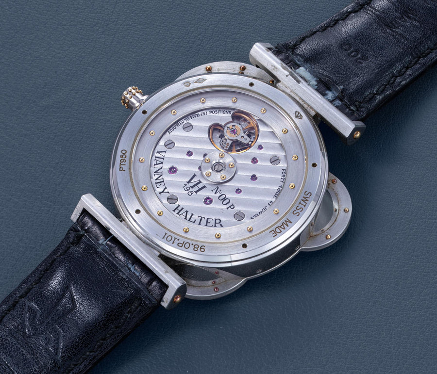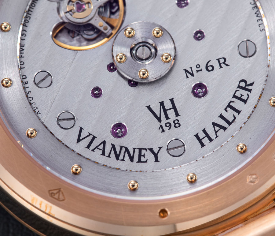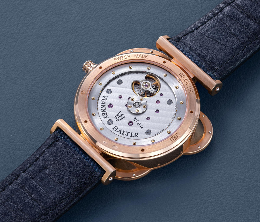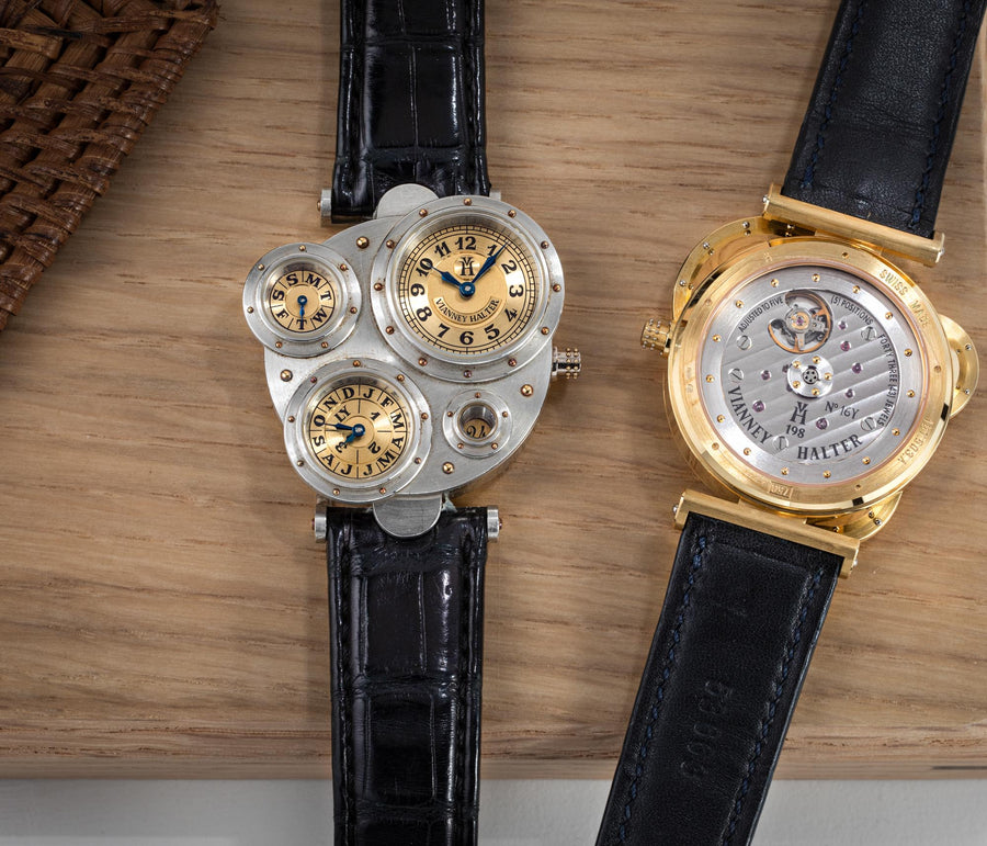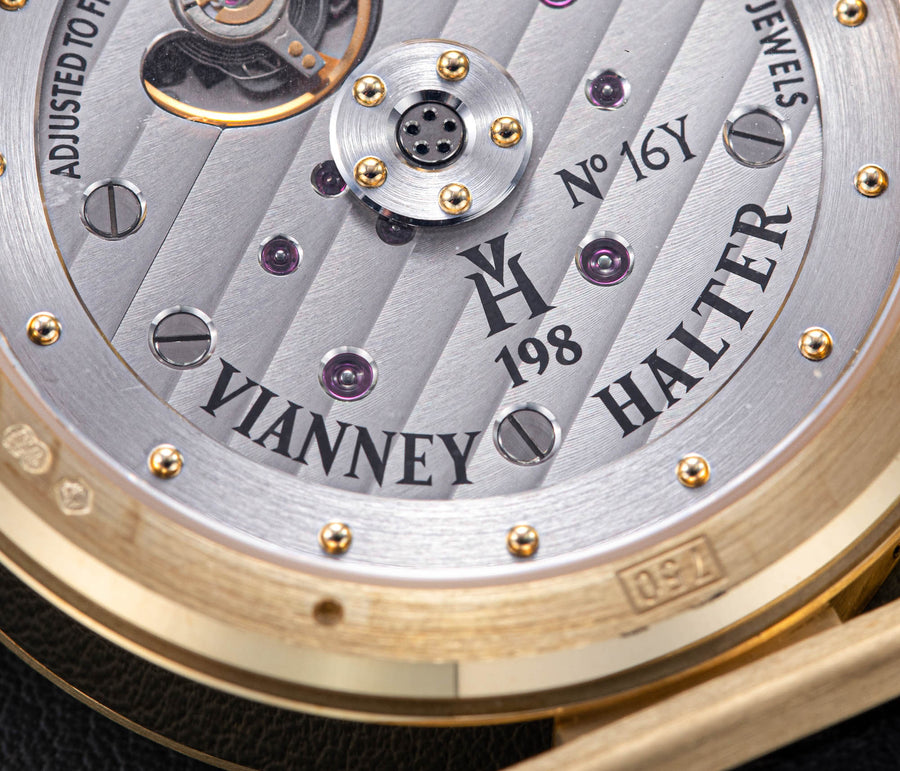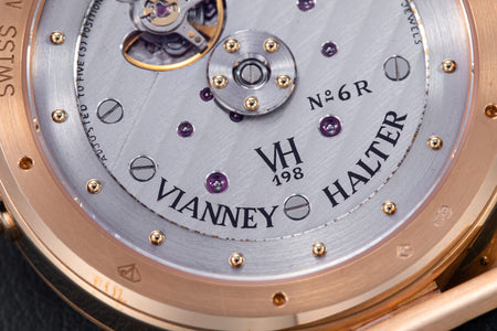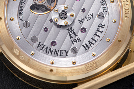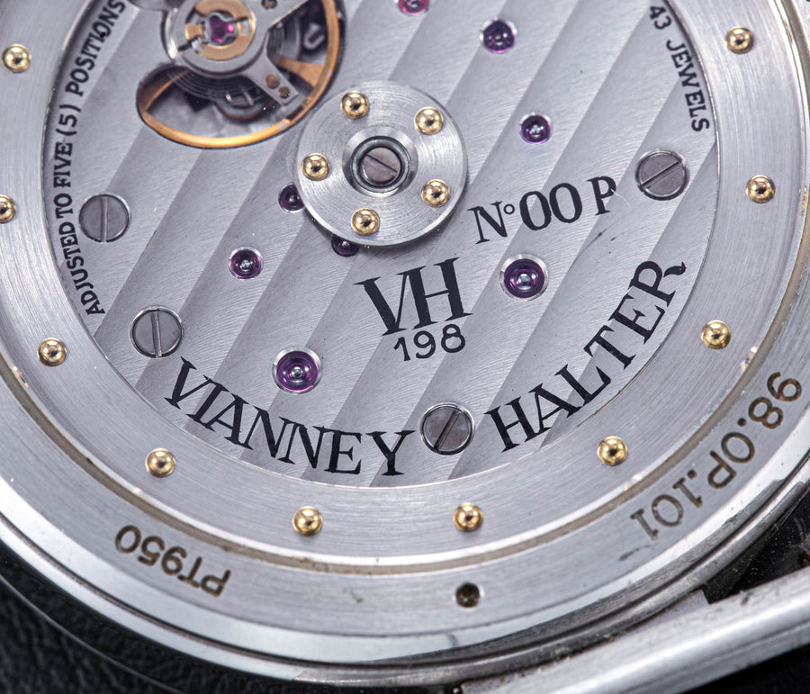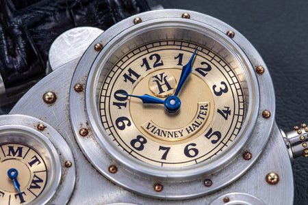The quintessential Vianney Halter wristwatch, the Antiqua was launched in 1998. Radical in its steampunk design, the Antiqua was actually borne of Halter’s partnership with American designer Jeff Barnes, leading to the early brand name of Halter-Barnes.