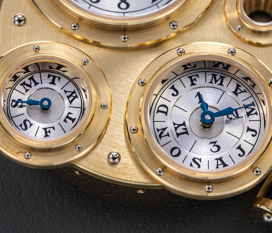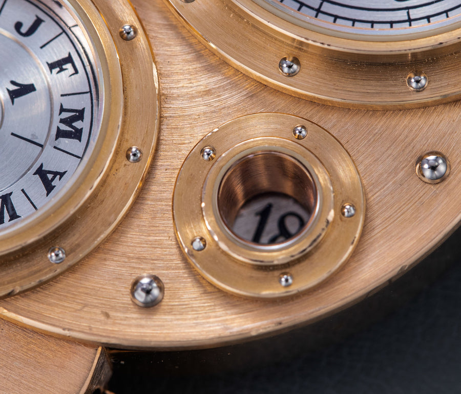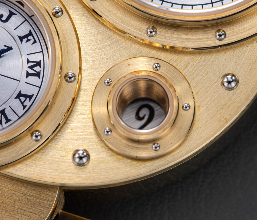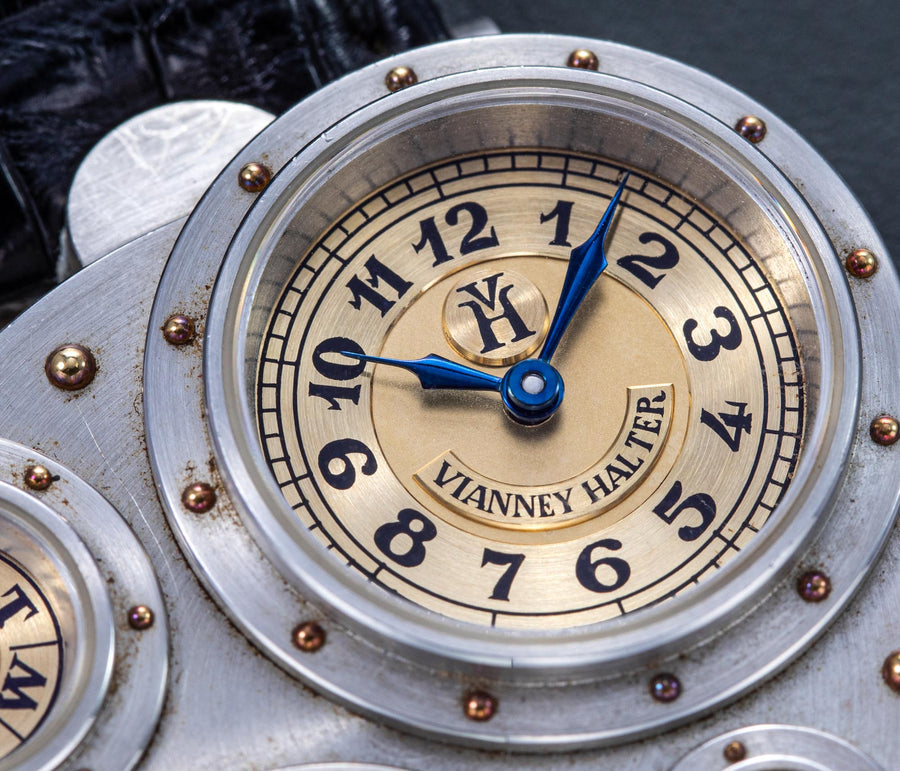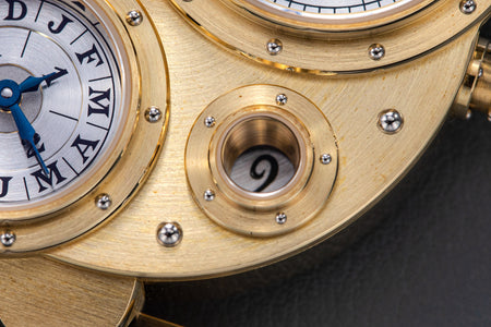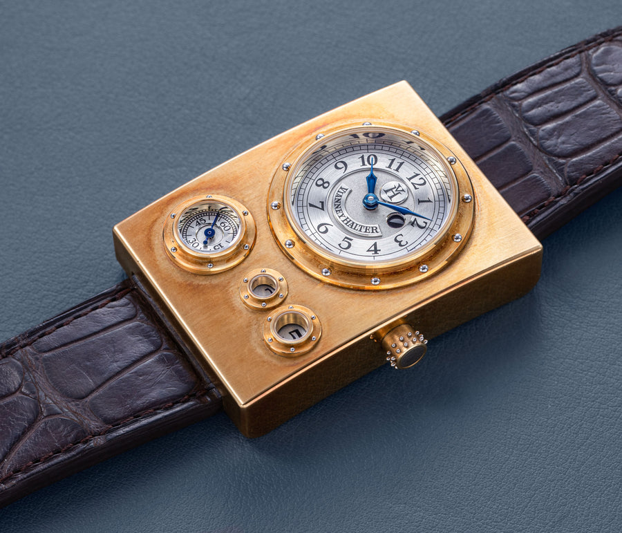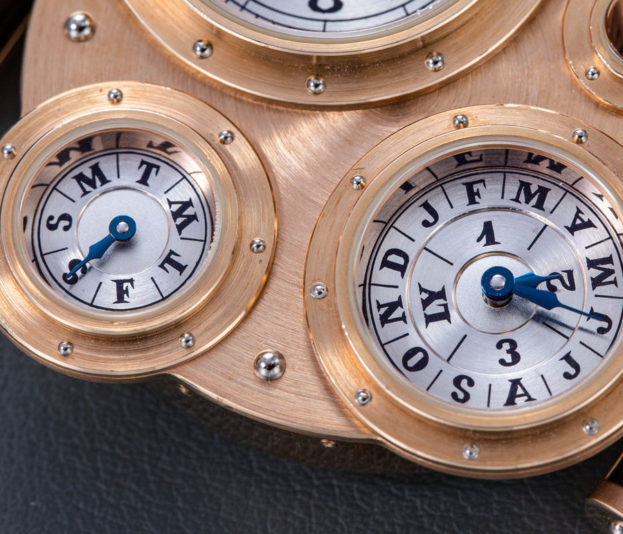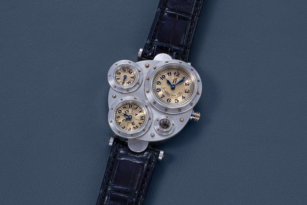 Conceived to resemble a time machine from a Jules Verne novel, the Antiqua was a perpetual calendar with the time and calendar separated into sub-dials framed in riveted bezels, a complex construction that few could accomplish but Halter did.