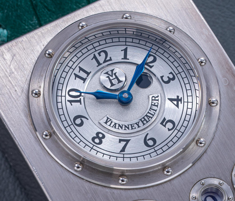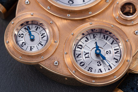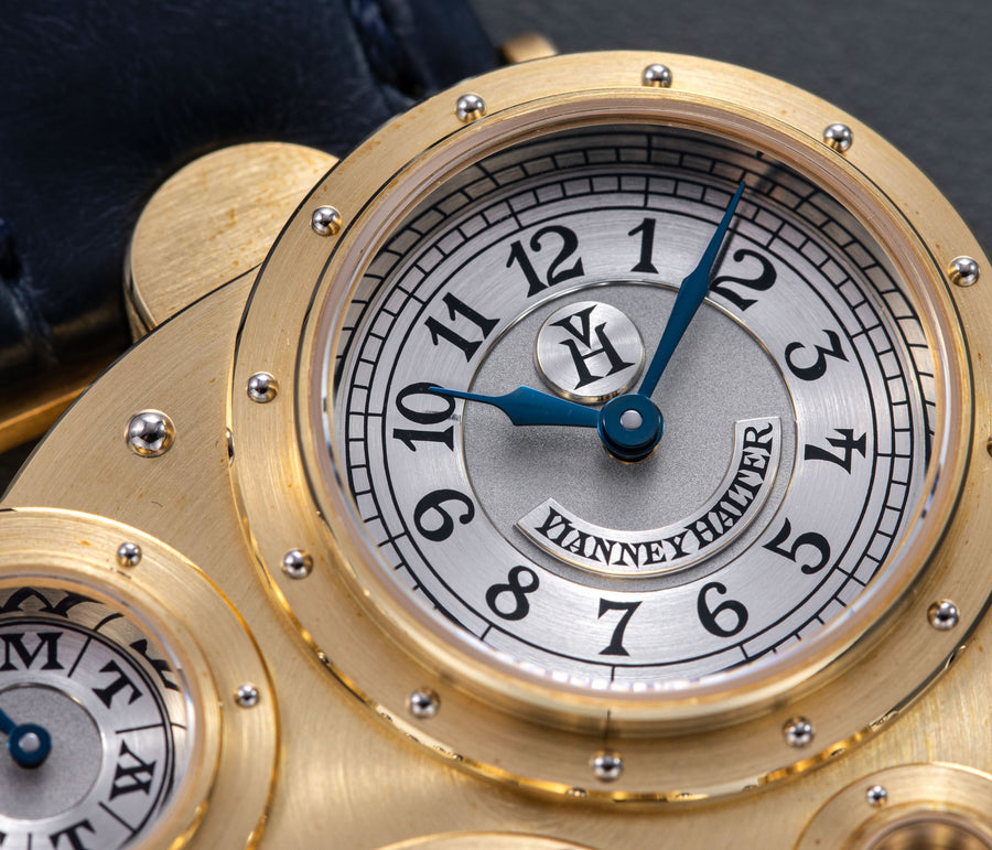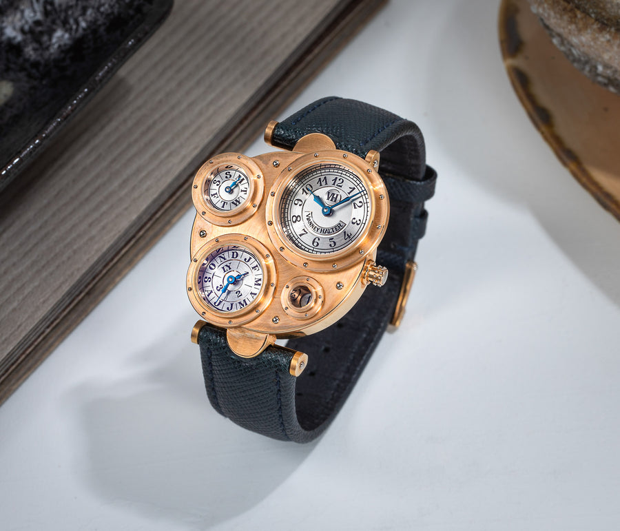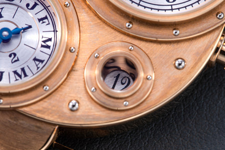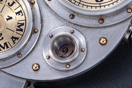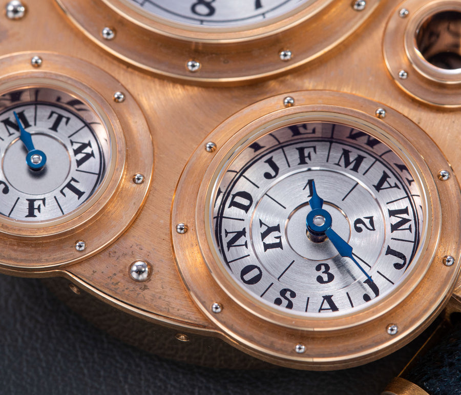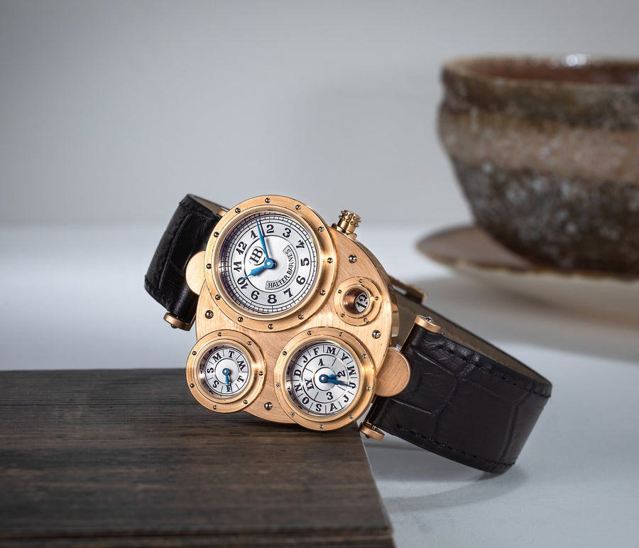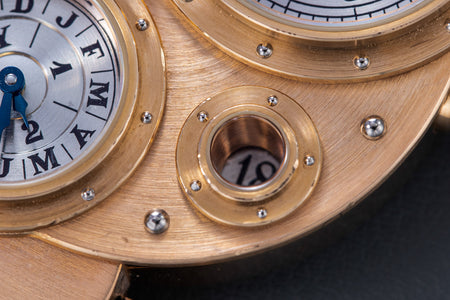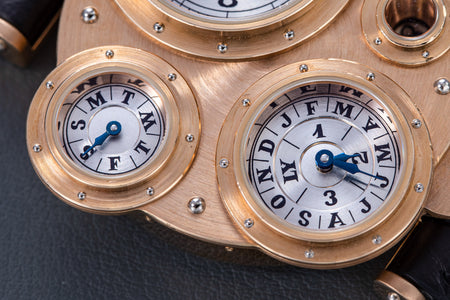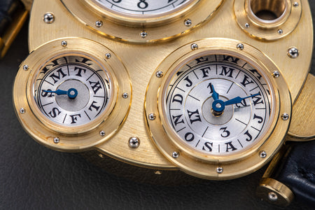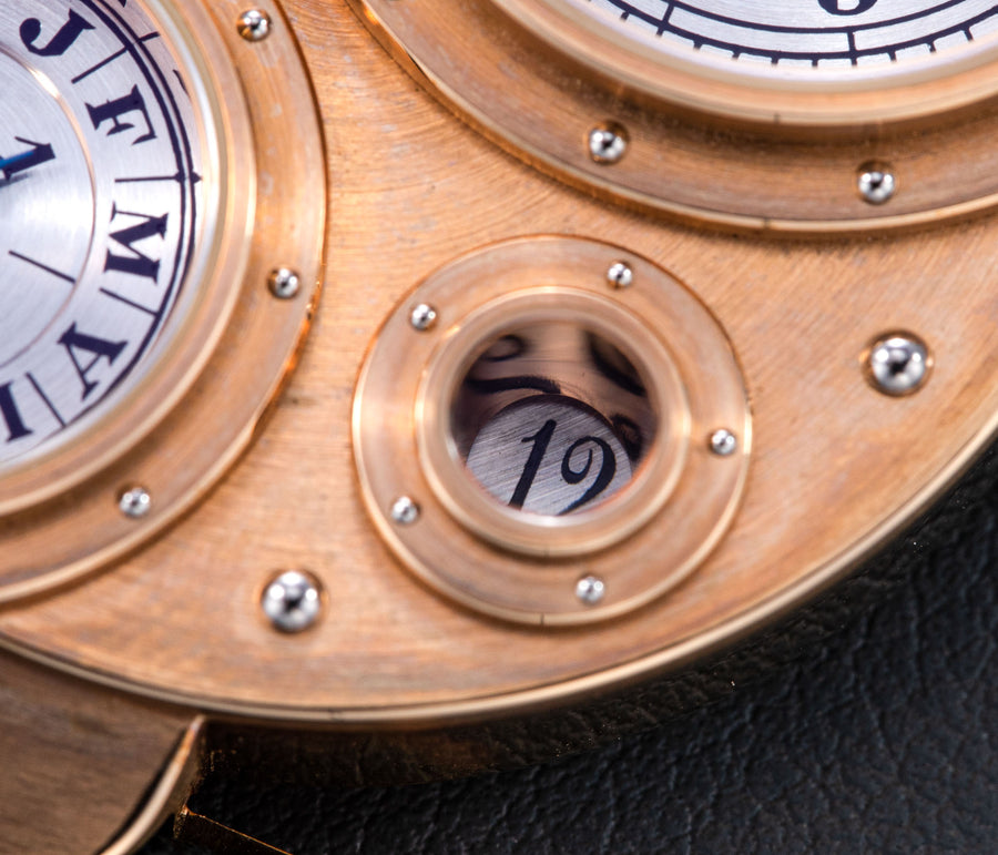 Conceived to resemble a time machine from a Jules Verne novel, the Antiqua was a perpetual calendar with the time and calendar separated into sub-dials framed in riveted bezels, a complex construction that few could accomplish but Halter did.