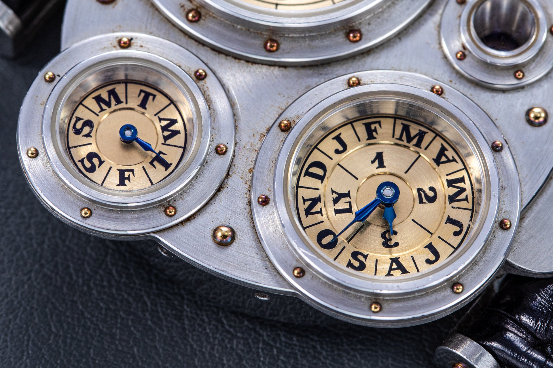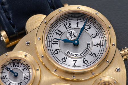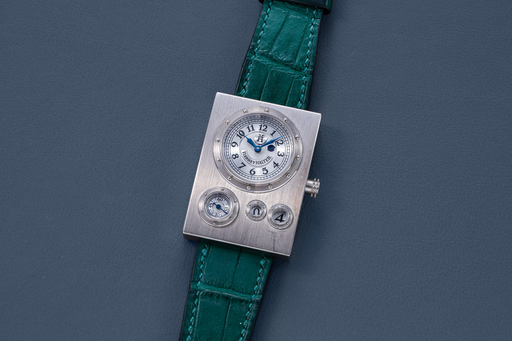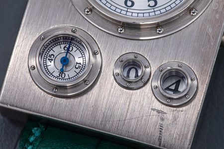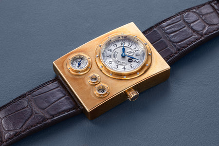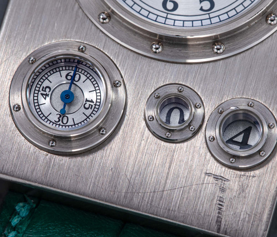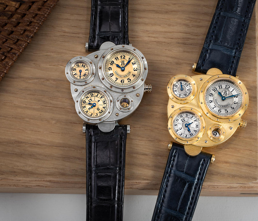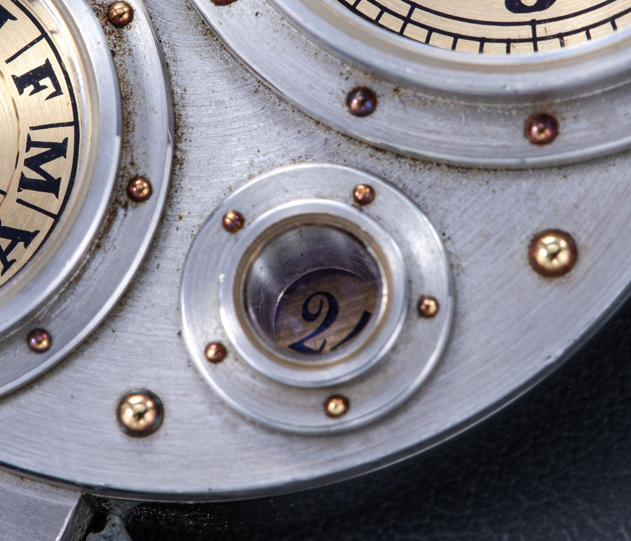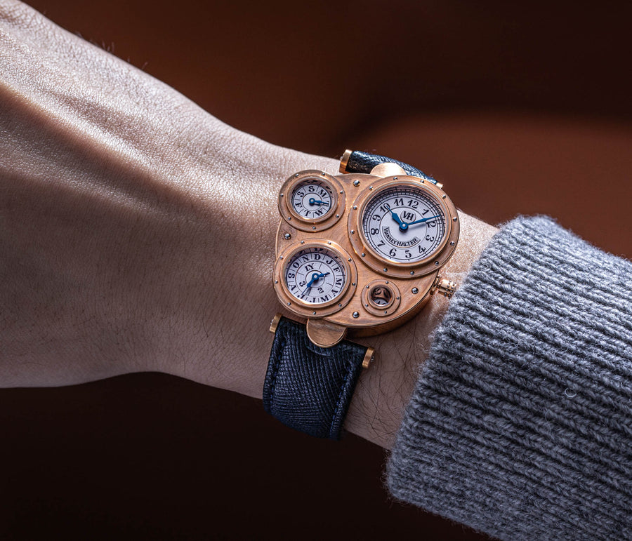 Conceived to resemble a time machine from a Jules Verne novel, the Antiqua was a perpetual calendar with the time and calendar separated into sub-dials framed in riveted bezels, a complex construction that few could accomplish but Halter did.