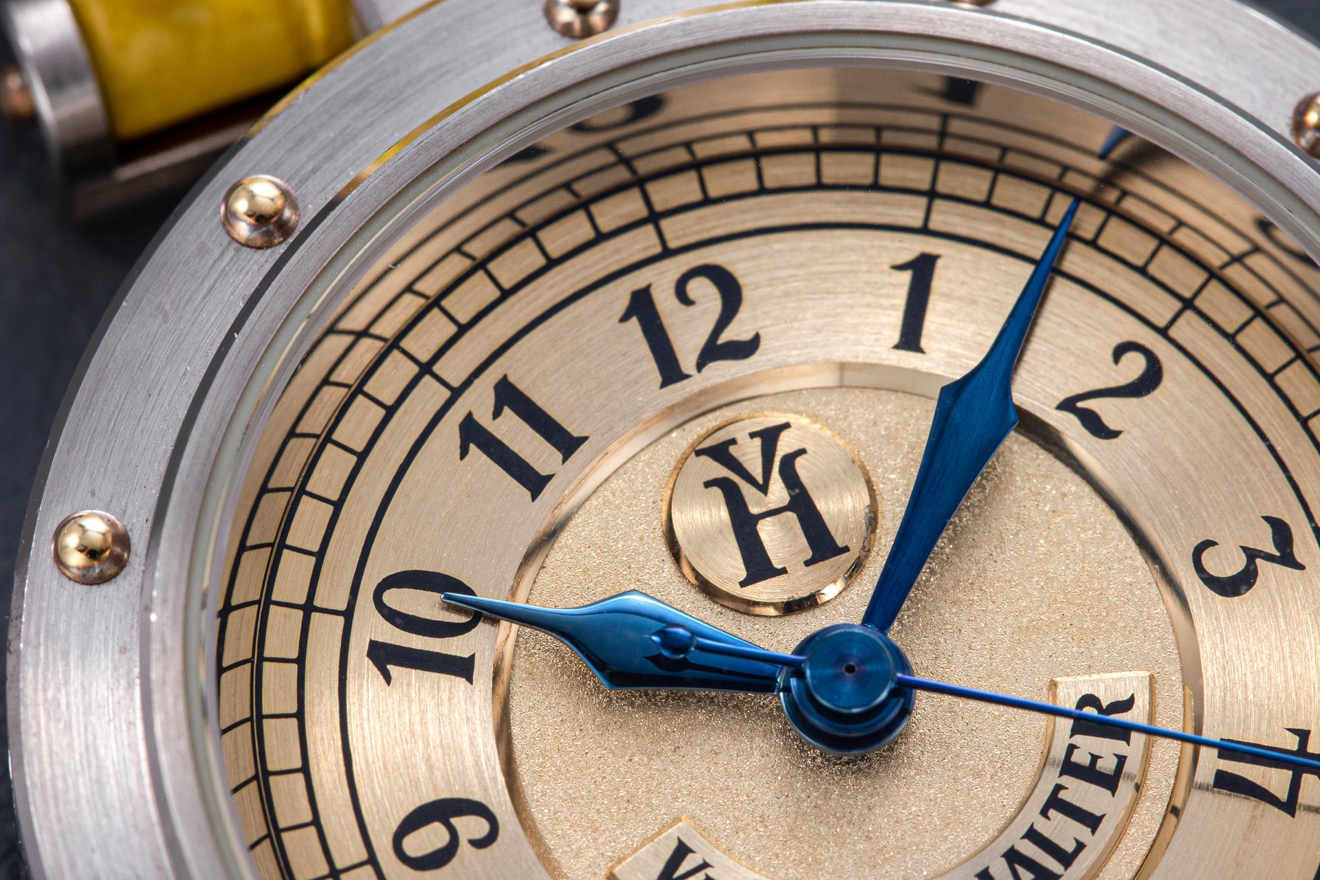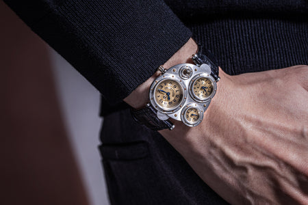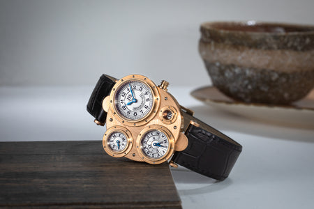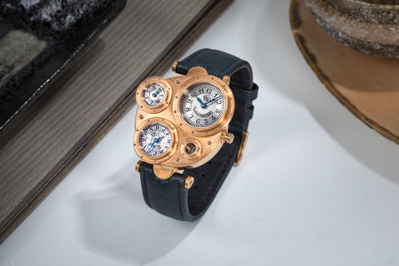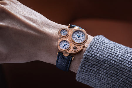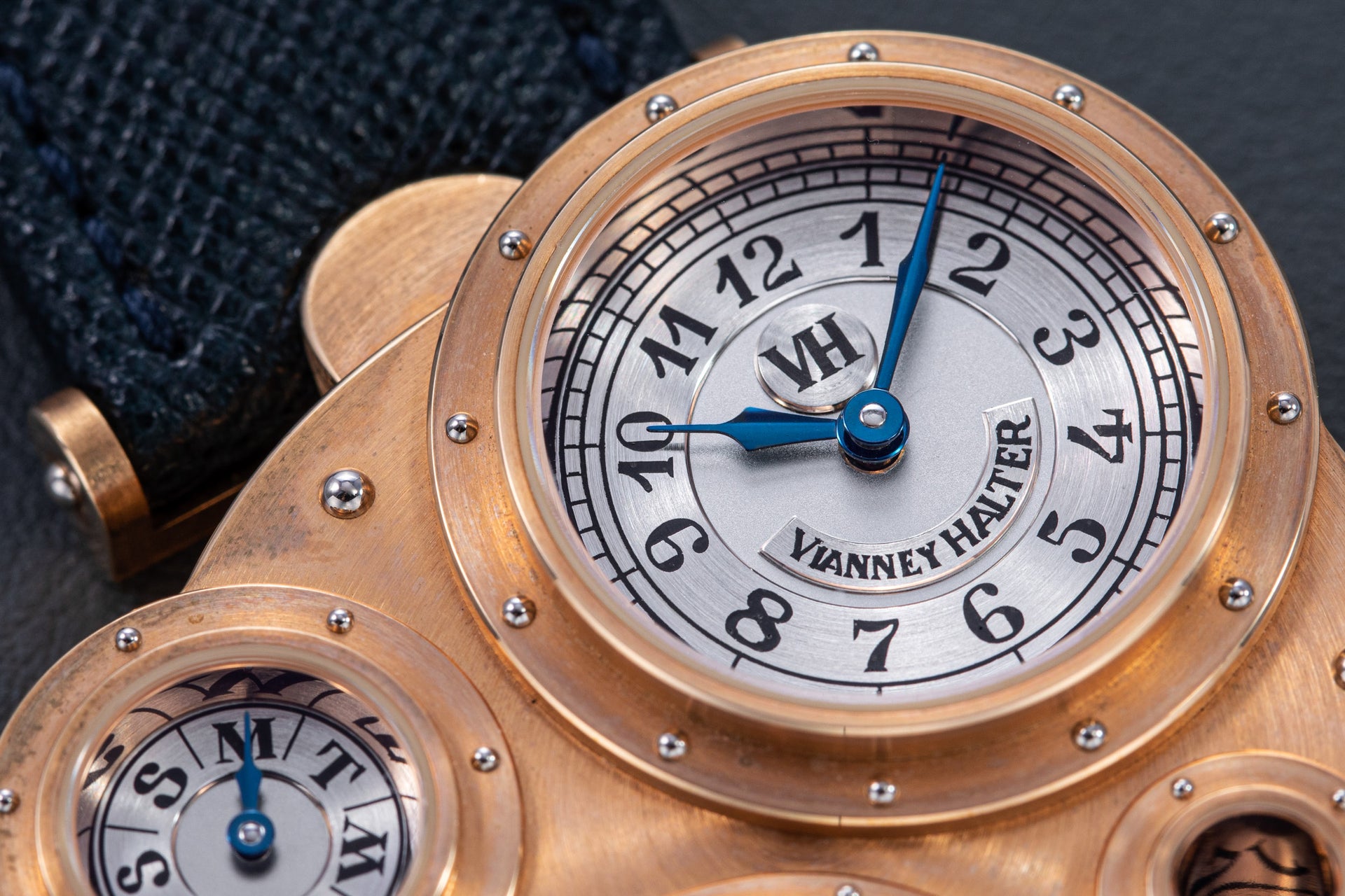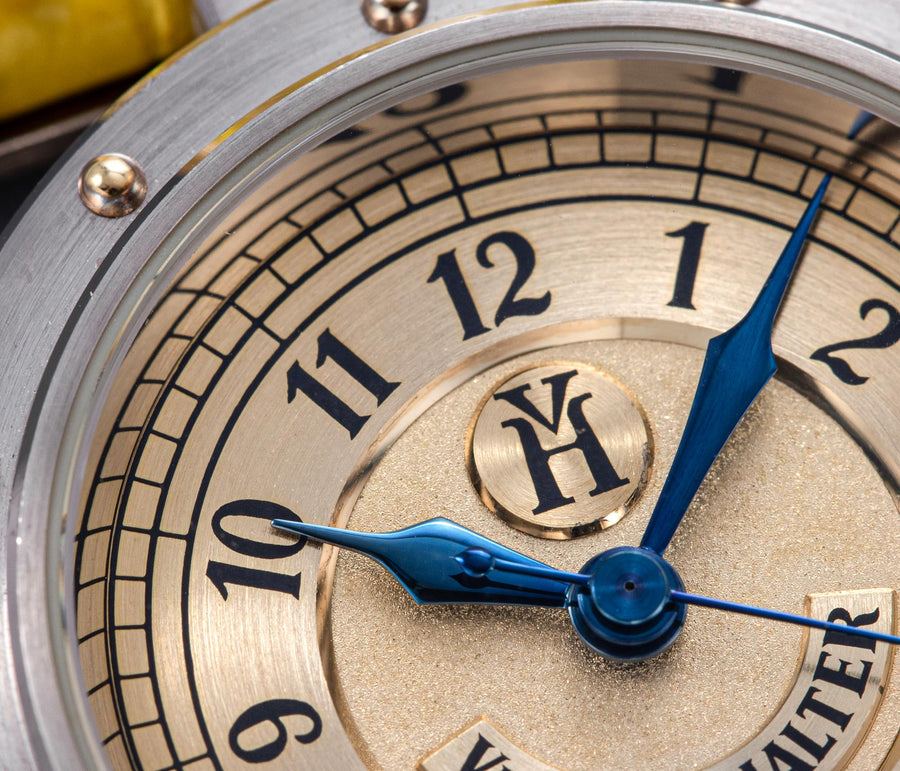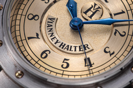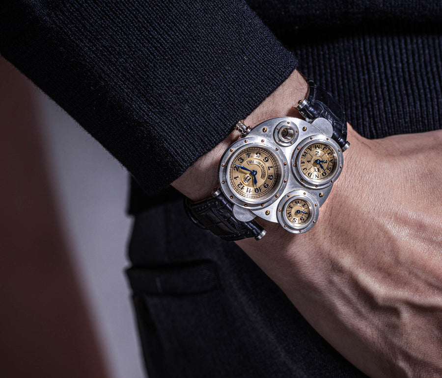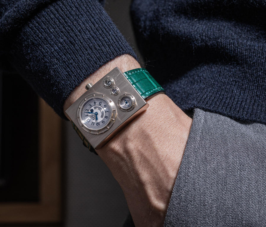 Conceived to resemble a time machine from a Jules Verne novel, the Antiqua was a perpetual calendar with the time and calendar separated into sub-dials framed in riveted bezels, a complex construction that few could accomplish but Halter did.