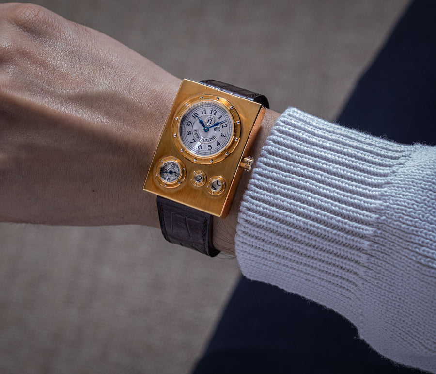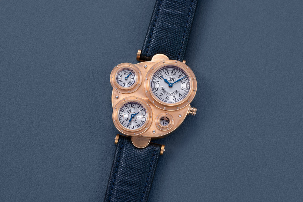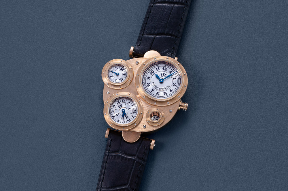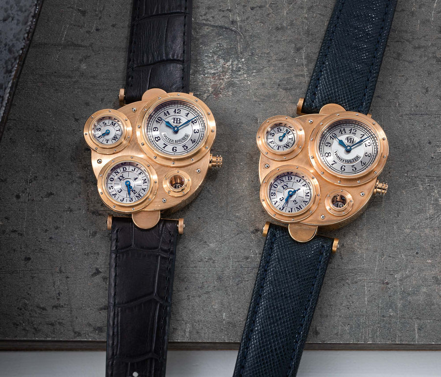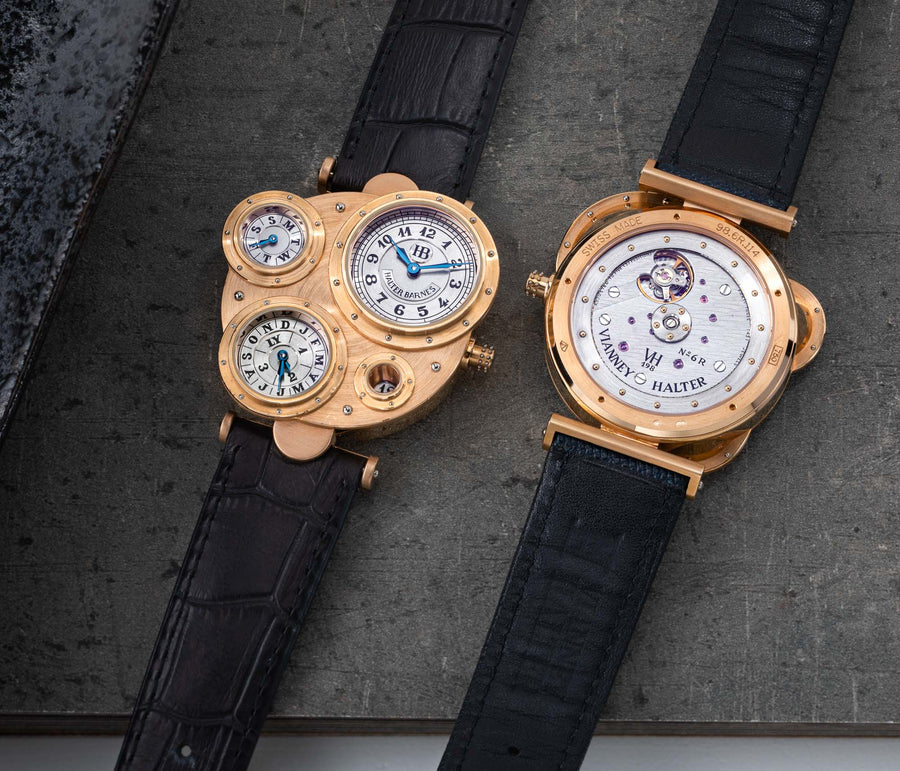 Introduced to Halter by Joseph Penola, an American associate of Barnes who originally hailed from Sainte-Croix and where Halter resides, Barnes’ inaugural 1994 design was a wristwatch with four sub-dials, each within its own porthole in a steampunk-style case. It was a round watch yet deconstructed and utterly unlike anything that had come before. In fact, it was so far from convention that few watchmakers would take on the task of turning the design into reality.