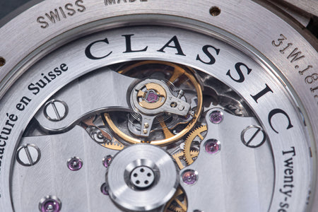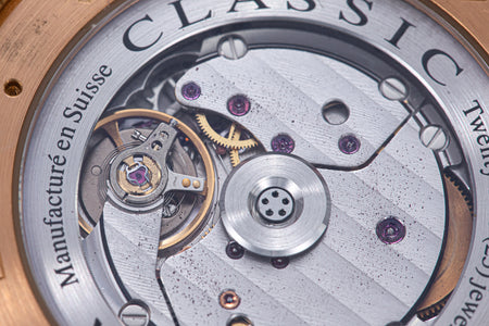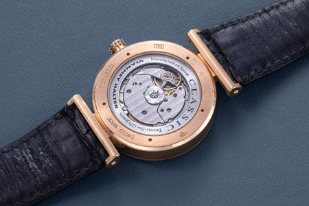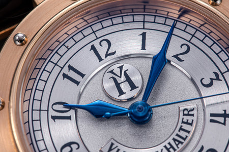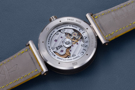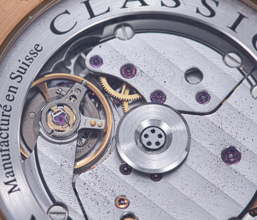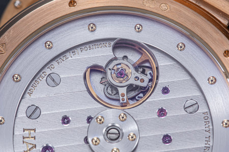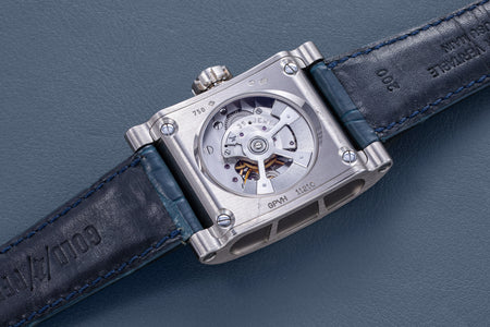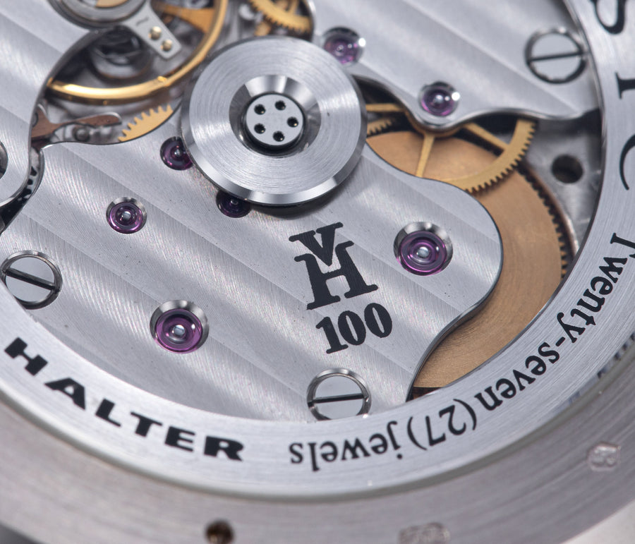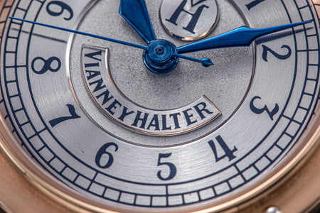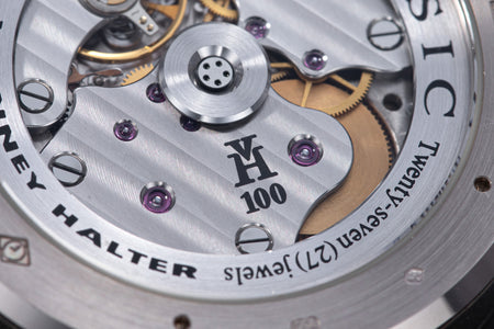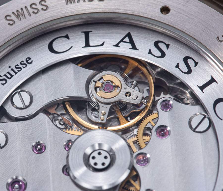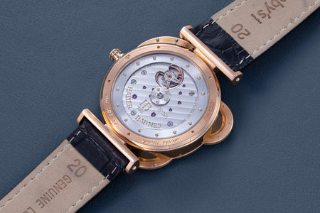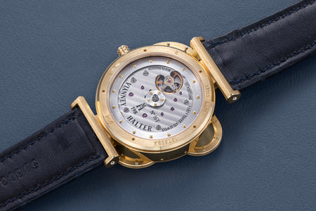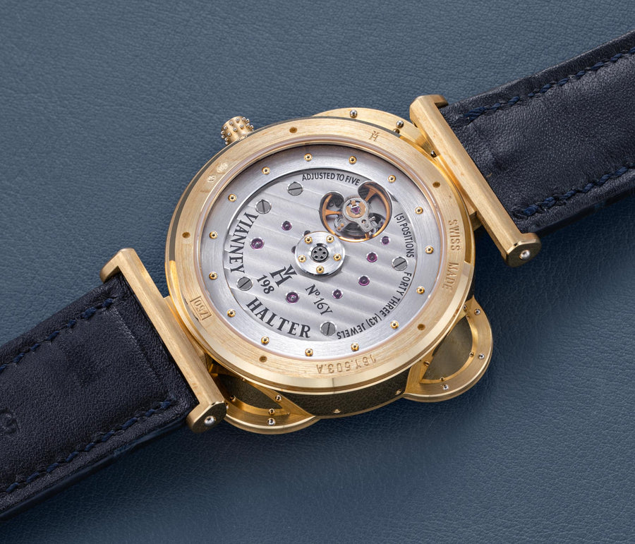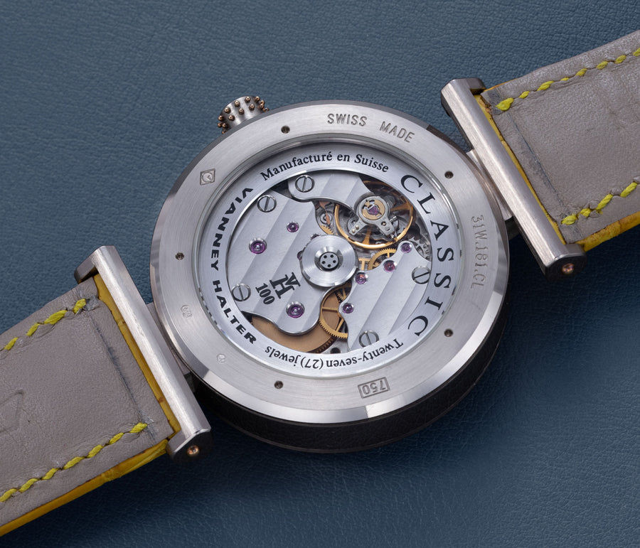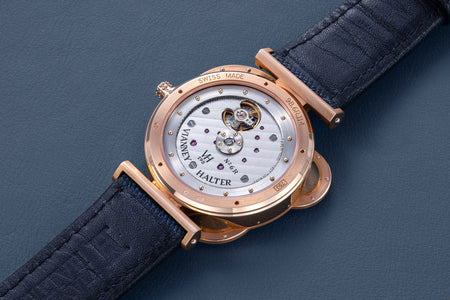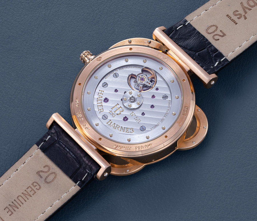 The simplest of the Halter-Barnes creations, the Classic shows only the time on the front, but features a trademark element of the brand’s movements – a mystery rotor made of a clear sapphire disc weighted only along half its edge, allowing the rotor to spin almost invisibly.