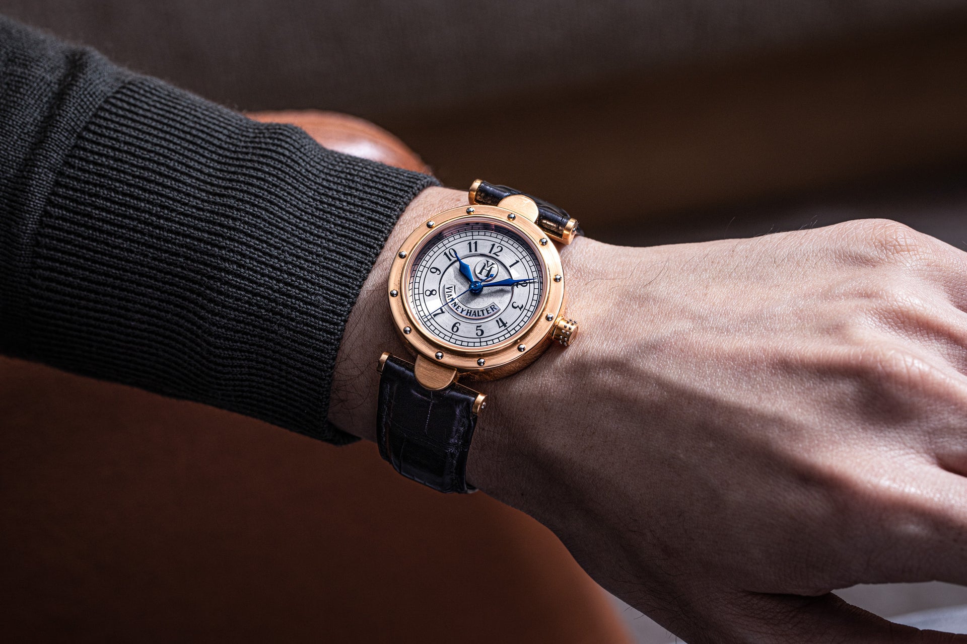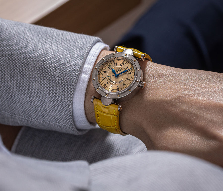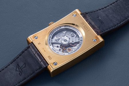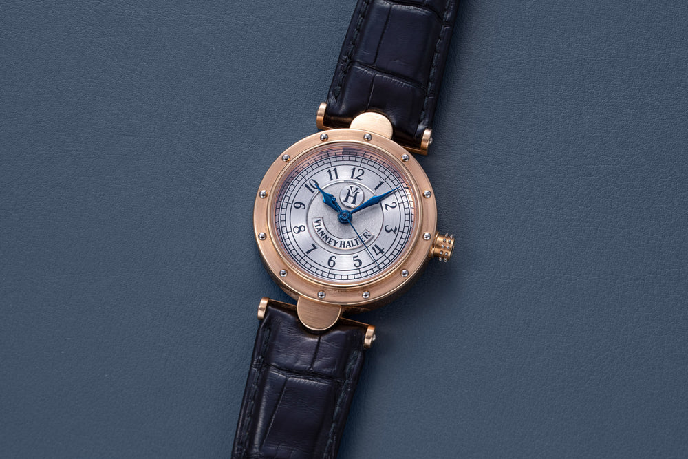 Soon after the lauded premiere of the Antiqua, Halter put several other of Barnes’ designs into production, namely the Classic and the Trio, before moving on to other projects, including the quirky Goldpfeil wristwatch created for the now defunct German leather goods maker that was inspired by a leather-wrapped rangefinder camera.