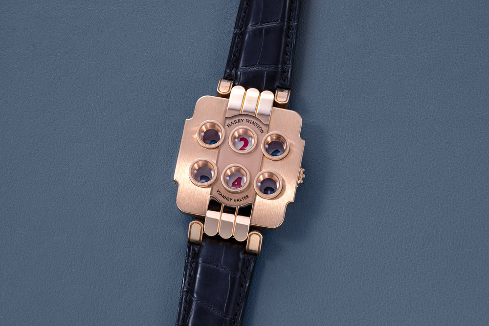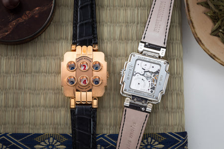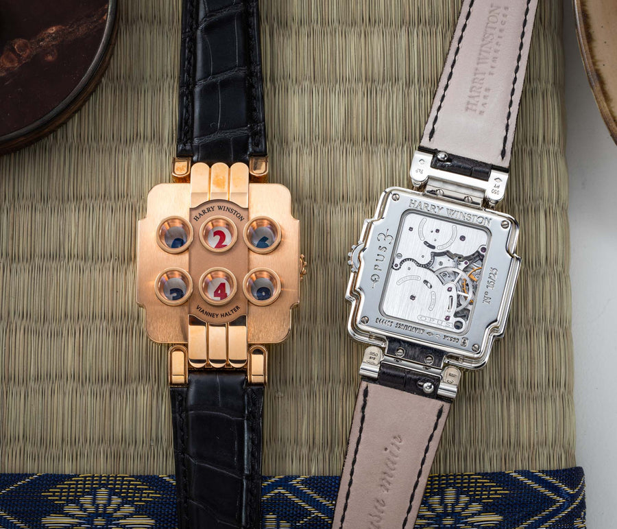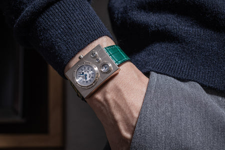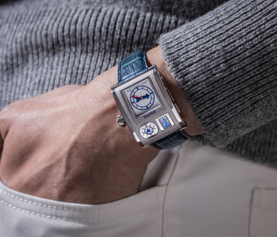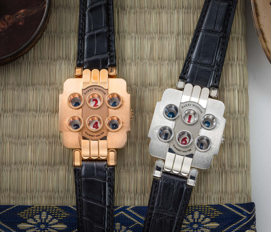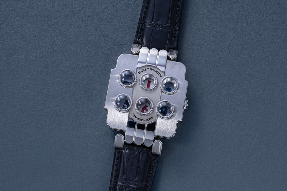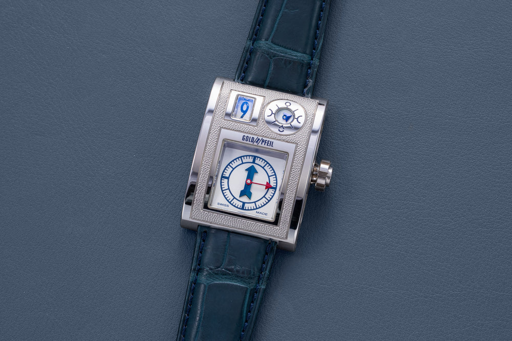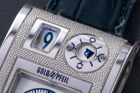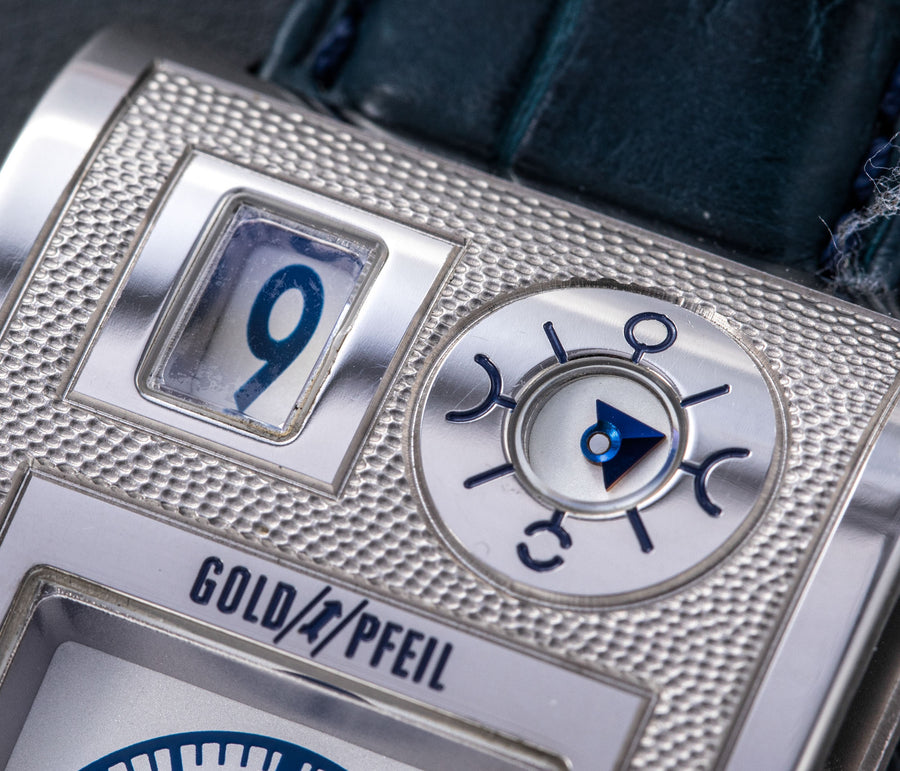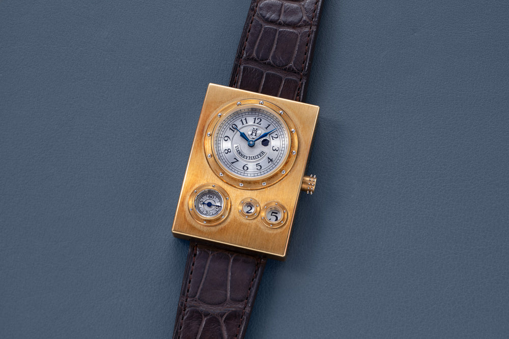 Rendered in a radically different style, the Goldpfeil and Opus 3 were all collaborations between Vianney Halter and a mainstream luxury brand – Harry Winston a famed New York jeweller, and Goldpfeil a German leather goods maker. Both watches were styled with the help of French designer Pascal Pages, explaining the shared, quirky aesthetic. Inspired by a vintage camera, the Goldpfeil wristwatch was a novel interpretation of two traditional complications, the jump hour and moon phase.