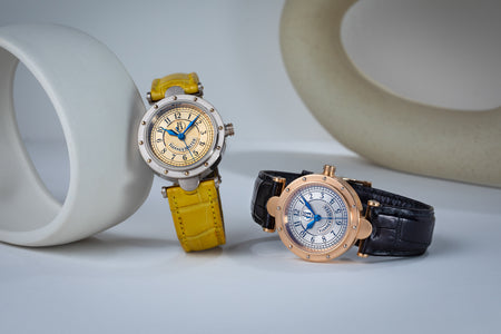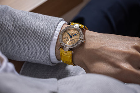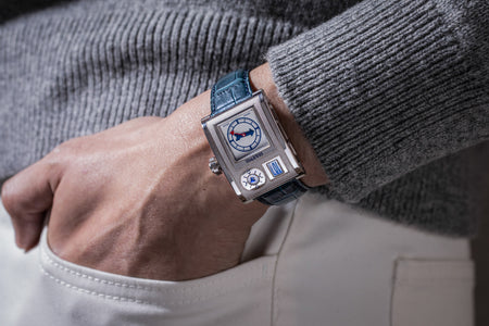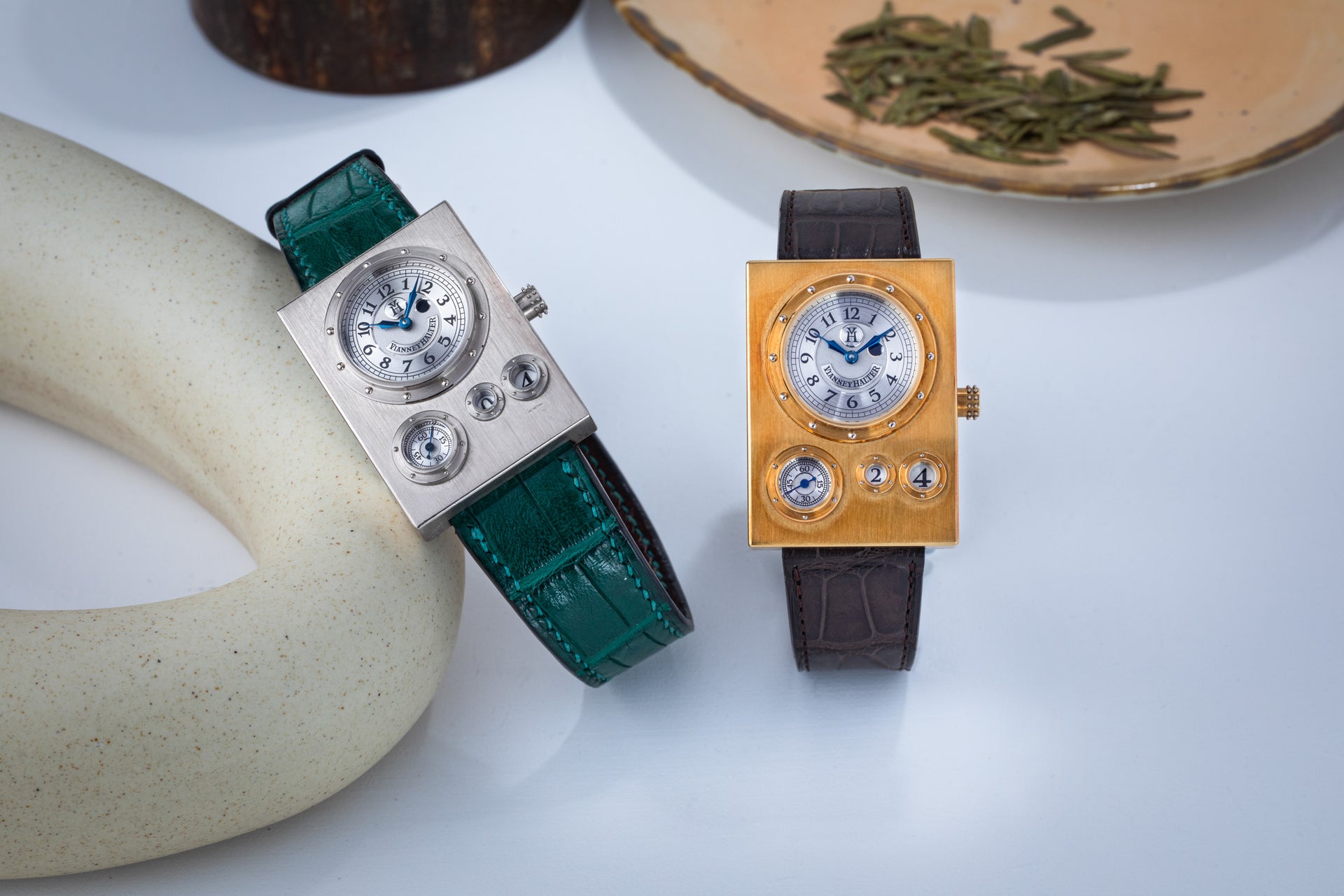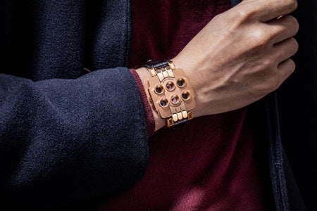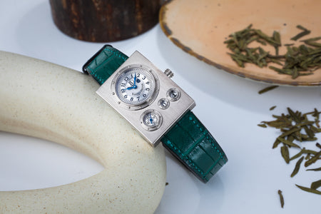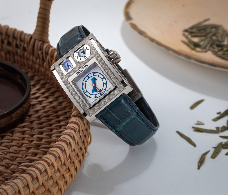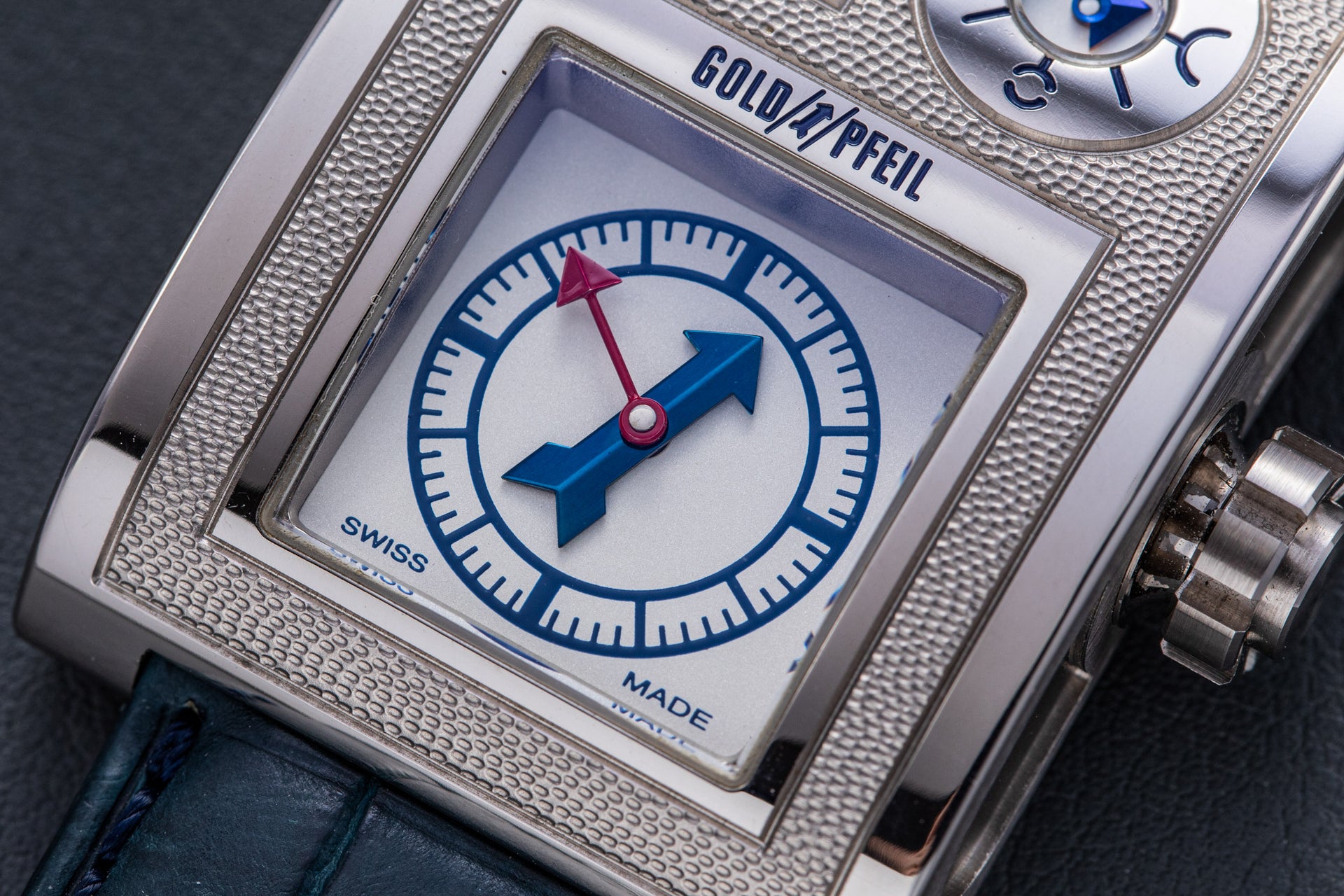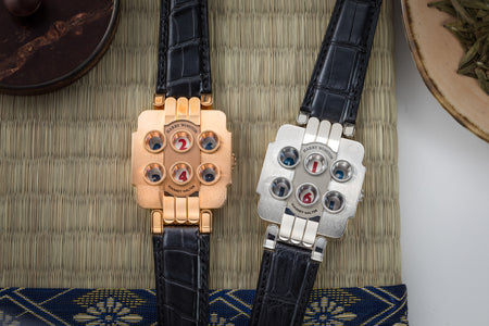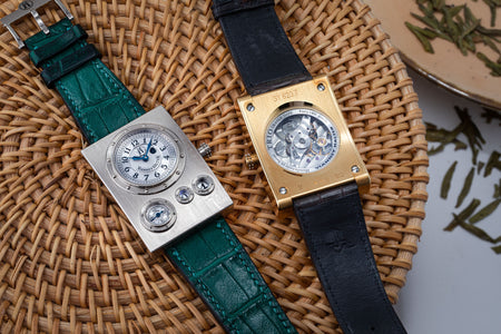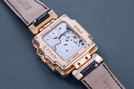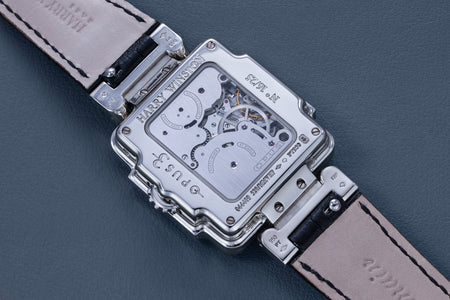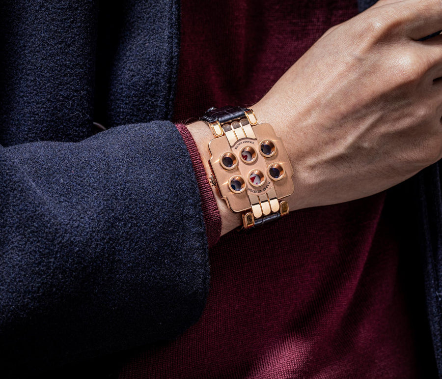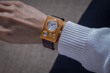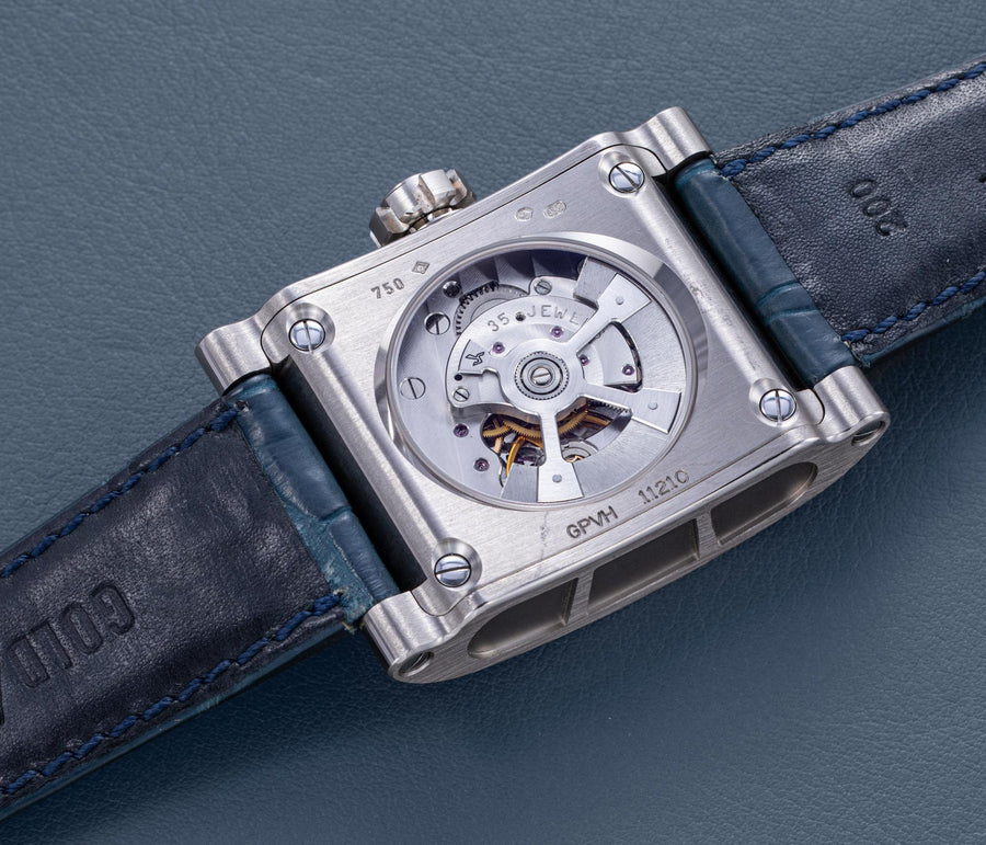 Rendered in a radically different style, the Goldpfeil and Opus 3 were all collaborations between Vianney Halter and a mainstream luxury brand – Harry Winston a famed New York jeweller, and Goldpfeil a German leather goods maker. Both watches were styled with the help of French designer Pascal Pages, explaining the shared, quirky aesthetic. Inspired by a vintage camera, the Goldpfeil wristwatch was a novel interpretation of two traditional complications, the jump hour and moon phase.