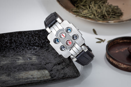 Another of the Halter-Barnes designs was the Trio, which only indicates the time and date, but with a striking design giving it the look of an instrument on the wrist.