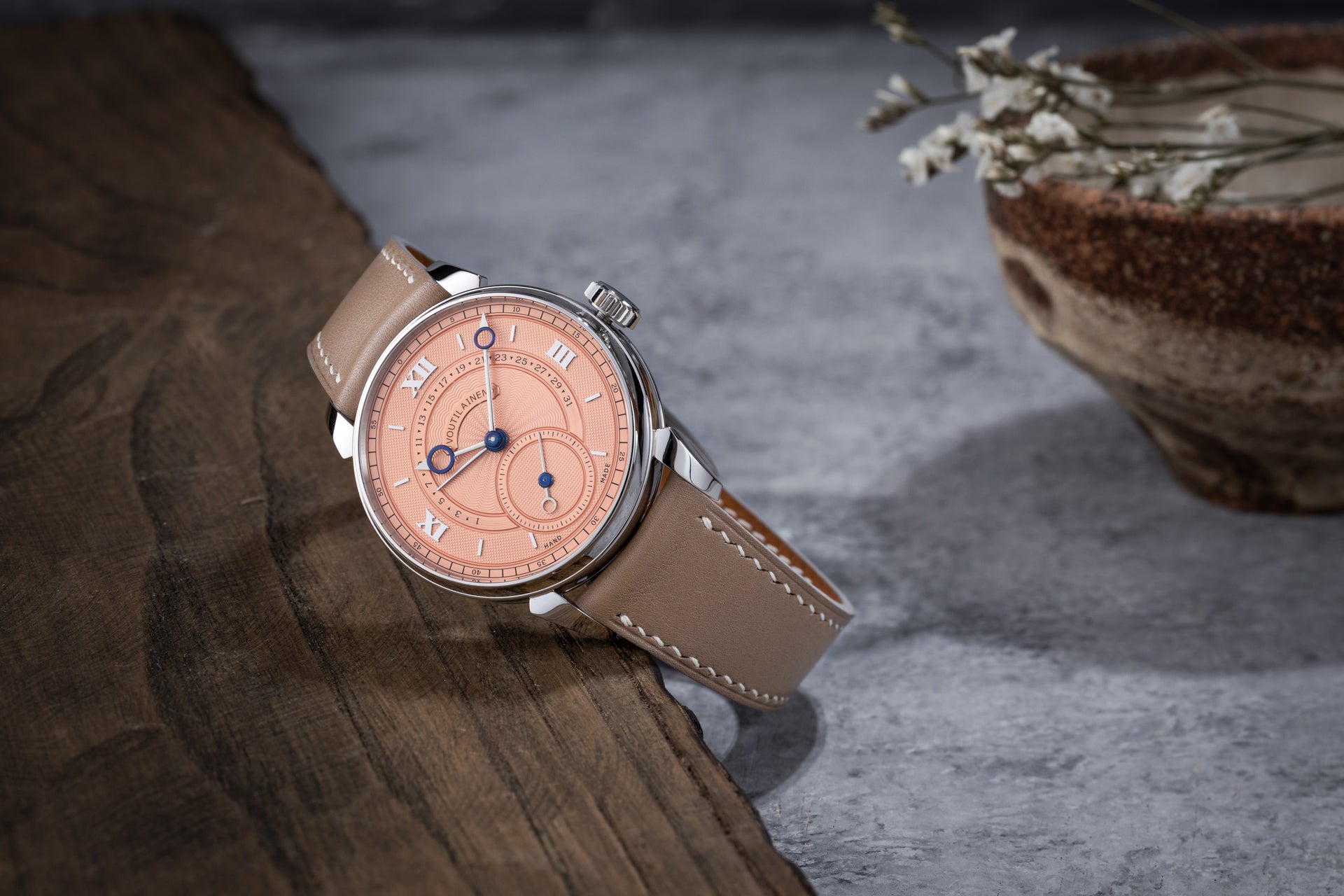 The design of the bright salmon dial is also new, albeit in a subtle manner. The Roman numerals for the quarters are modelled on those found on Voutilainen’s Observatoire have a typography distinct from that found on the brand’s existing watches.