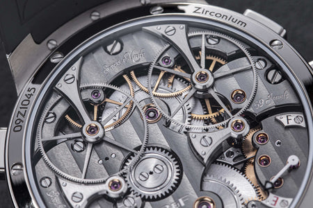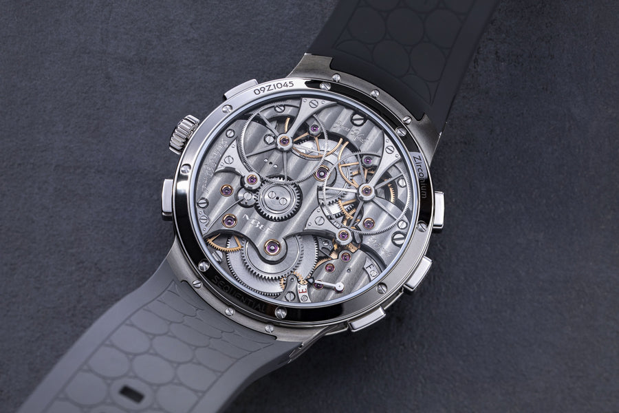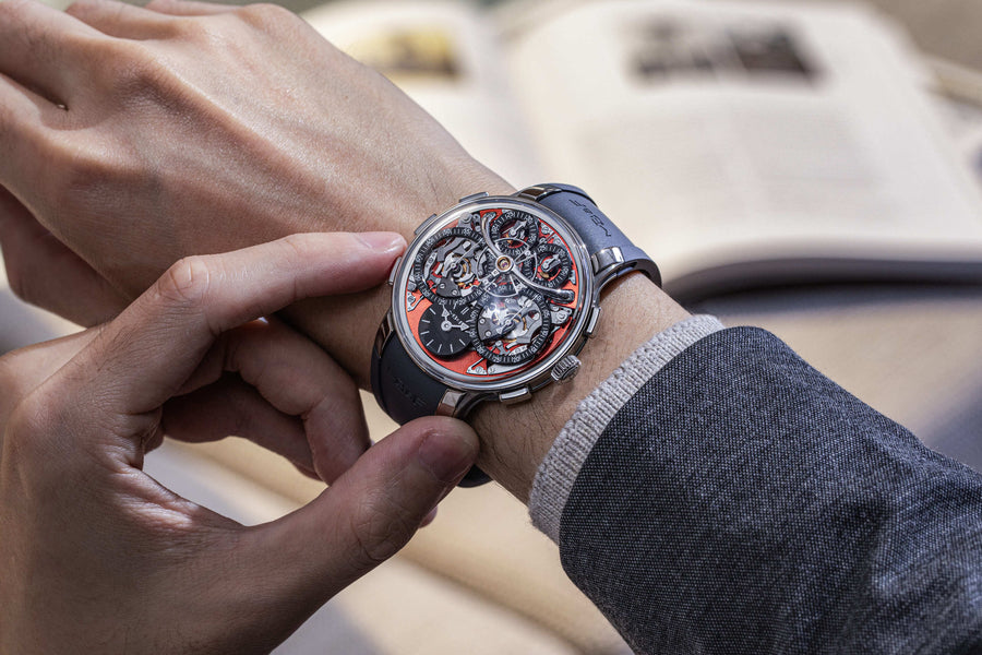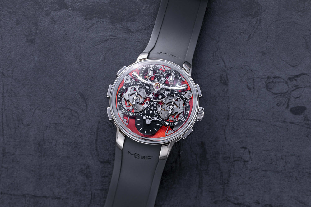 MB&F’s 20th calibre and first-ever chronograph – an astounding achievement after only 17 years since the manufacture’s inception. Developed by long-time collaborator Stephen McDonnell, the L.M. Sequential EVO incorporates two independently operated chronographs linked by a “Twinverter” mechanism. With an “Atomic Orange” PVD coated dial, zirconium case and integrated rubber strap, the chronograph is decidedly contemporary while upholding the classical watchmaking elements championed by MB&F’s Legacy Machine collection.