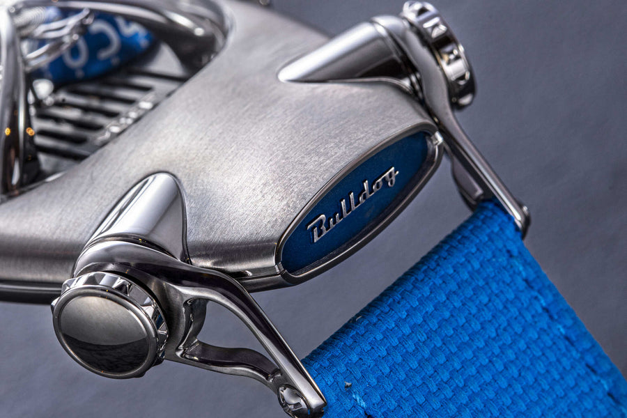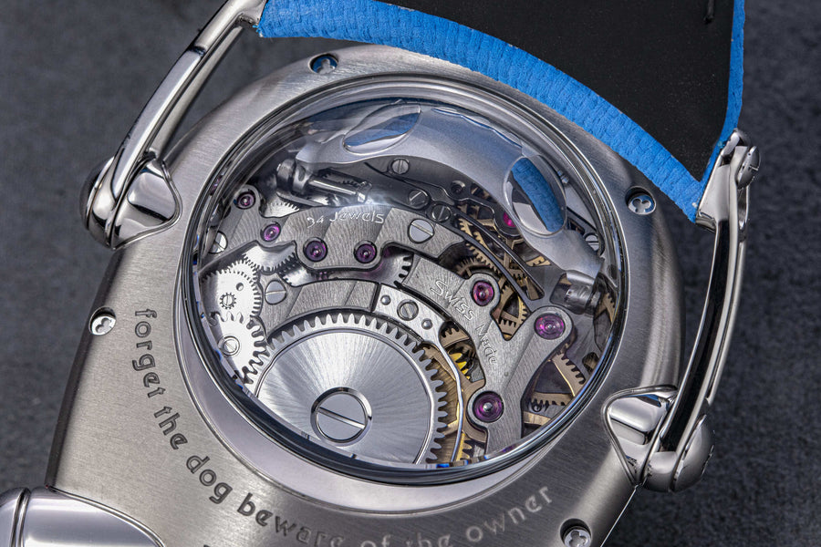 Distinct from the classically inspired Legacy Machines, the bulldog-shaped HM10 sits alongside other imaginatively designed creations within MB&F’s Horological Machine collection. And like the frog and owl-shaped HM3 variants, the HM10 displays time via aluminium domes resembling rolling eyes. Two studded collars double as crowns to wind the movement and adjust the time, and a pair of hinged jaws open and shut according to the amount of wind left in its mainspring.