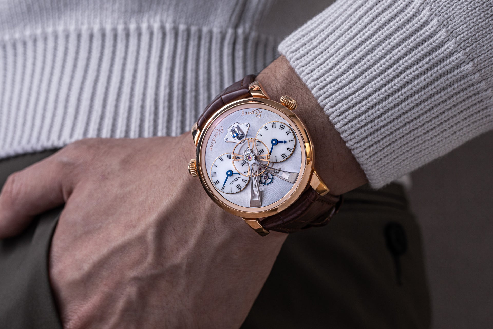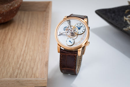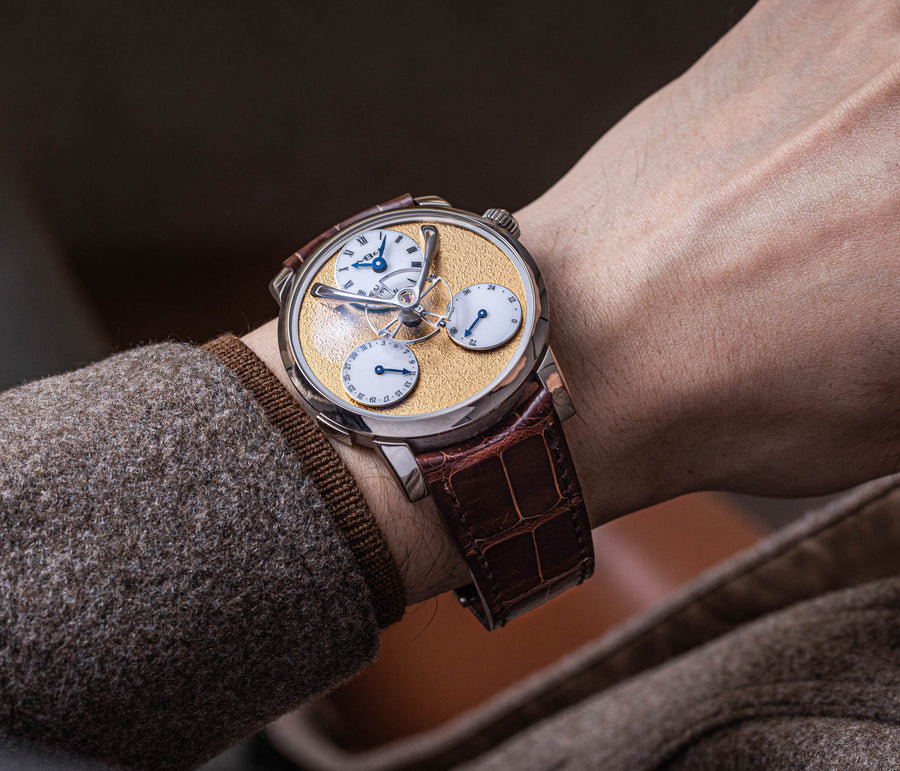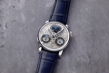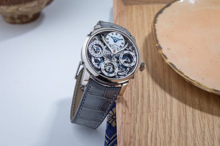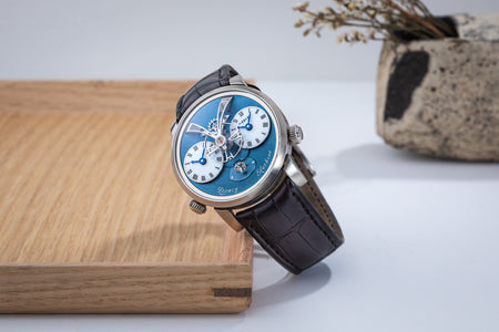 Featuring two time zones on white-lacquered dials modelled on enamel dials, the LM1 is powered by a movement that draws on vintage pocket watch calibres. Characterised by elegantly-formed bridges, the movement has its jewels sitting in gold chatons, and branding in italic script reminiscent of hand-engraved lettering.