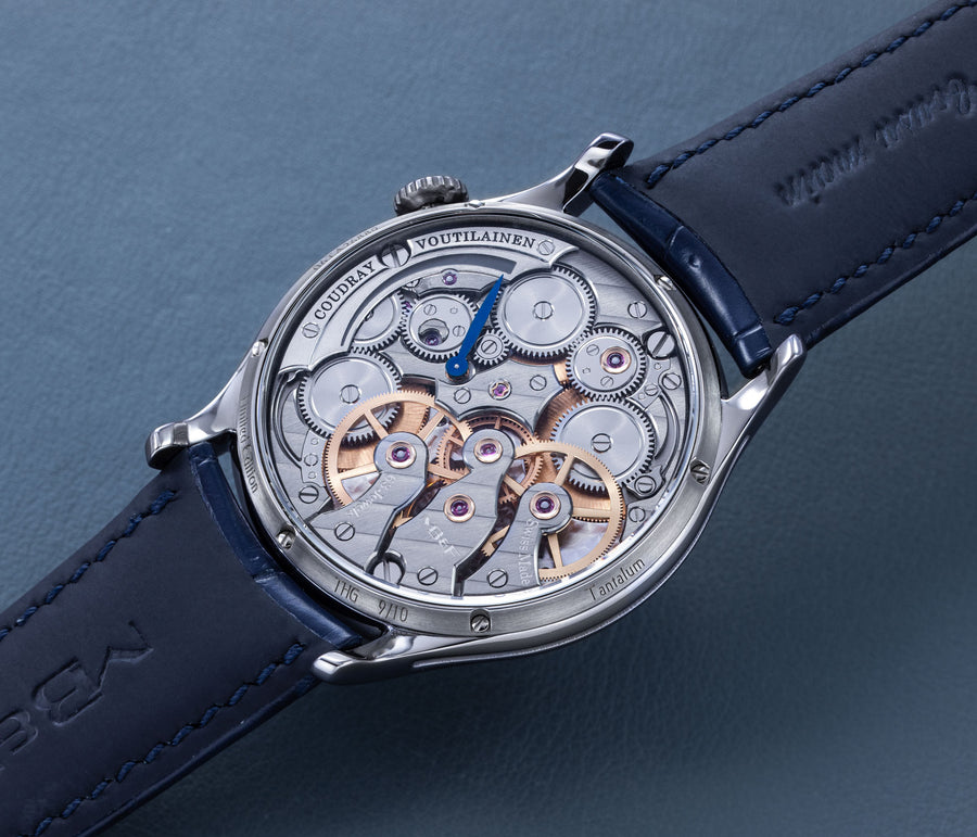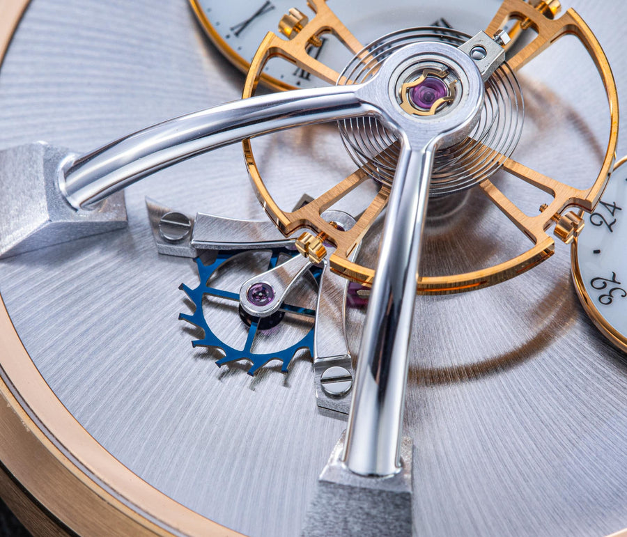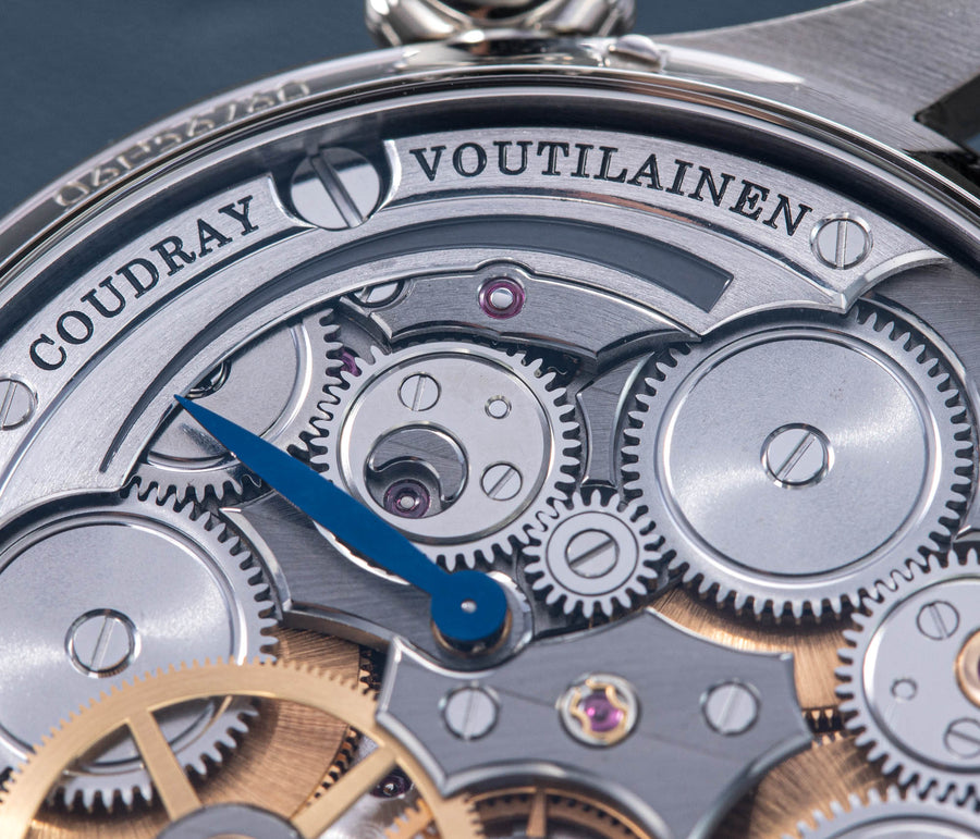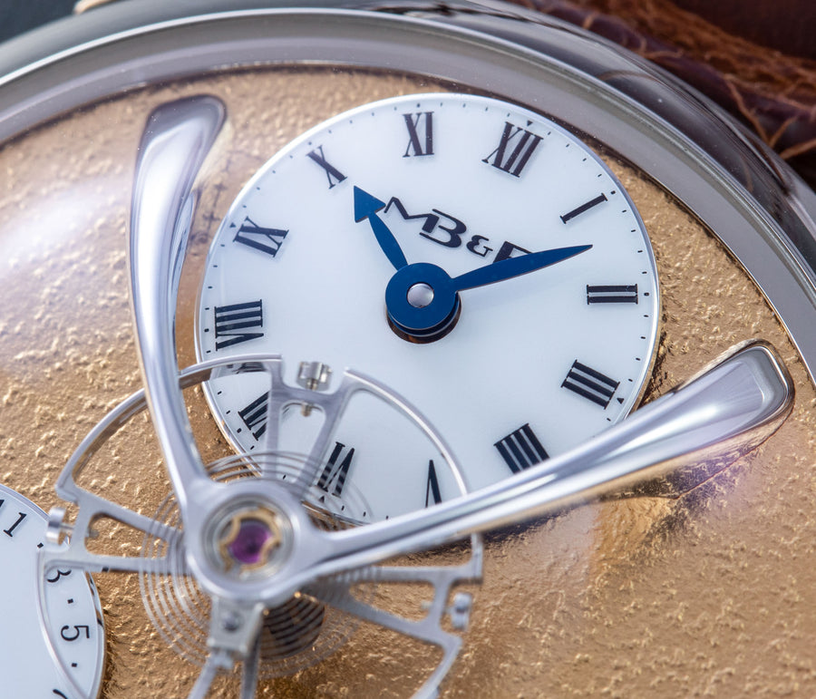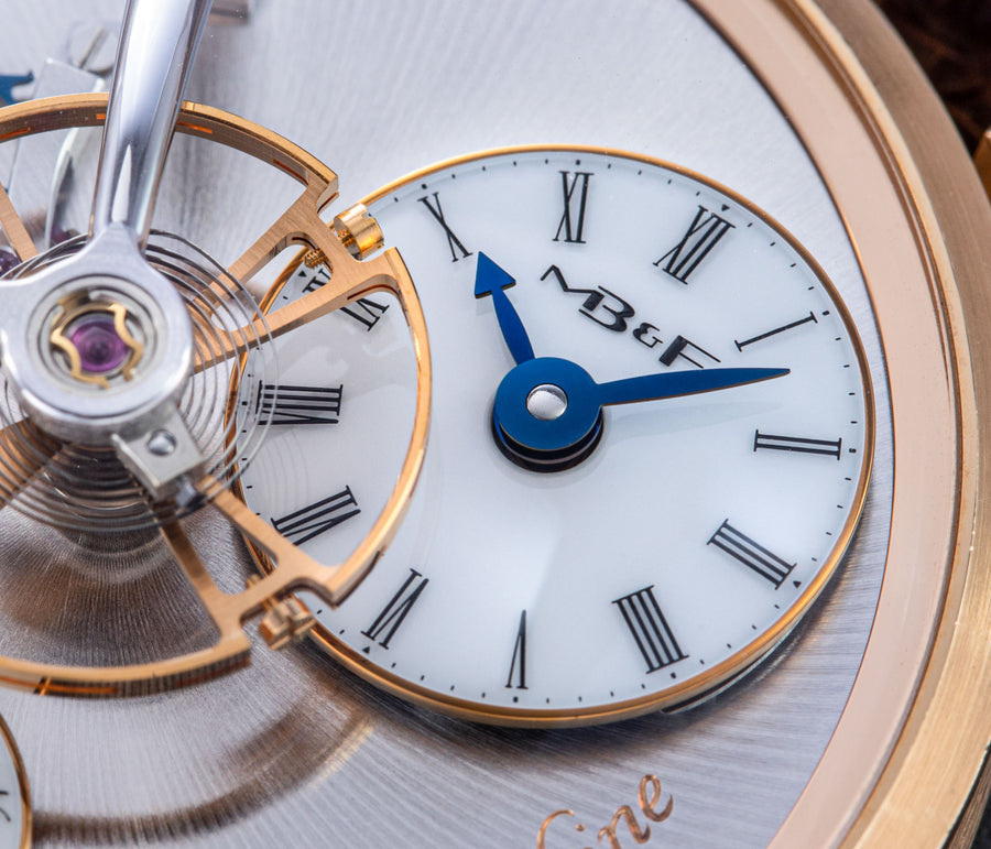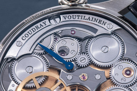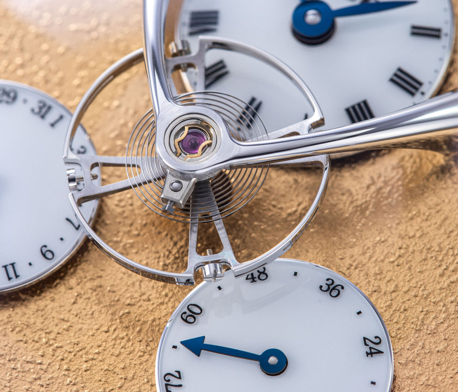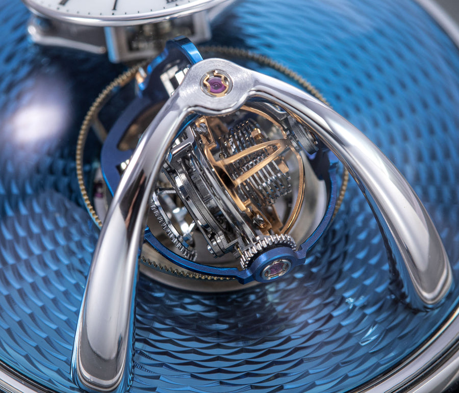 Conceived by Eric Coudray, who is best known for having invented the Gyrotourbillon while at Jaeger-LeCoultre, the tourbillon is made up of three cages that contain an unusual, dome-shaped balance wheel that accommodates tall, cylindrical hairspring, similar in shape to those found in marine chronometers of old.