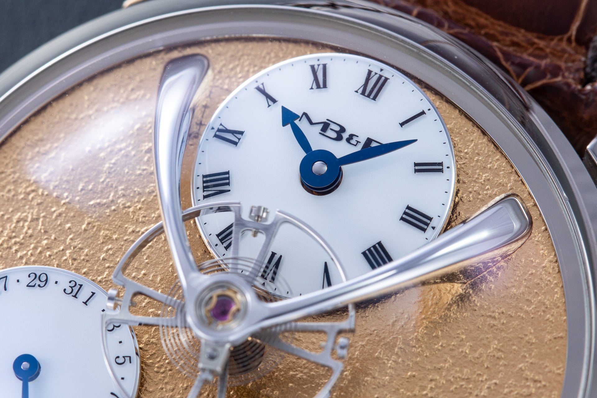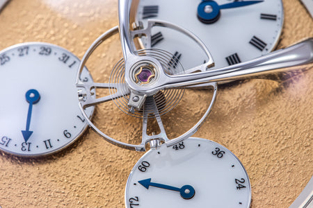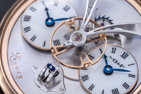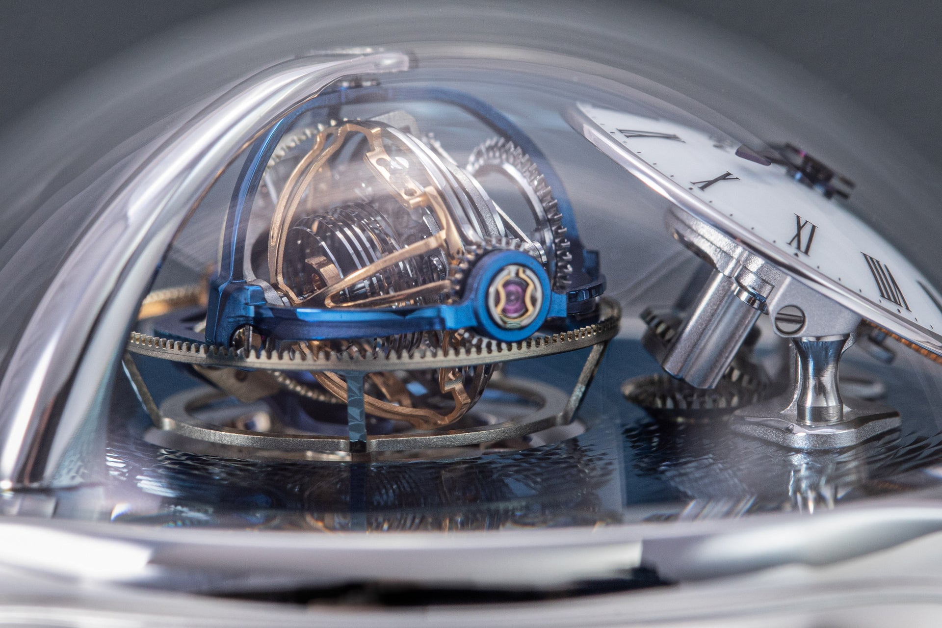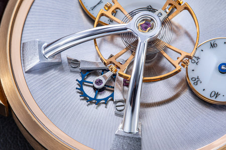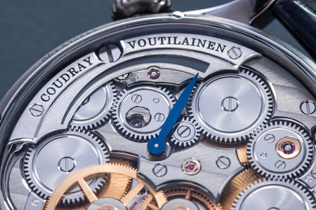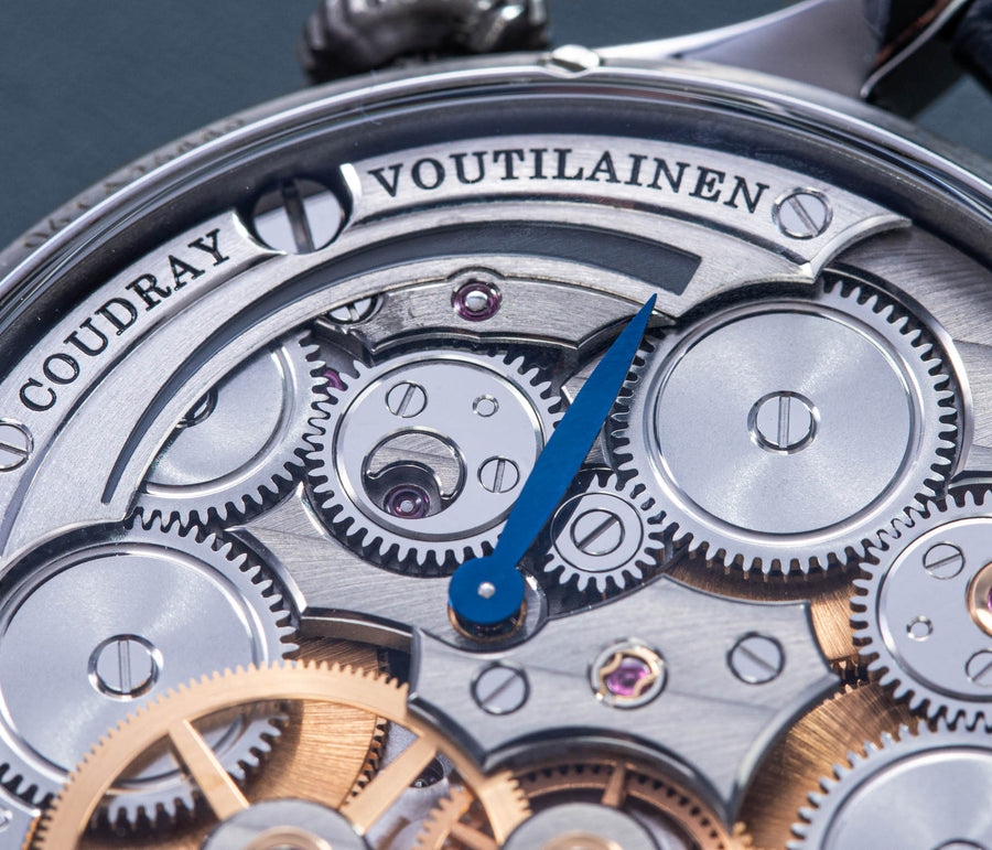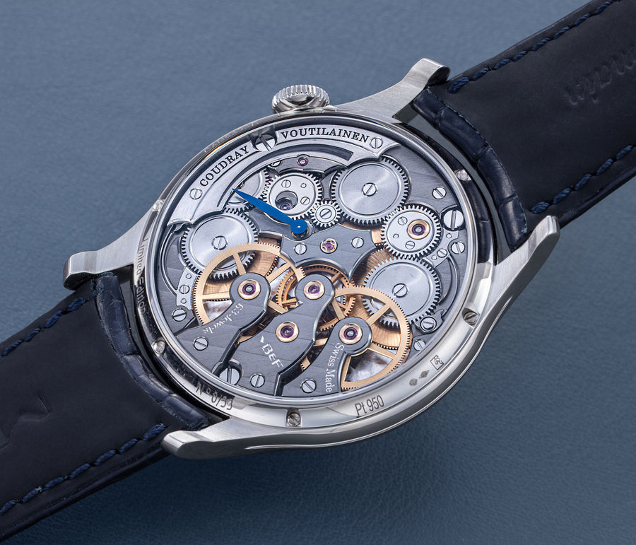 Conceived by Eric Coudray, who is best known for having invented the Gyrotourbillon while at Jaeger-LeCoultre, the tourbillon is made up of three cages that contain an unusual, dome-shaped balance wheel that accommodates tall, cylindrical hairspring, similar in shape to those found in marine chronometers of old.