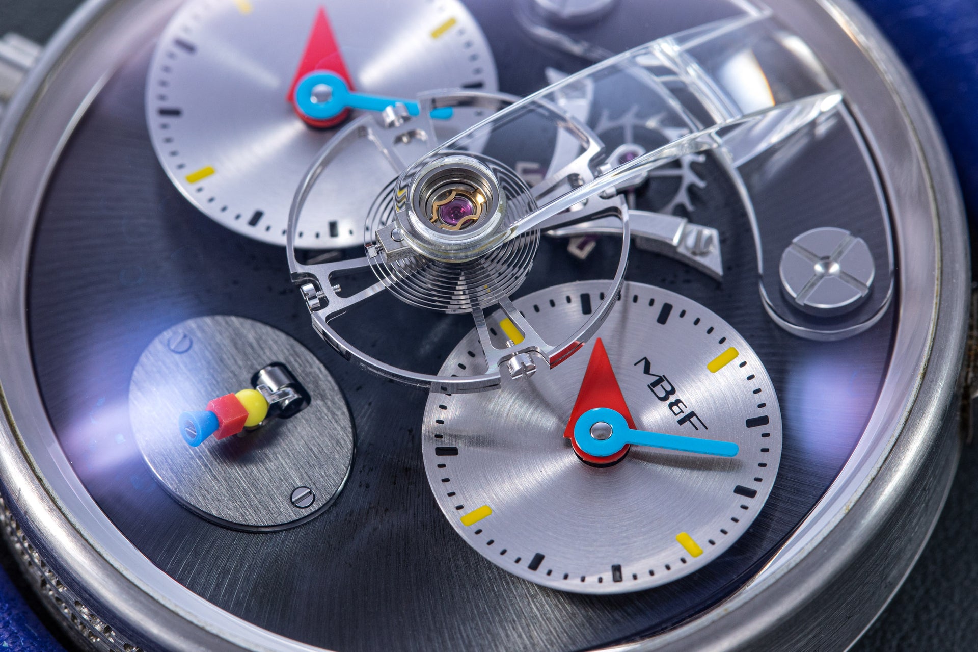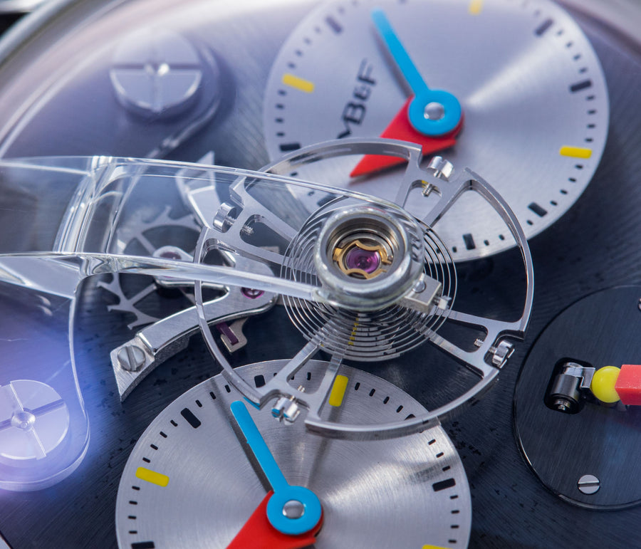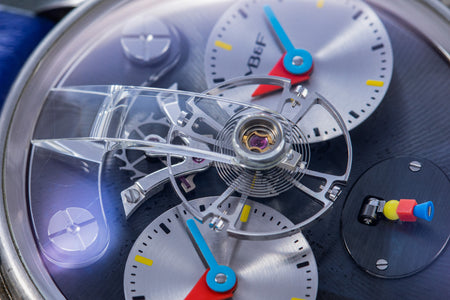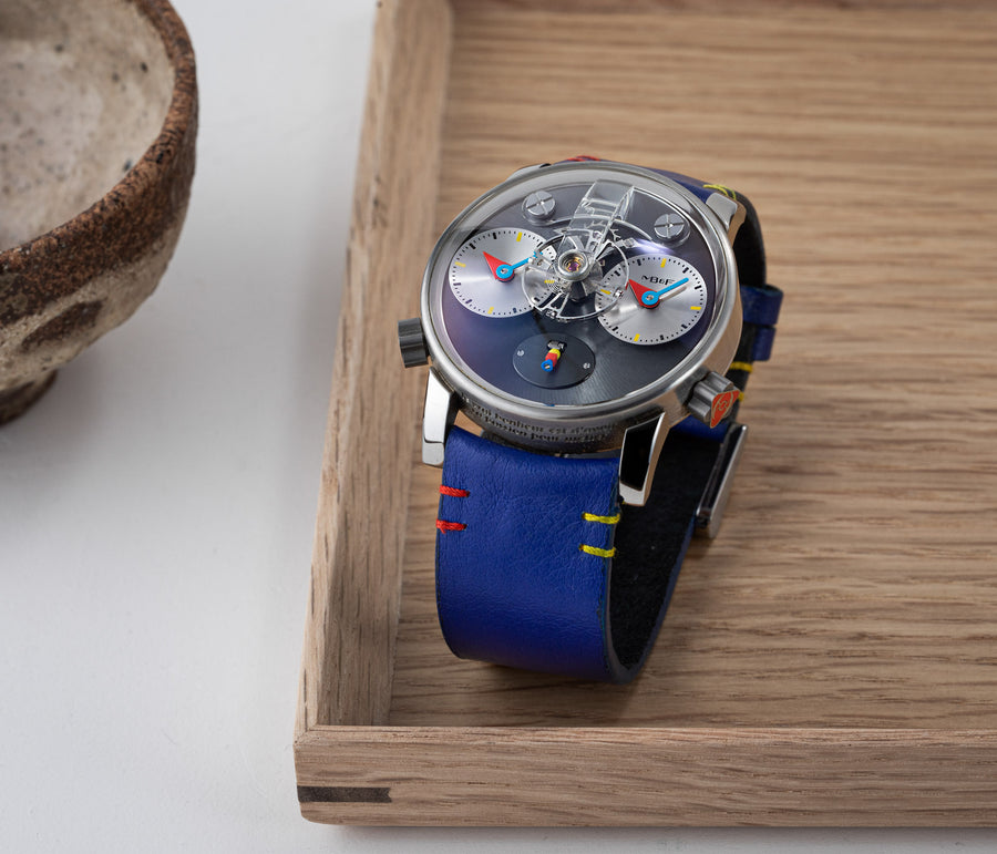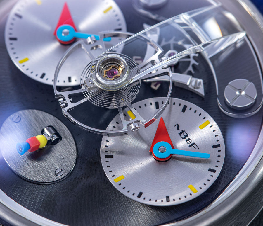 Another partnership was between MB&F and Alain Silberstein, the watch designer whose heyday in the 1990s saw him become a leading maker of desirable timepieces with quirky, whimsical styling. Silberstein facelifted the LM1 to give it his signature look, incorporating geometric shapes in the hands and balance bridge, and also the primary colours of red, blue, and yellow, resulting in a watch instantly recognisable as an LM1, but also a Silberstein creation.
