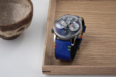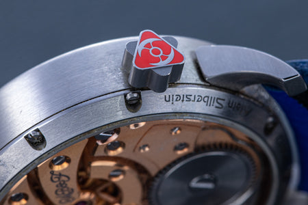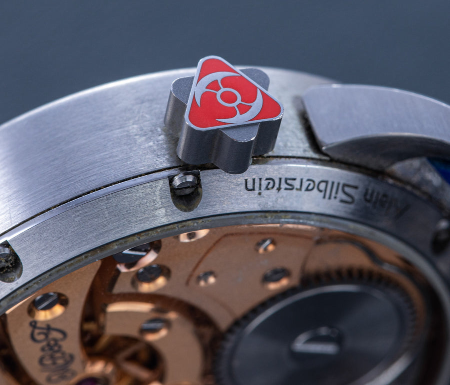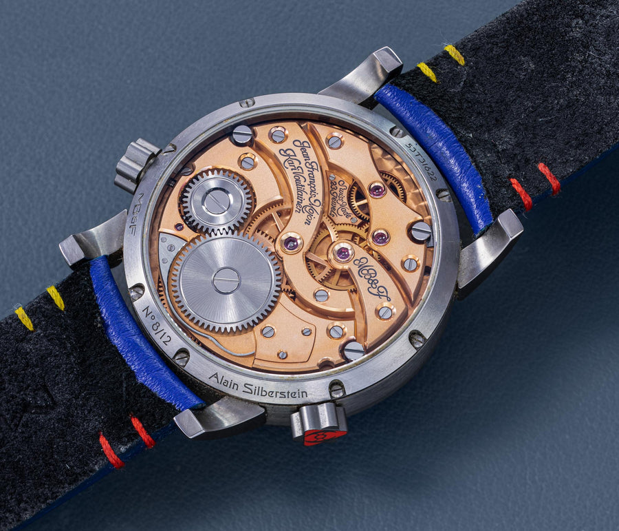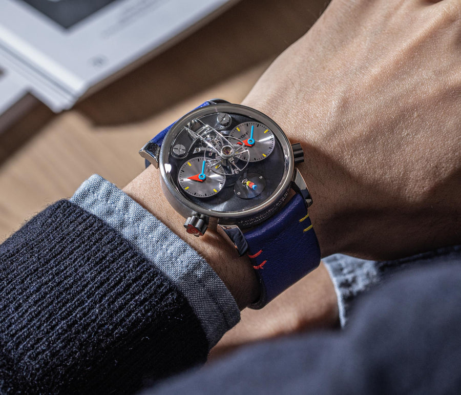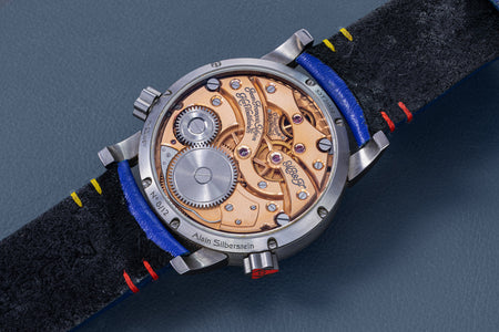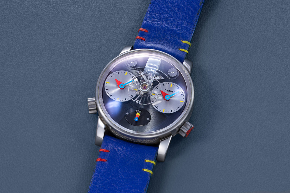 Another partnership was between MB&F and Alain Silberstein, the watch designer whose heyday in the 1990s saw him become a leading maker of desirable timepieces with quirky, whimsical styling. Silberstein facelifted the LM1 to give it his signature look, incorporating geometric shapes in the hands and balance bridge, and also the primary colours of red, blue, and yellow, resulting in a watch instantly recognisable as an LM1, but also a Silberstein creation.