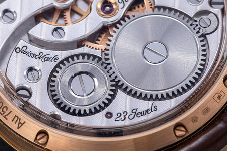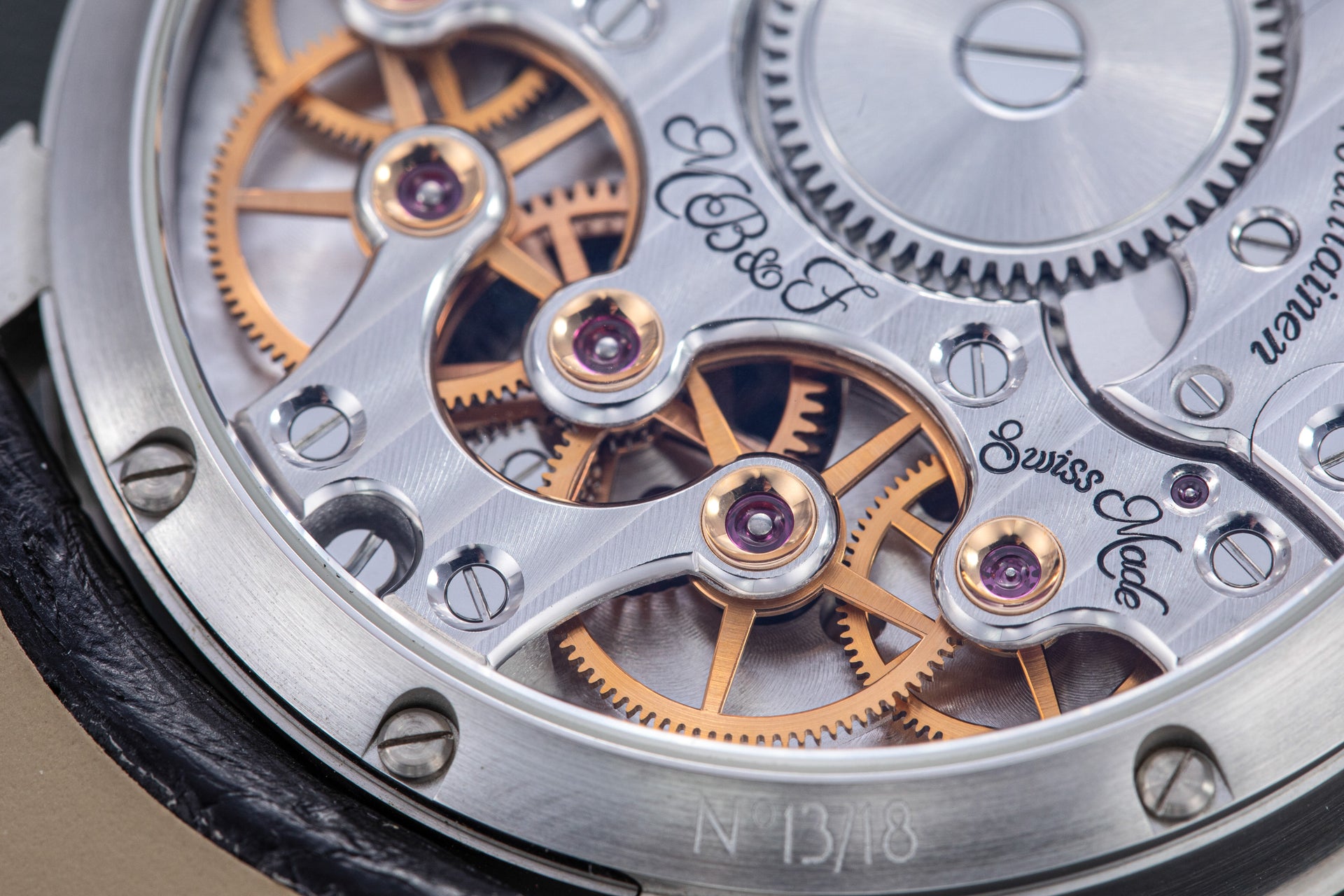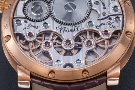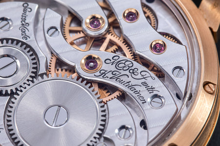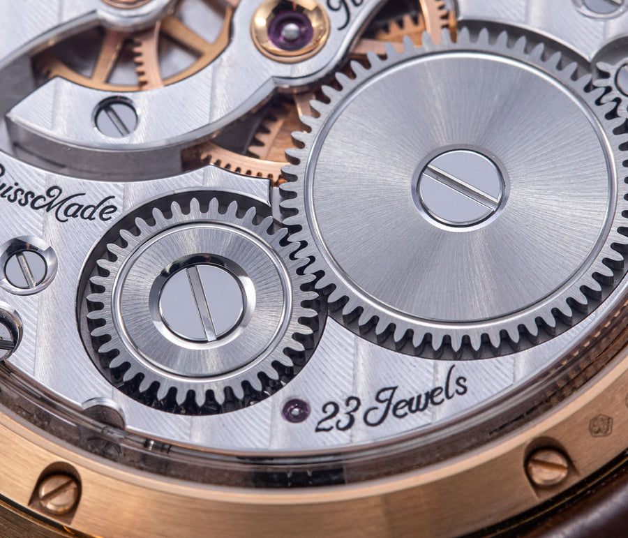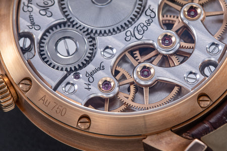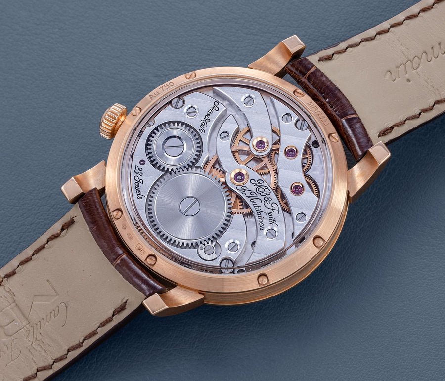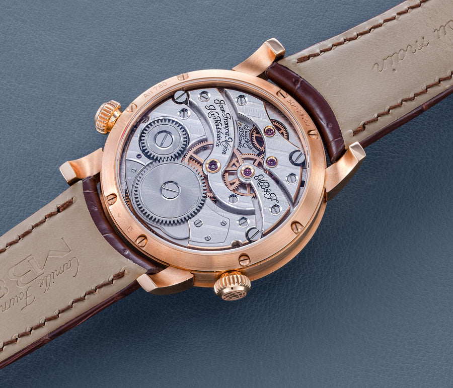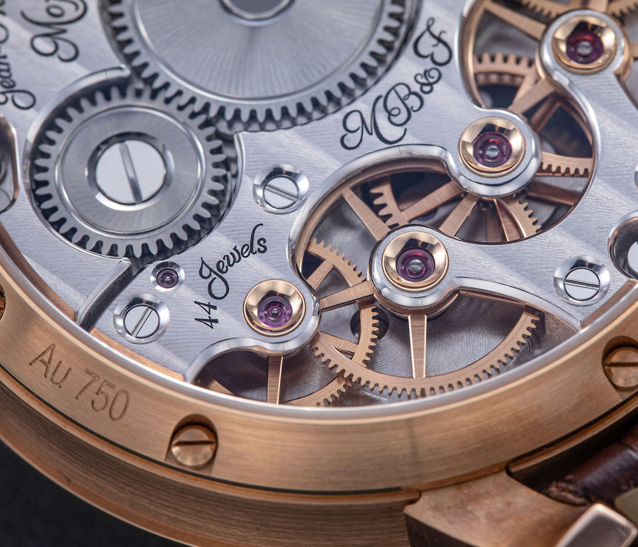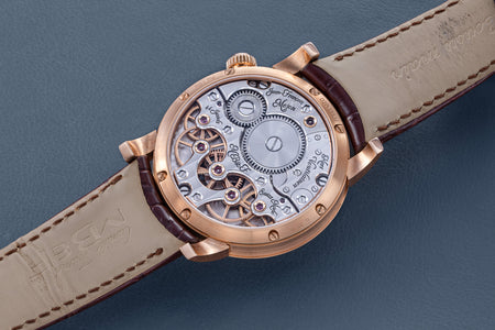 The reverse of the LM2 echoes the symmetry of its front, with the going train visible in between two elegantly shaped bridges, both having large jewels in gold chatons. All of the movement components are decorated in a style typical of the LM series, with wide, polished bevels along the edges of the bridges along with polished countersinks for the screws.