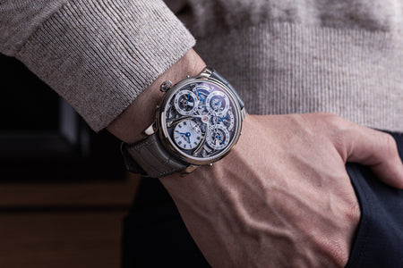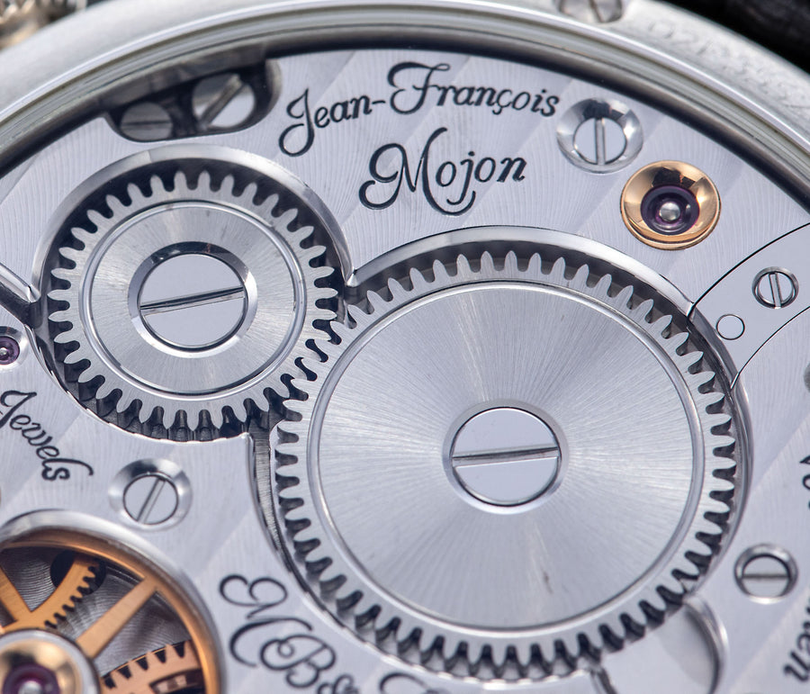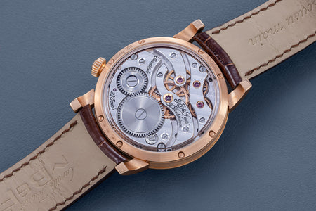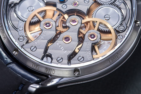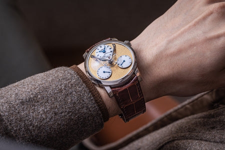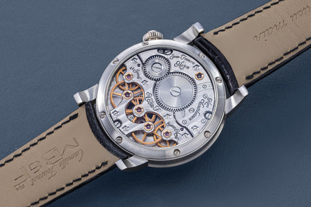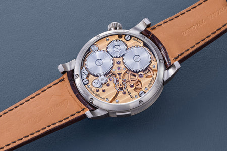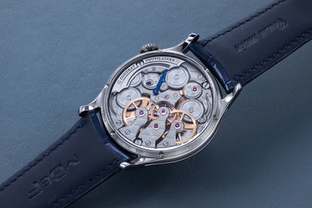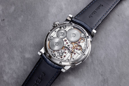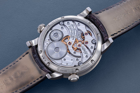 Unusual amongst the LM series for having an asymmetrical face, the LM101 is the simplest and smallest model in the line-up, indicating only the hours, minutes, and power reserve. But it is executed as elaborately as its more complex cousins, having the same white-lacquered registers on a frosted dial, along with the oversized balance wheel secured by a polished steel bridge. Reminiscent of the movement in the LM1, the calibre within is similar inspired by the aesthetics of 19th century pocket watch movements. The bridges have graceful outlines, along with details like polished, bevelled edges and generously-spaced Cotes de Geneve.
