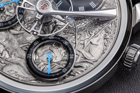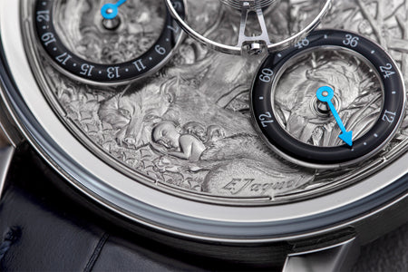 The LM Split Escapement x Eddy Jaquet 2024 series represents a compelling chapter in MB&F’s ongoing dialogue between mechanical artistry and cultural expression. Realised in collaboration with the Swiss master engraver, each of the eight watches serves as a canvas for narrative scenes drawn from seminal works of literature. This includes popular favourites like The Jungle Book, as pictured below. in The white gold dials—engraved entirely by hand—are framed within stainless steel cases. At the same time, the movement was developed by Stephen McDonnell, and it conceals its escapement beneath the dial, allowing the balance wheel to appear suspended in motion.