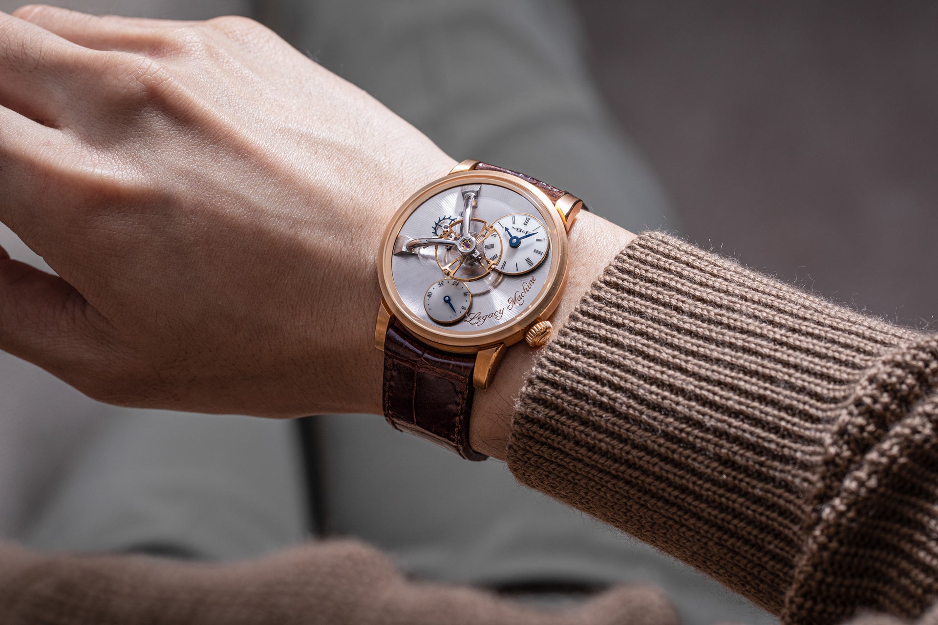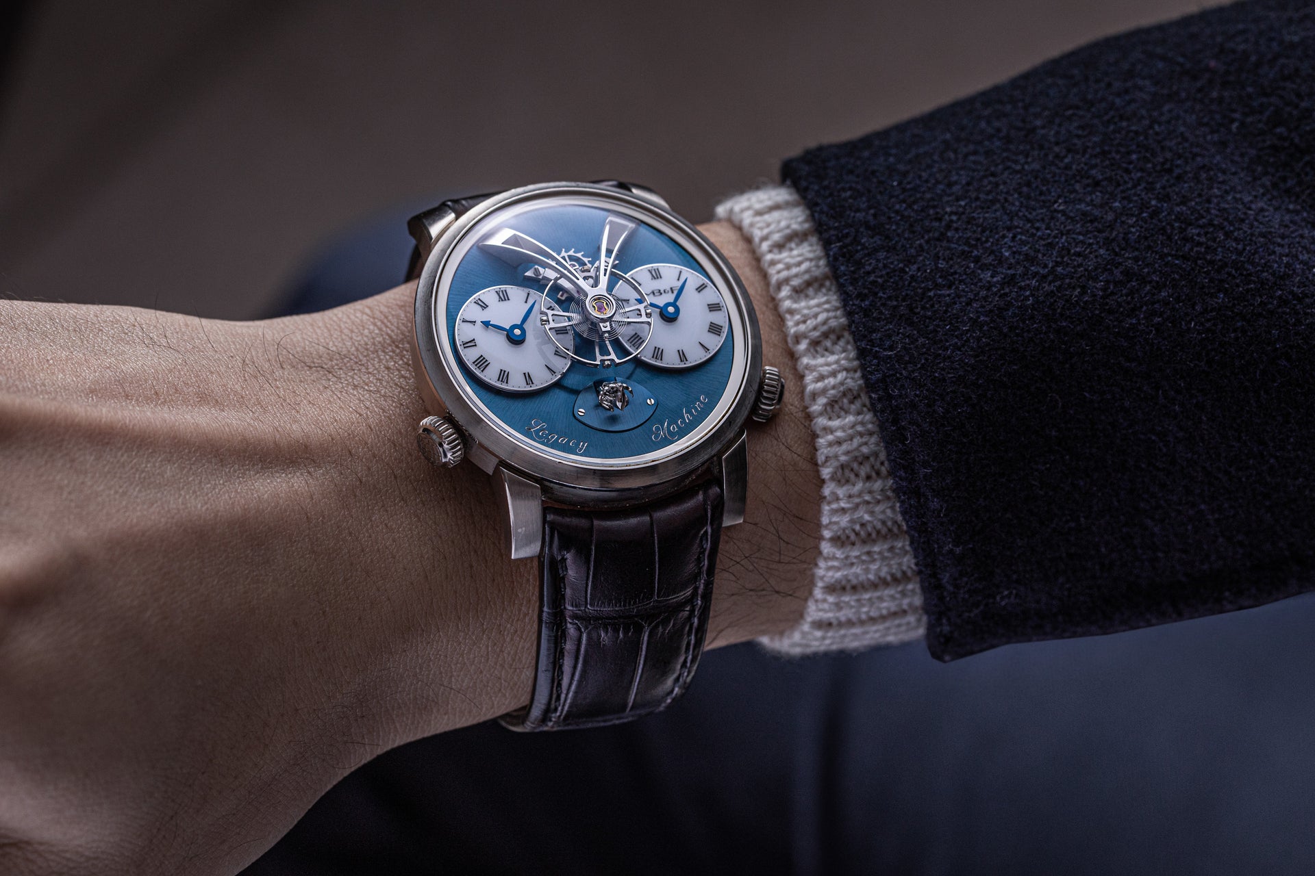 One of the more complex Legacy Machines, the LM2 has double balance wheels visible front and centre. Each secured by a V-shaped, steel bridge with polished and rounded arms, the balance wheels are oversized in the typical style of the LM series. They are connected by a differential, which averages the rate of both balances, resulting in a time displayed that’s the mean of the two.