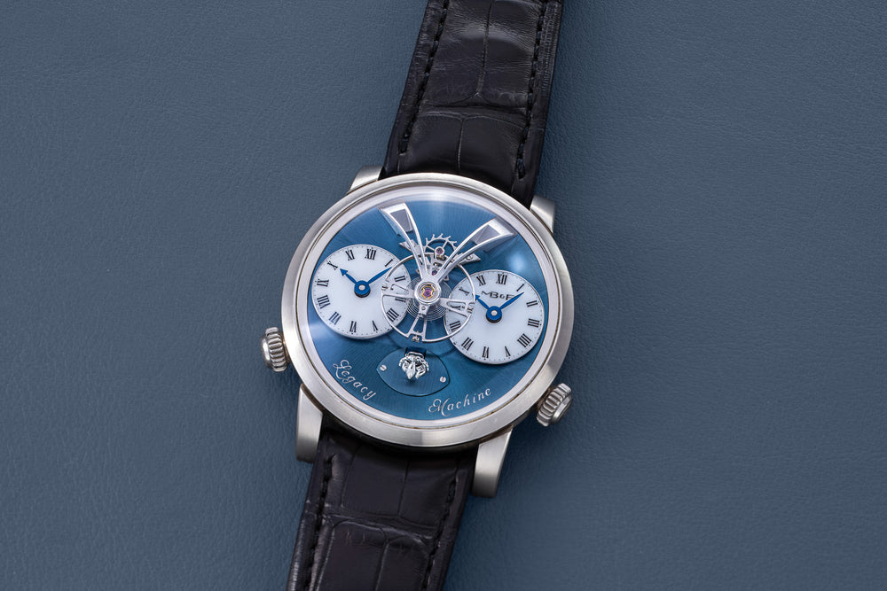 One of MB&F’s most complicated watches, the Legacy Machine Perpetual boasts a cleverly constructed perpetual calendar mechanism devised by Irish watchmaker Stephen McDonnell. Almost all of the perpetual calendar mechanism is visible on the dial, and unlike conventional perpetual calendars, it was designed to be robust and easy to set.