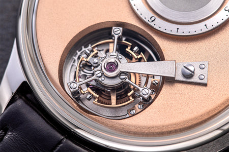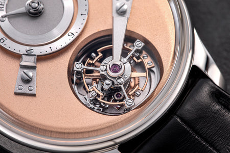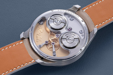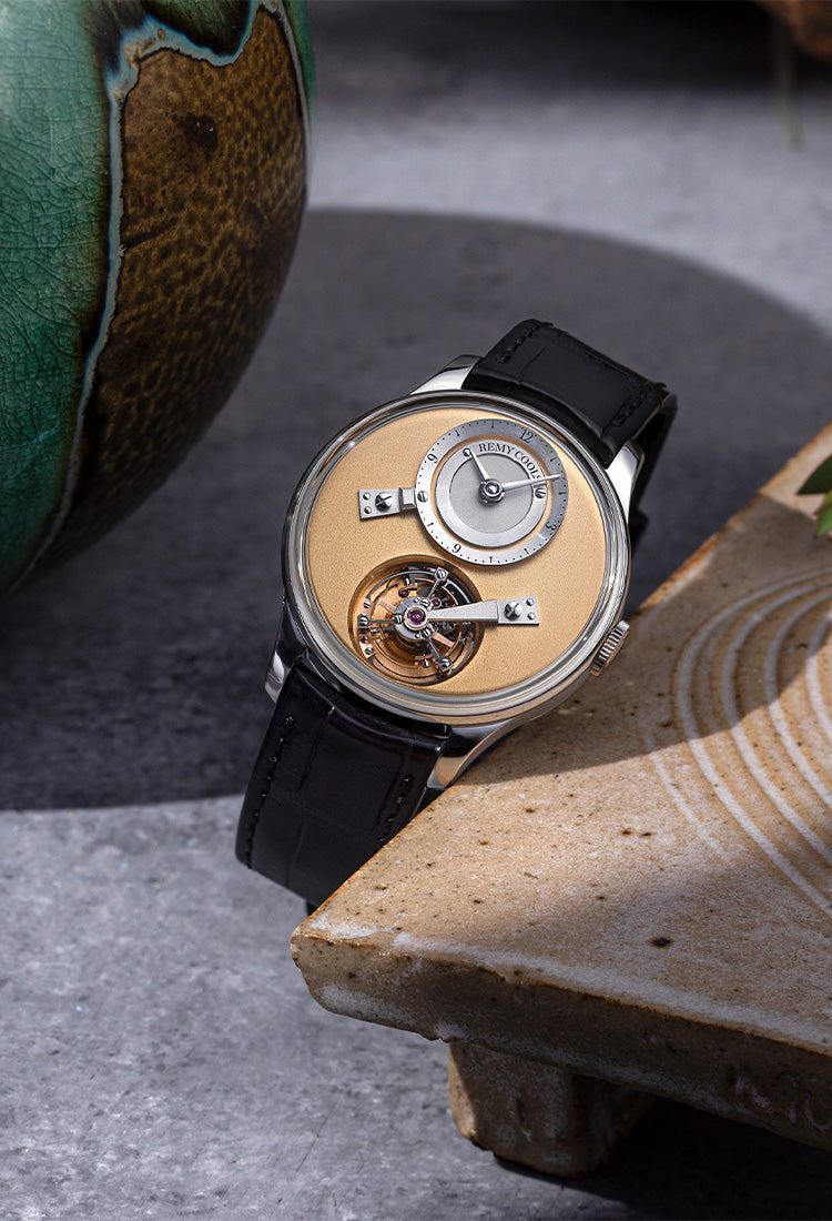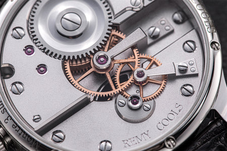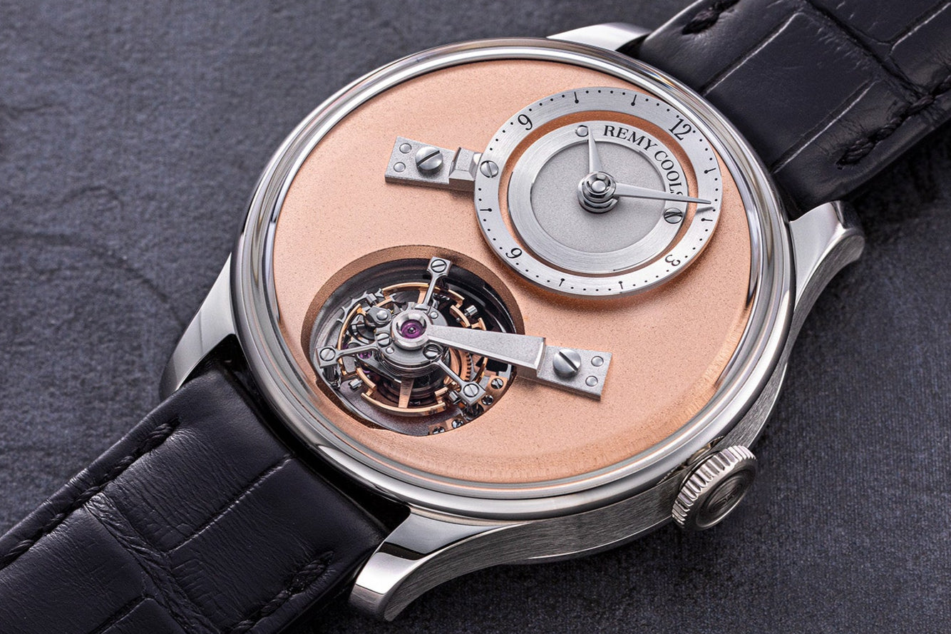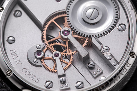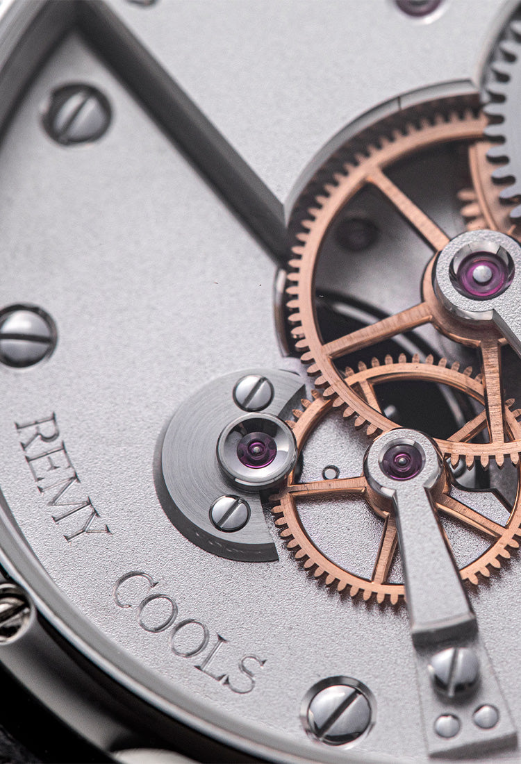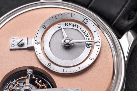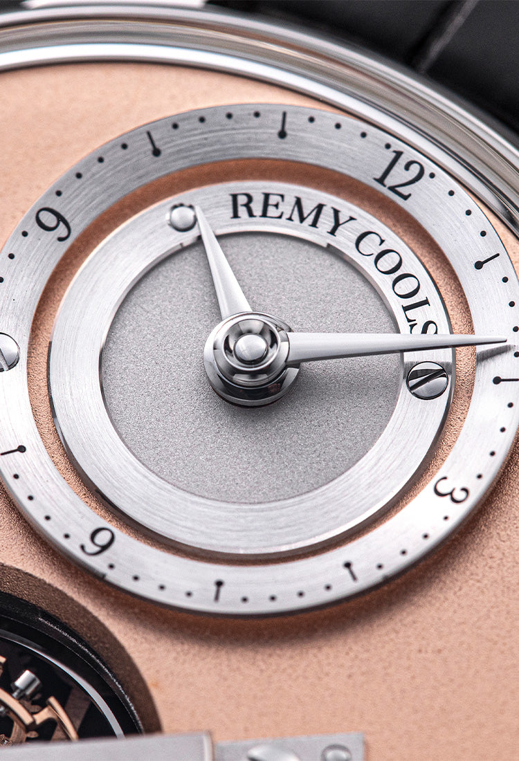 The Rémy Cools Tourbillon Atelier in Rose Gold exemplifies fine independent watchmaking, blending traditional craftsmanship with contemporary refinement. Its polished rose gold case highlights the intricate, hand-finished details of the open-worked movement, where the tourbillon takes centre stage. Designed for precision, the watch showcases meticulous finishing—from brushed bridges to delicate anglage—creating a harmonious interplay of textures. Each detail reflects Remy Cools’ dedication to artisanal horology, offering a sophisticated yet immersive experience.
