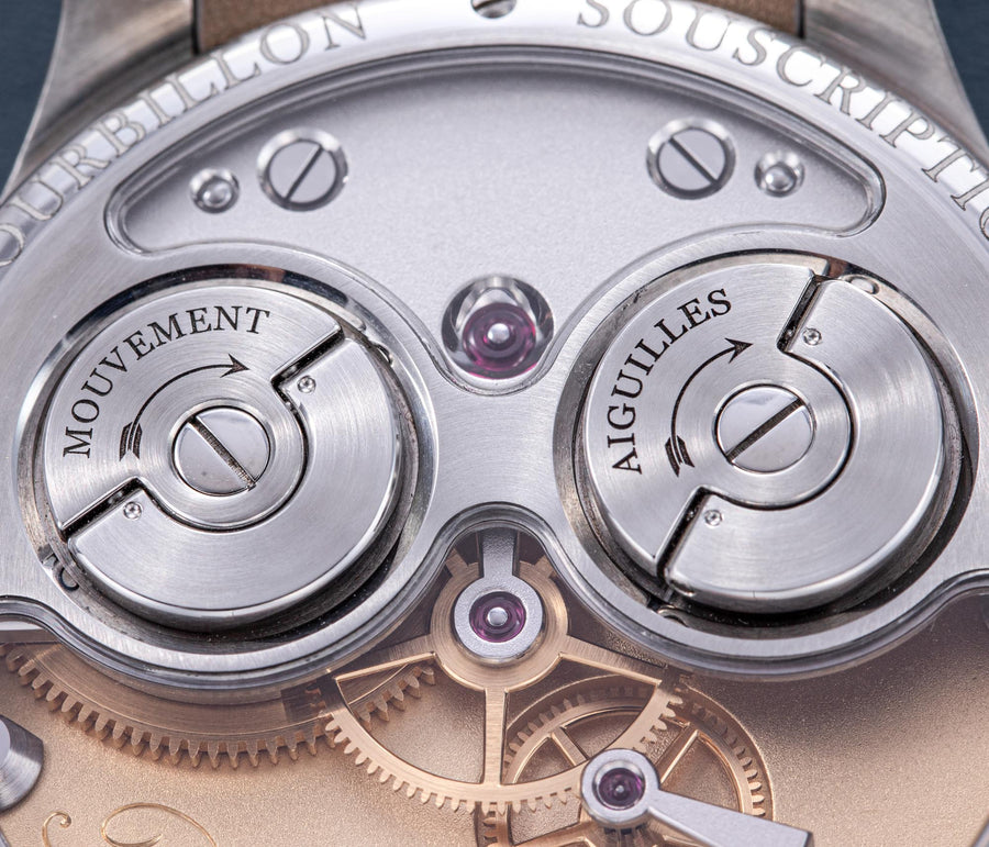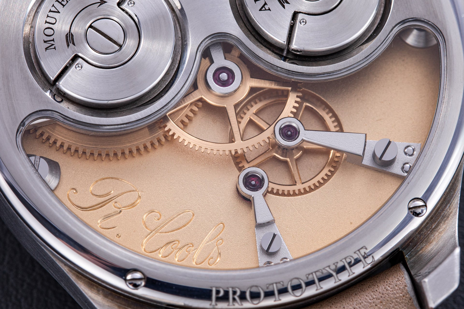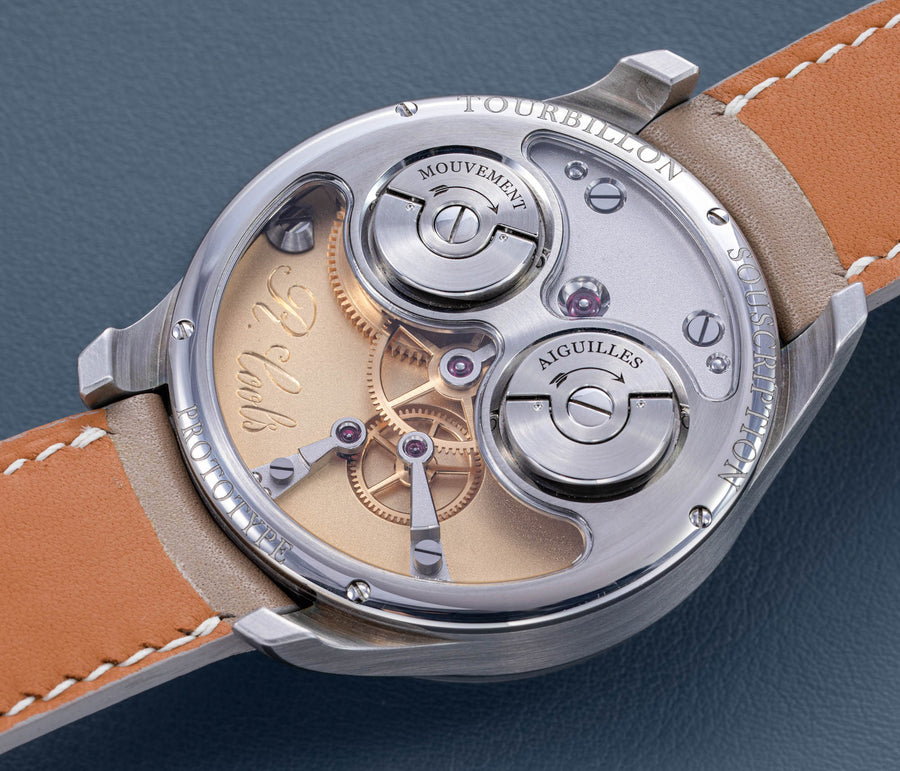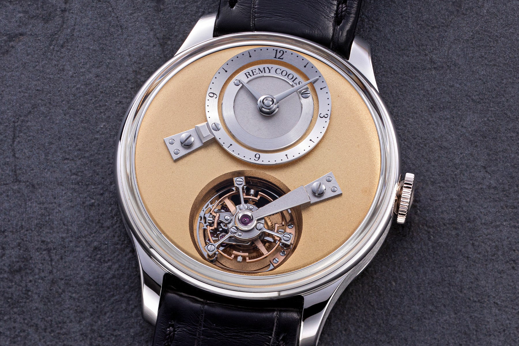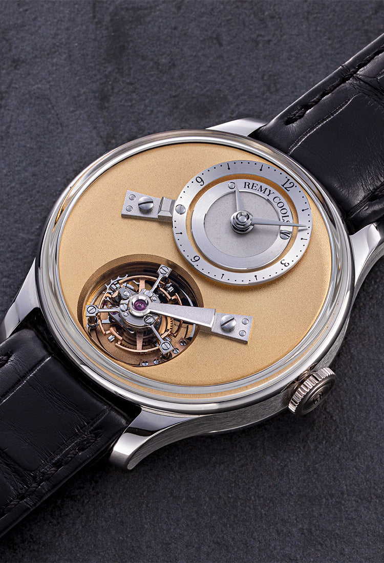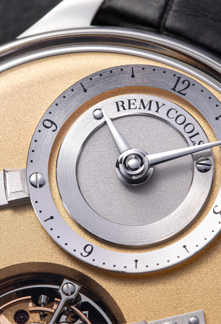 Like the clock, the Tourbillon Souscription features a tourbillon and an off-centre dial for the time that sit under a bulbous crystal to accommodate the architectural dial. The Tourbillon Souscription is made by Cools himself using traditional tools, with a good deal being fabricated by hand, as they would have been in the 19th century. Especially unusual is the lack of a crown; instead the watch is set and wound by two recessed tabs on the back of the case.