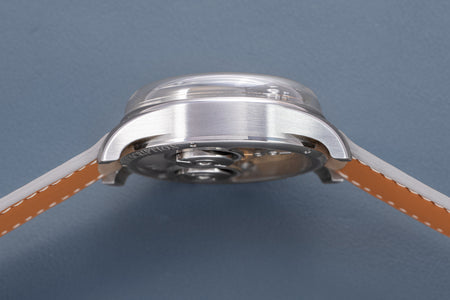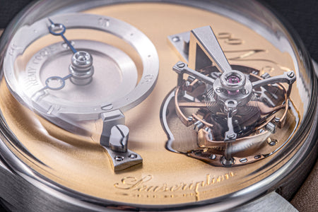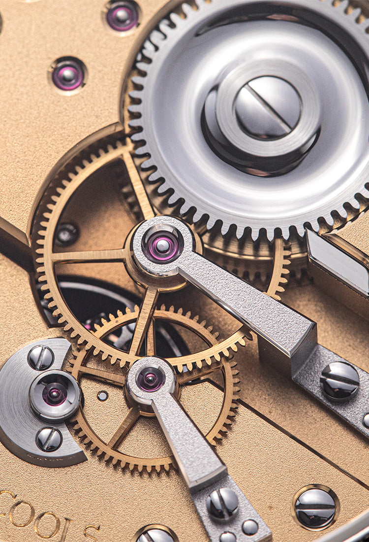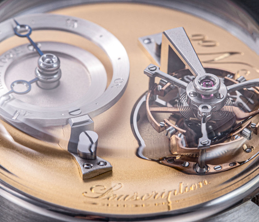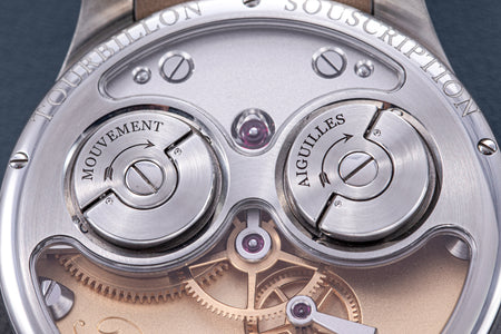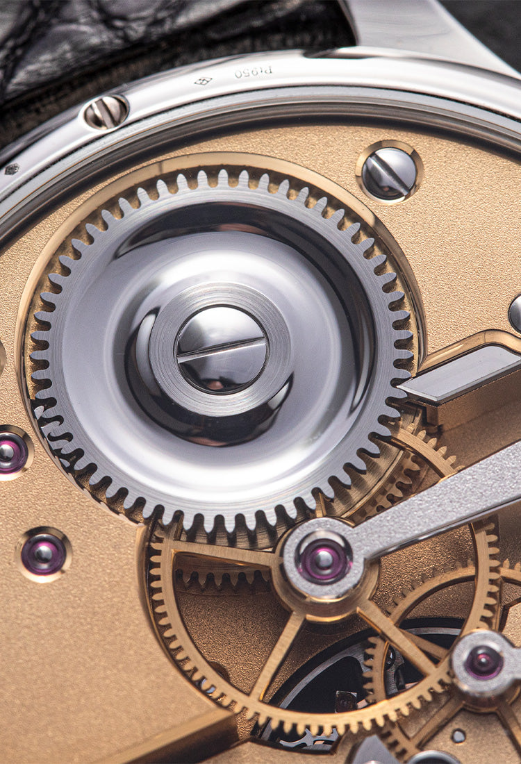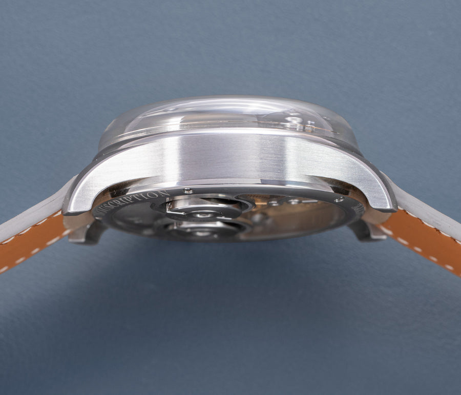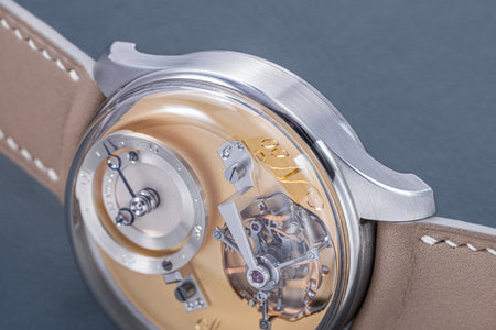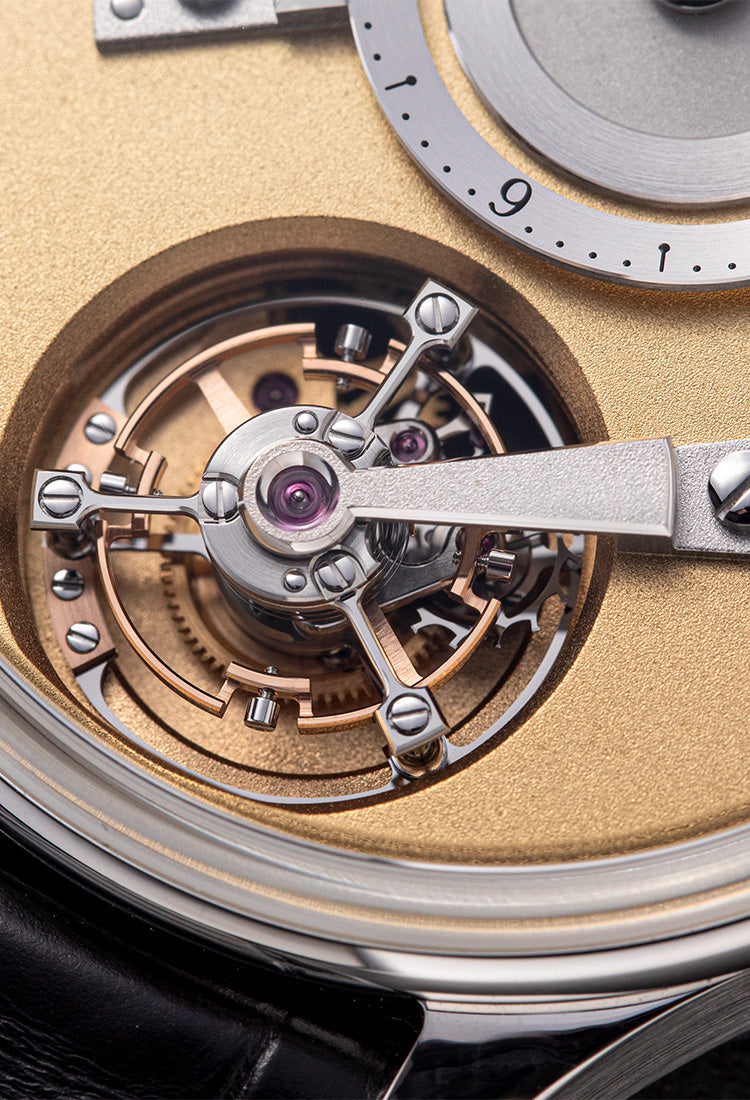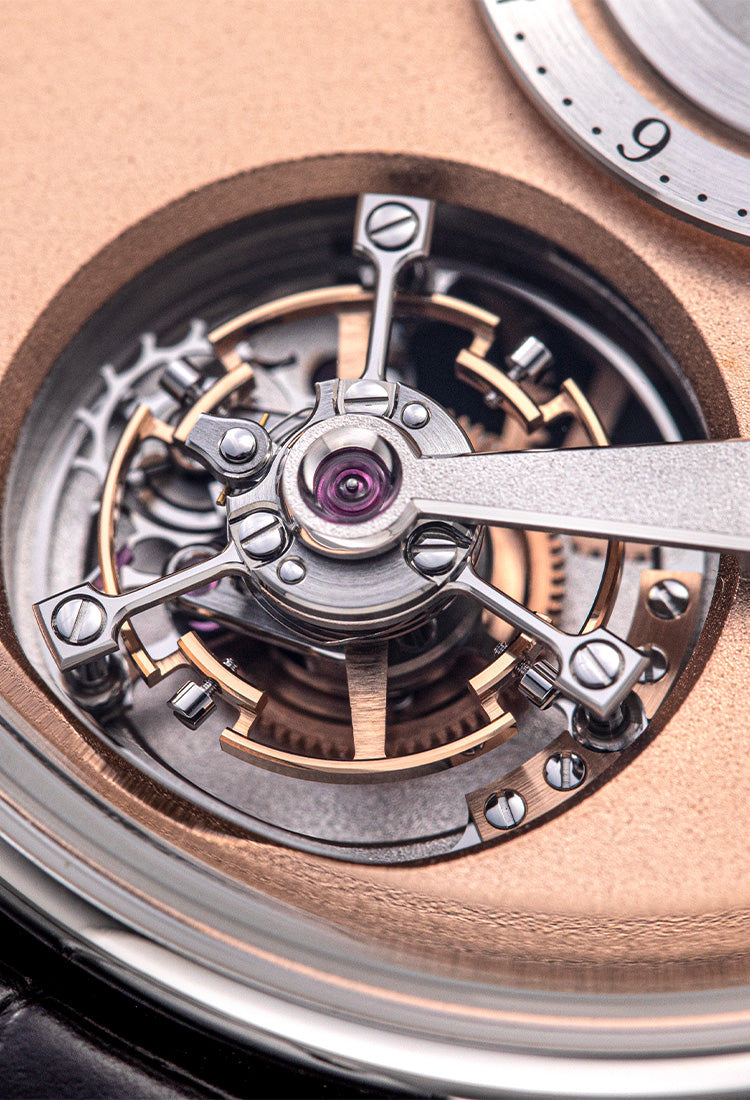 Like the clock, the Tourbillon Souscription features a tourbillon and an off-centre dial for the time that sit under a bulbous crystal to accommodate the architectural dial. The Tourbillon Souscription is made by Cools himself using traditional tools, with a good deal being fabricated by hand, as they would have been in the 19th century. Especially unusual is the lack of a crown; instead the watch is set and wound by two recessed tabs on the back of the case.